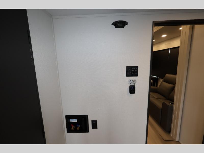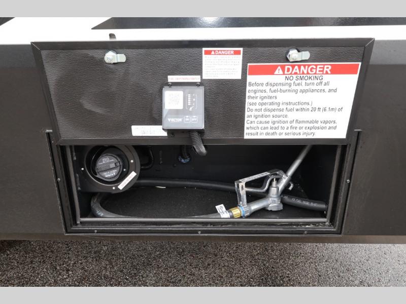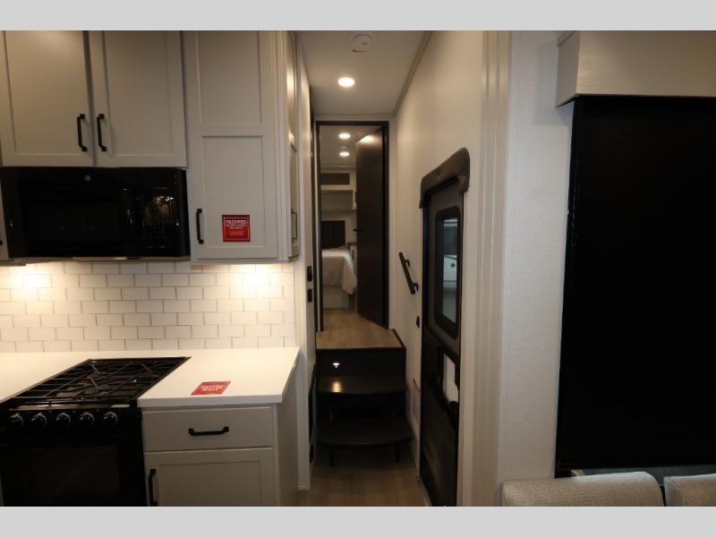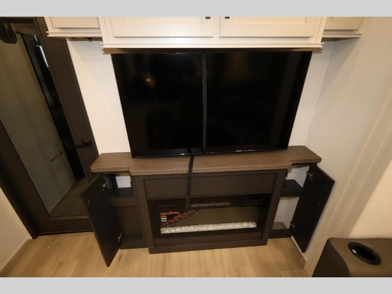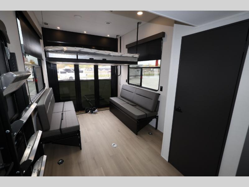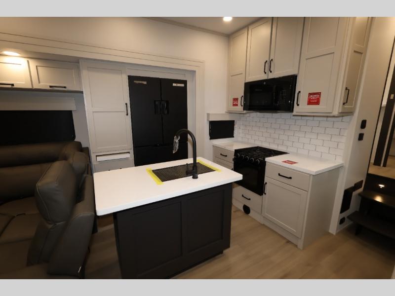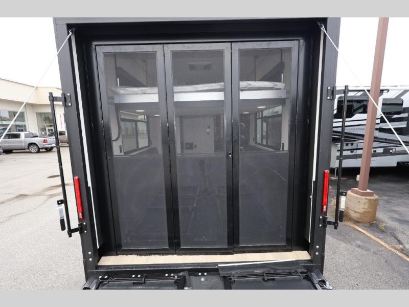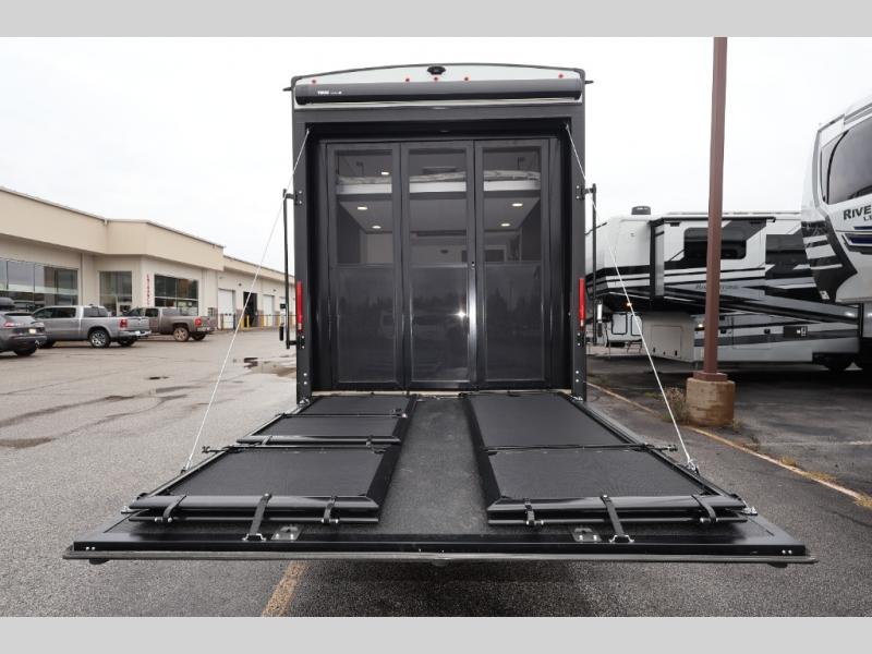A 15' separate garage in this toy hauler offers plenty of space for your off-road toys! You will appreciate the convenience of having a full bathroom with a walk-in shower and there is washer and dryer prep so you can accommodate these appliances. You will also appreciate the two entry doors, and flip-up pet dish. The rear ramp door can even be converted into a patio, plus there are exterior speakers to keep the party going. Everyone will love hanging out in the separate living area with a fireplace at the entertainment center, theater seating, and a sectional sofa. The fully equipped kitchen has everything you need to prepare delicious home cooked meals. The front private bedroom offers an escape to rest and relax on a queen bed for the next ride!