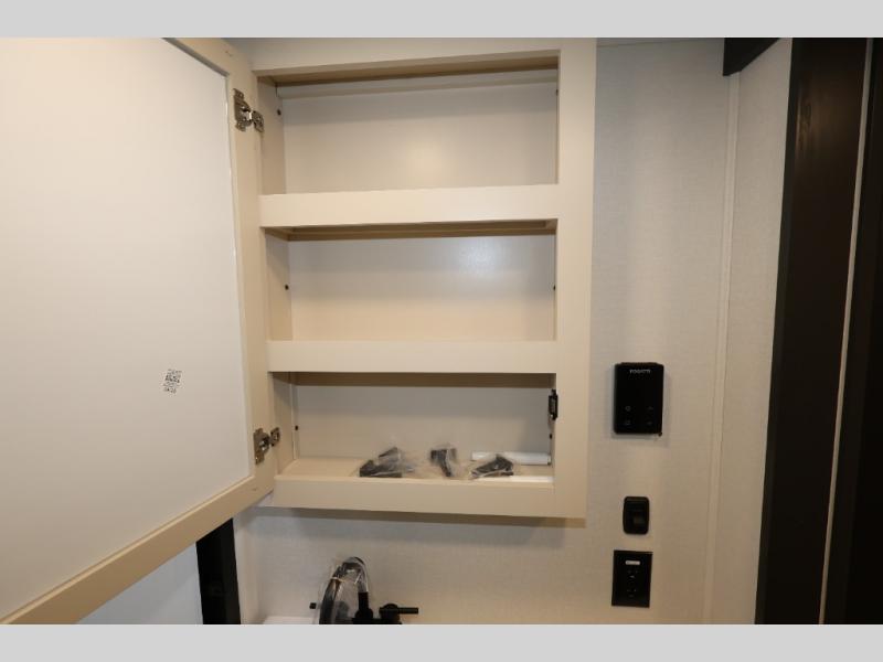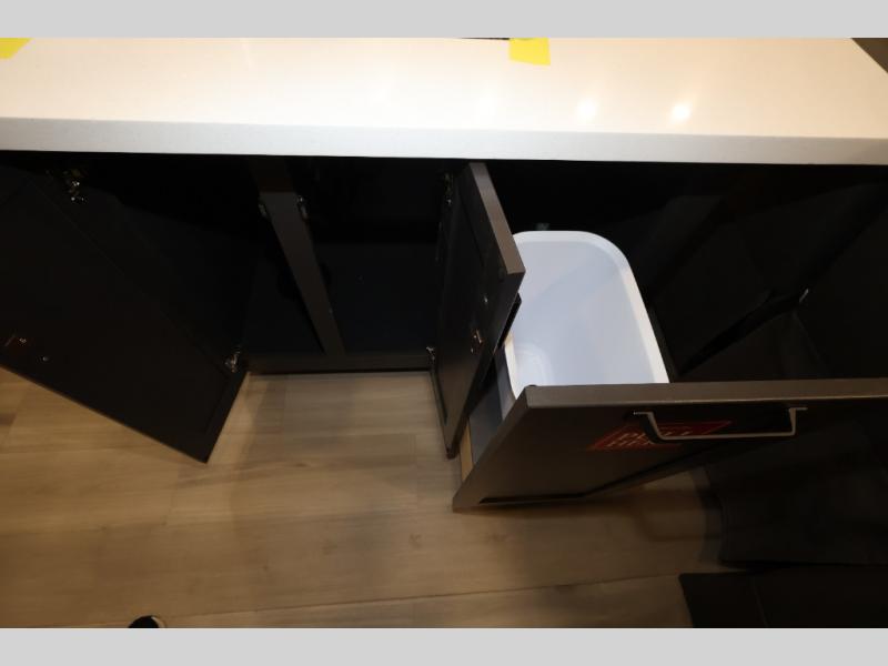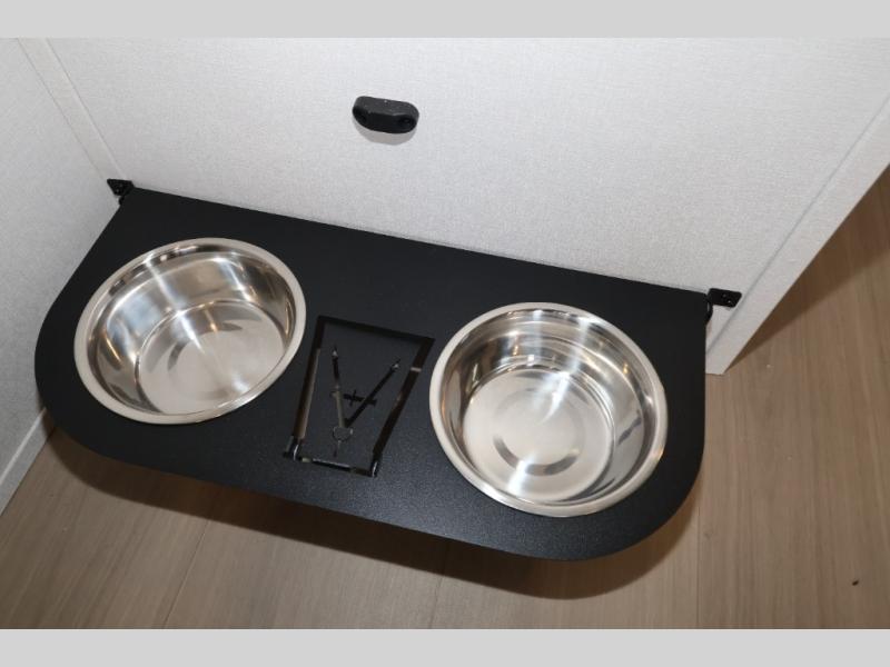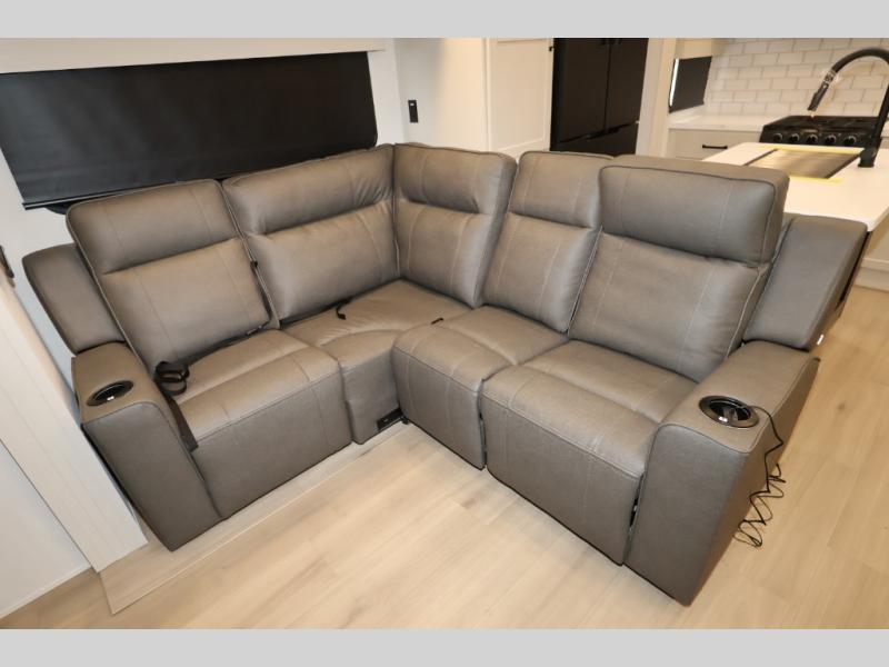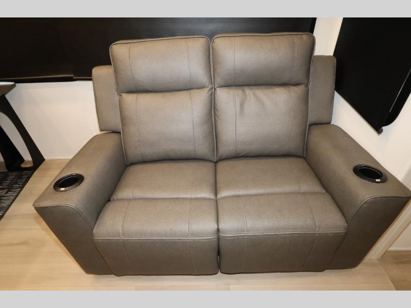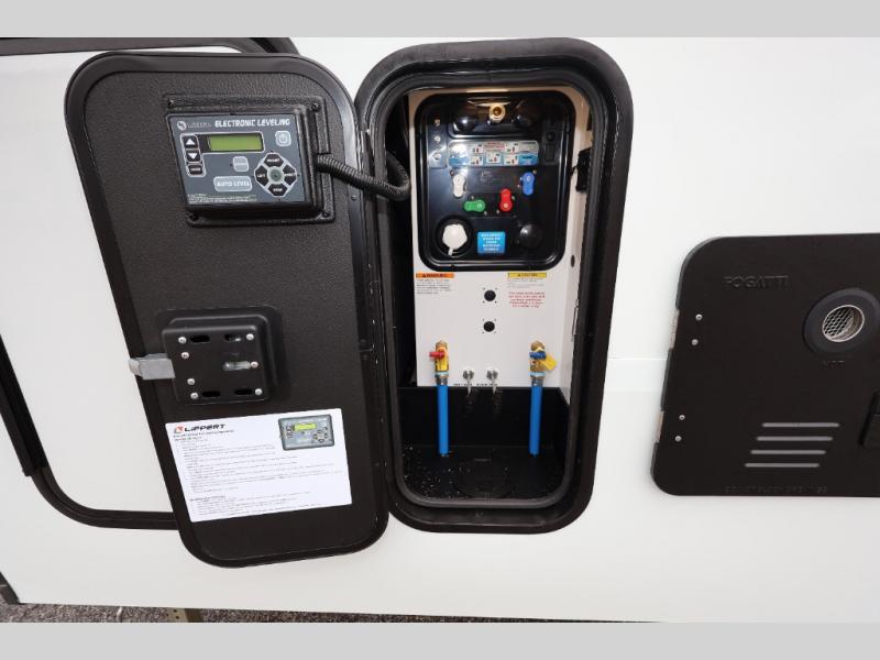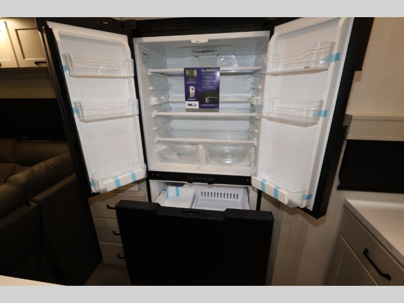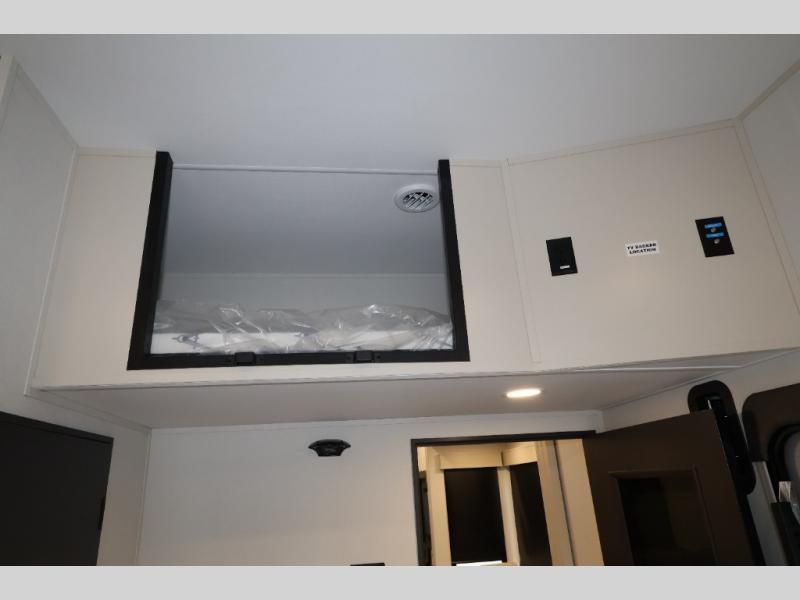 A 15' separate garage in this toy hauler offers plenty of space for your off-road toys! You will appreciate the convenience of having a full bathroom with a walk-in shower and there is washer and dryer prep so you can accommodate these appliances. You will also appreciate the two entry doors, and flip-up pet dish. The rear ramp door can even be converted into a patio, plus there are exterior speakers to keep the party going. Everyone will love hanging out in the separate living area with a fireplace at the entertainment center, theater seating, and a sectional sofa. The fully equipped kitchen has everything you need to prepare delicious home cooked meals. The front private bedroom offers an escape to rest and relax on a queen bed for the next ride!