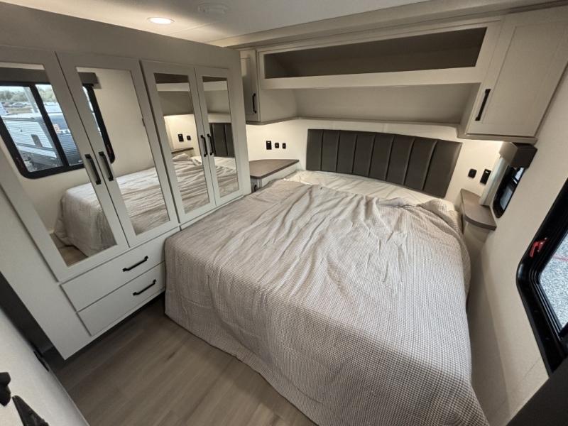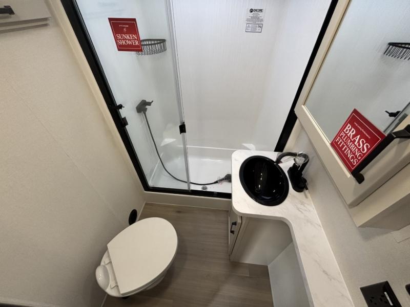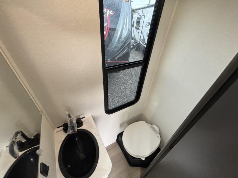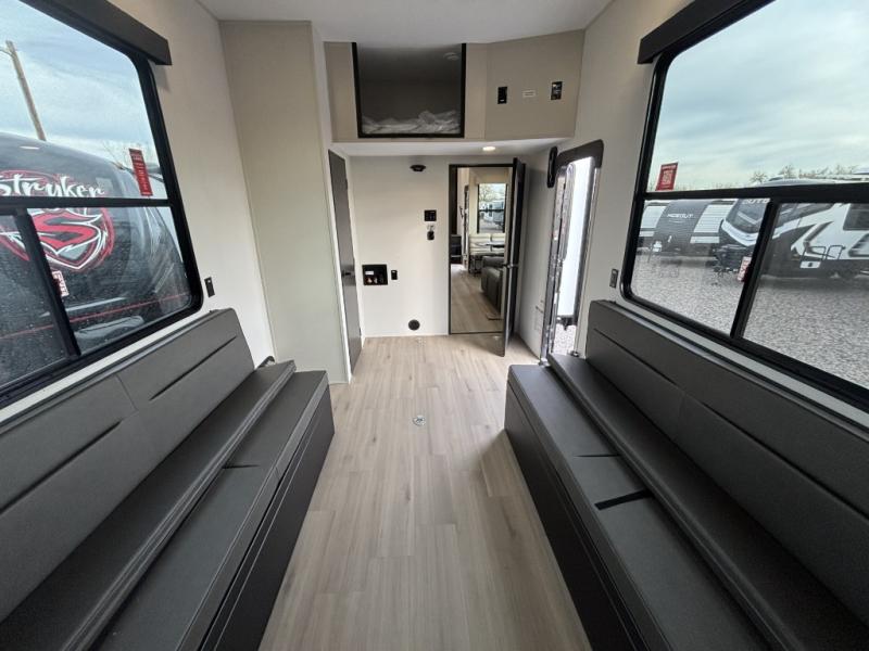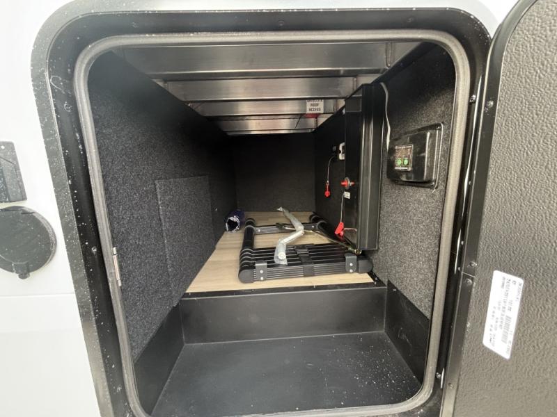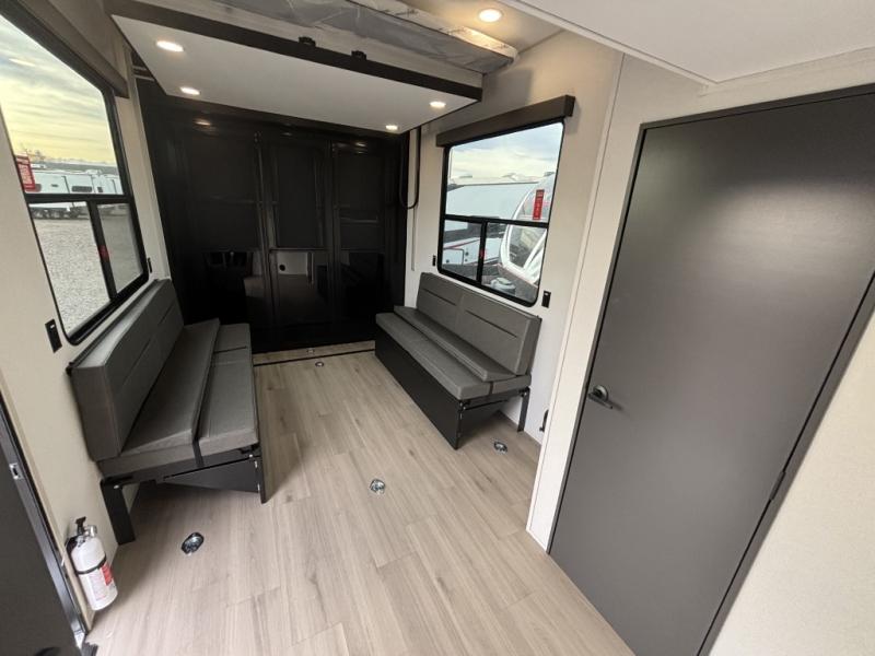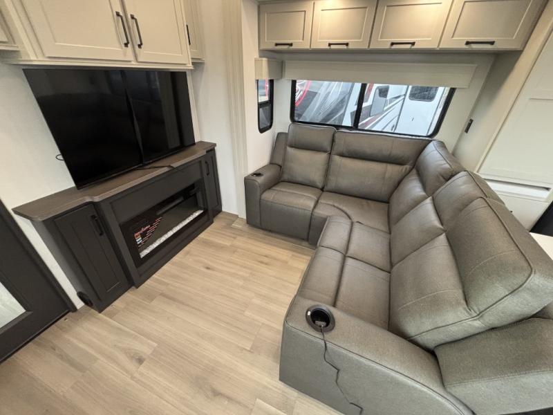 A 15' separate garage in this toy hauler offers plenty of space for your off-road toys! You will appreciate the convenience of having a full bathroom with a walk-in shower and there is washer and dryer prep so you can accommodate these appliances. You will also appreciate the two entry doors, and flip-up pet dish. The rear ramp door can even be converted into a patio, plus there are exterior speakers to keep the party going. Everyone will love hanging out in the separate living area with a fireplace at the entertainment center, theater seating, and a sectional sofa. The fully equipped kitchen has everything you need to prepare delicious home cooked meals. The front private bedroom offers an escape to rest and relax on a queen bed for the next ride!