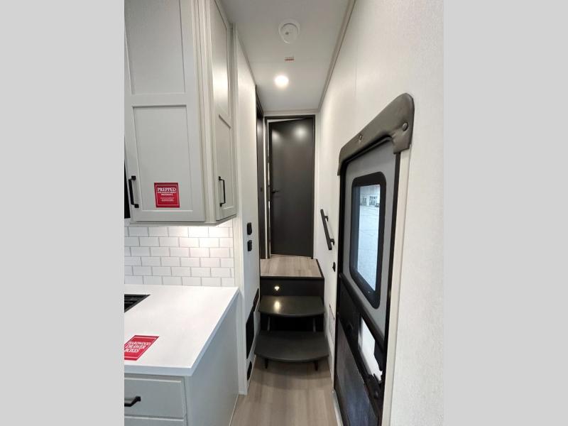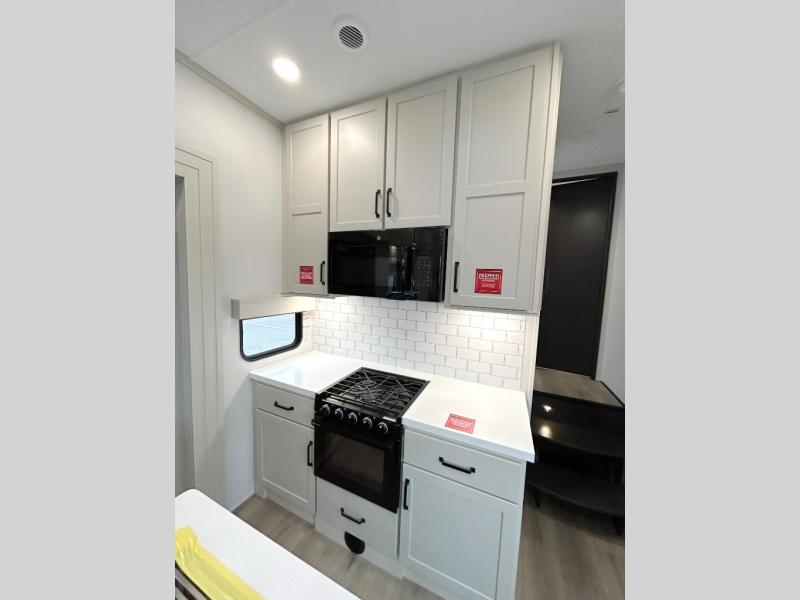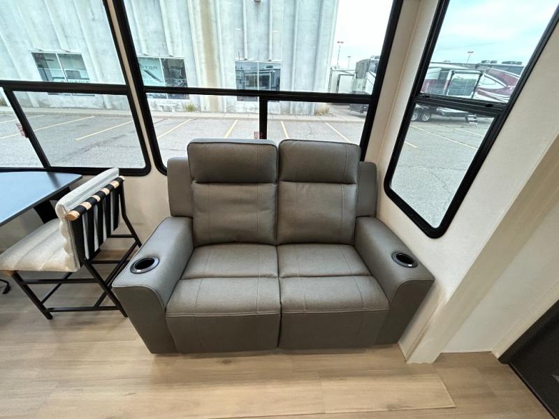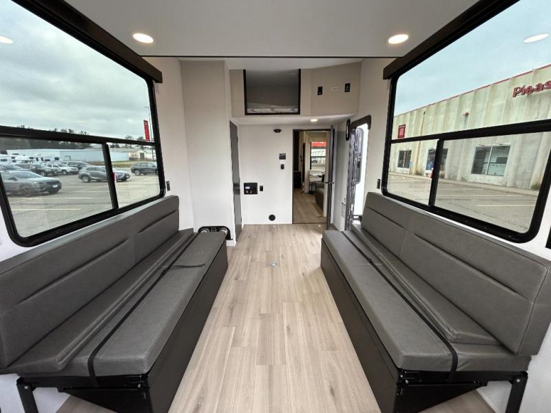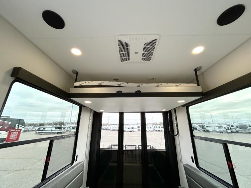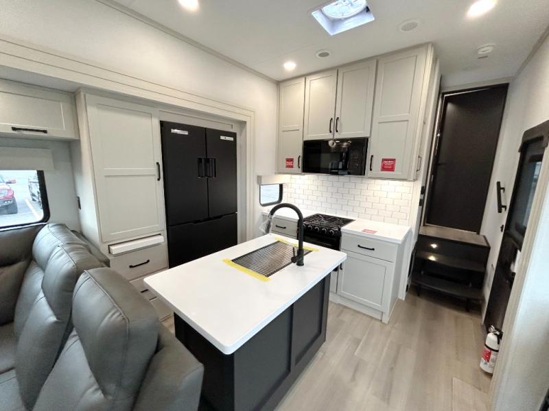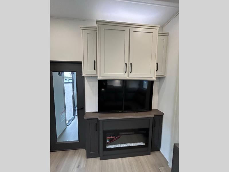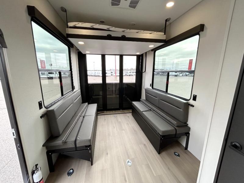 A 15' separate garage in this toy hauler offers plenty of space for your off-road toys! You will appreciate the convenience of having a full bathroom with a walk-in shower and there is washer and dryer prep so you can accommodate these appliances. You will also appreciate the two entry doors, and flip-up pet dish. The rear ramp door can even be converted into a patio, plus there are exterior speakers to keep the party going. Everyone will love hanging out in the separate living area with a fireplace at the entertainment center, theater seating, and a sectional sofa. The fully equipped kitchen has everything you need to prepare delicious home cooked meals. The front private bedroom offers an escape to rest and relax on a queen bed for the next ride!