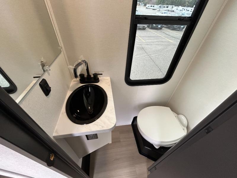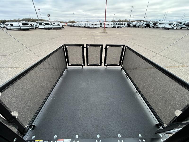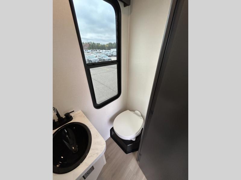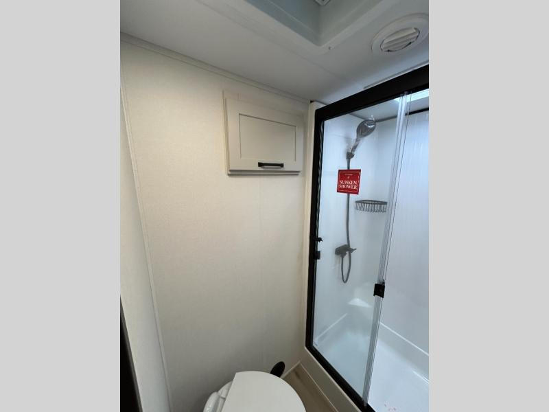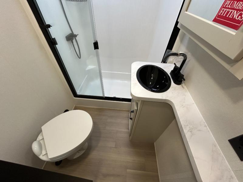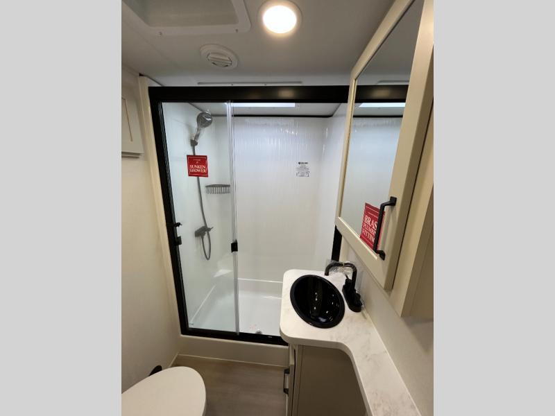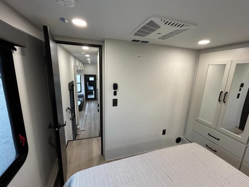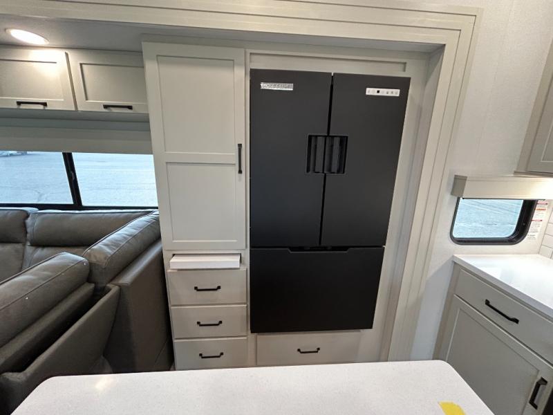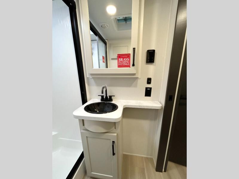 A 15' separate garage in this toy hauler offers plenty of space for your off-road toys! You will appreciate the convenience of having a full bathroom with a walk-in shower and there is washer and dryer prep so you can accommodate these appliances. You will also appreciate the two entry doors, and flip-up pet dish. The rear ramp door can even be converted into a patio, plus there are exterior speakers to keep the party going. Everyone will love hanging out in the separate living area with a fireplace at the entertainment center, theater seating, and a sectional sofa. The fully equipped kitchen has everything you need to prepare delicious home cooked meals. The front private bedroom offers an escape to rest and relax on a queen bed for the next ride!