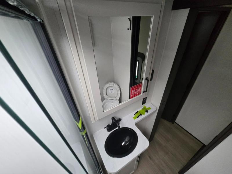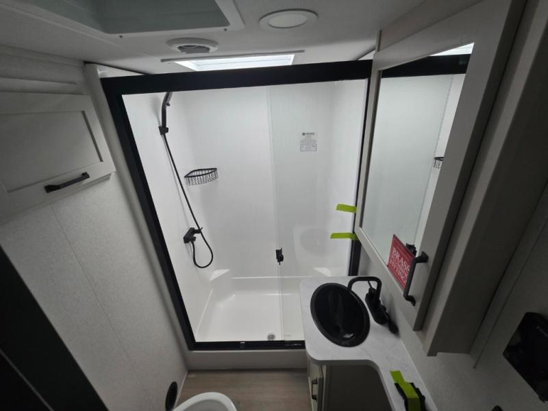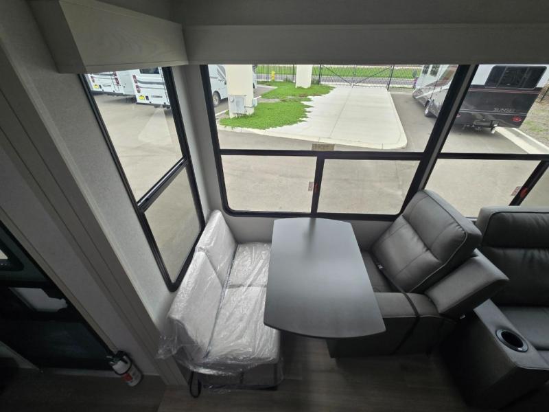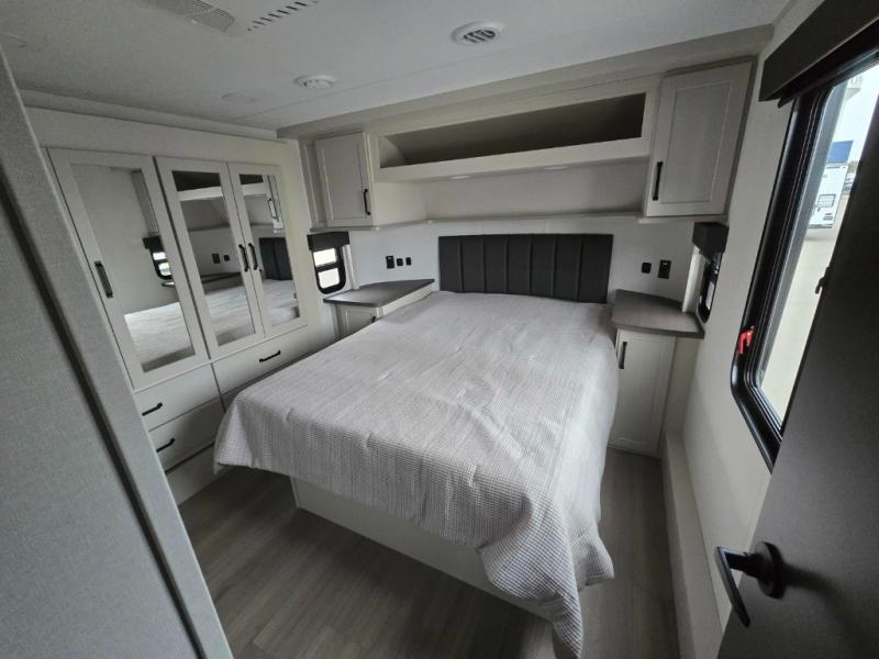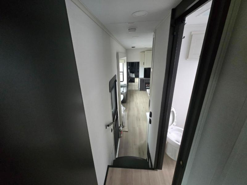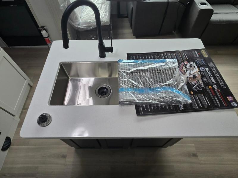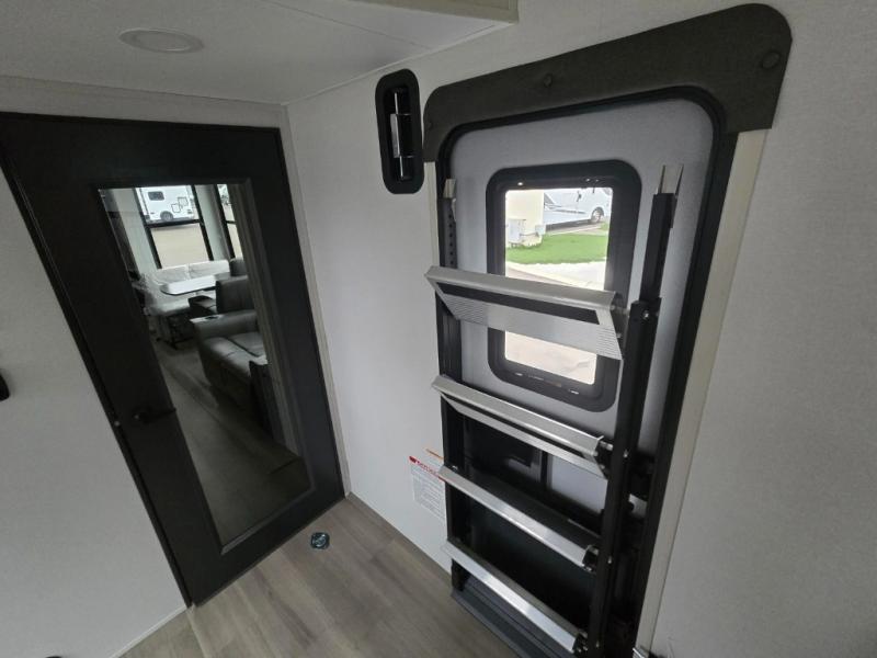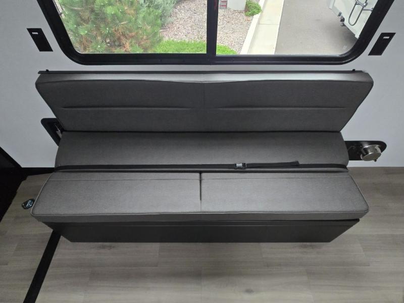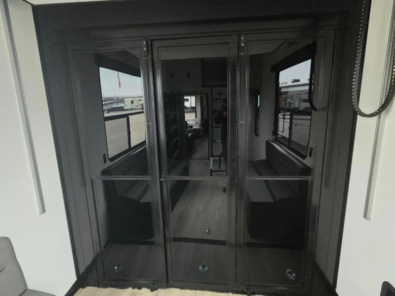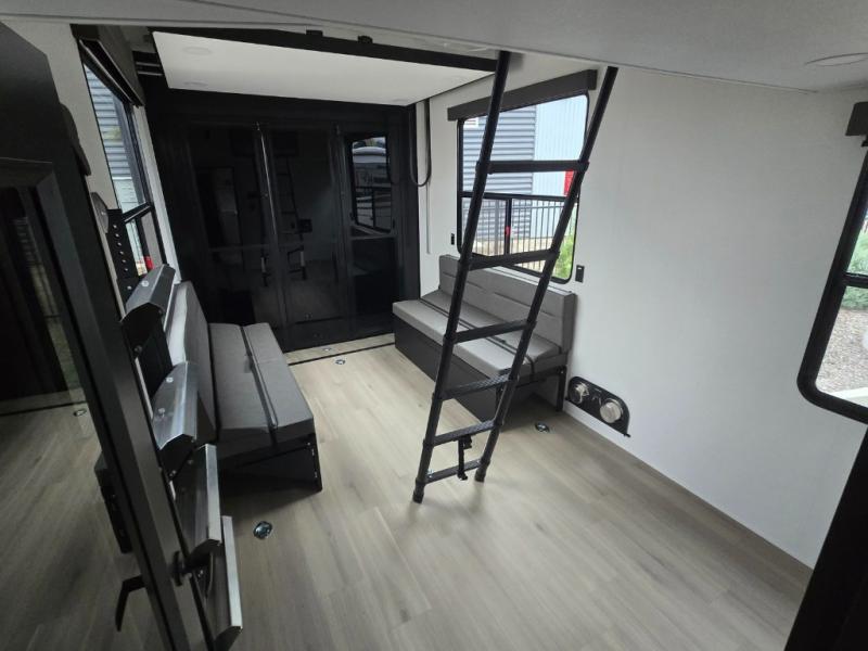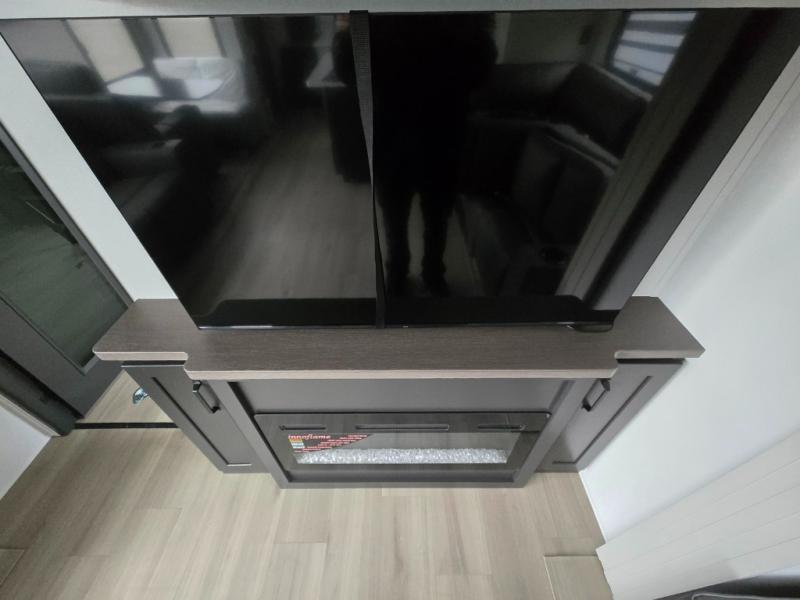 A 15' separate garage in this toy hauler offers plenty of space for your off-road toys! You will appreciate the convenience of having a full bathroom with a walk-in shower and there is washer and dryer prep so you can accommodate these appliances. You will also appreciate the two entry doors, and flip-up pet dish. The rear ramp door can even be converted into a patio, plus there are exterior speakers to keep the party going. Everyone will love hanging out in the separate living area with a fireplace at the entertainment center, theater seating, and a sectional sofa. The fully equipped kitchen has everything you need to prepare delicious home cooked meals. The front private bedroom offers an escape to rest and relax on a queen bed for the next ride!