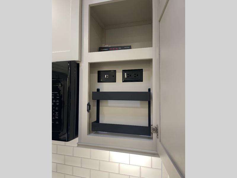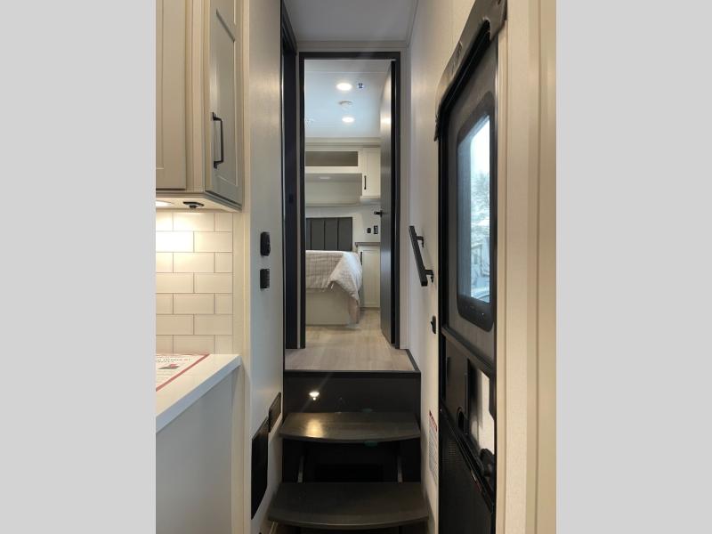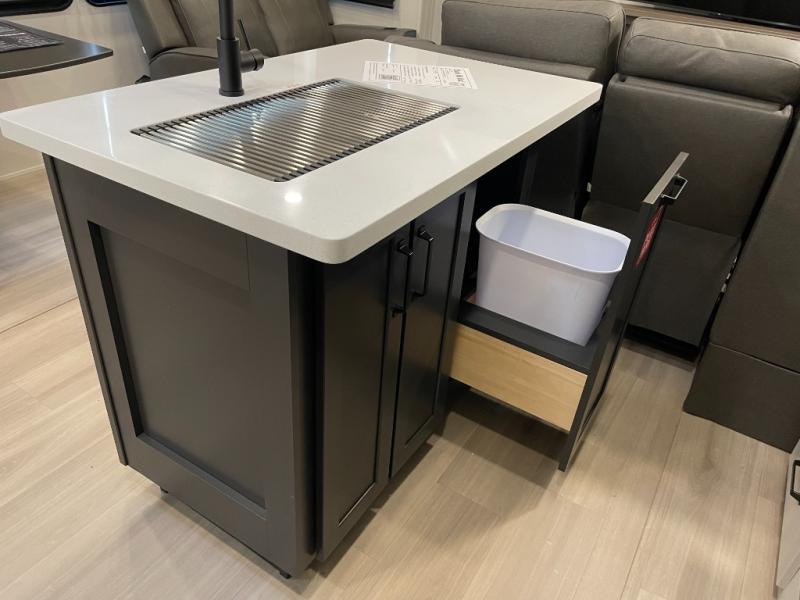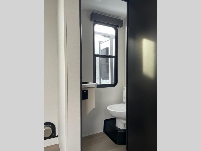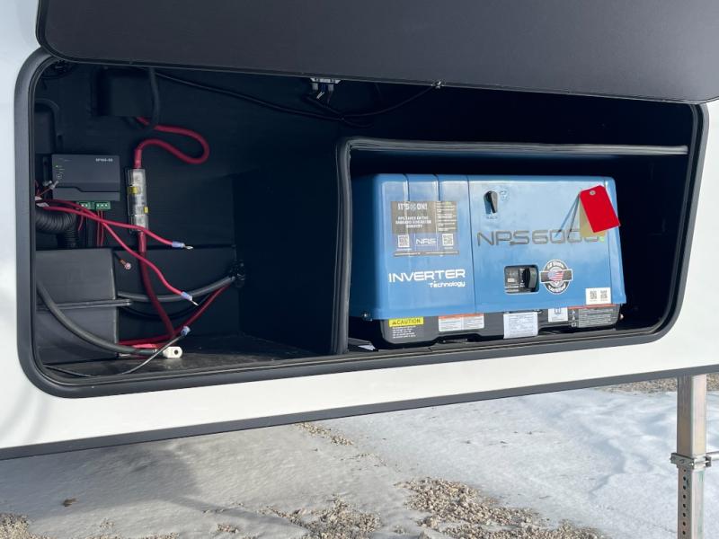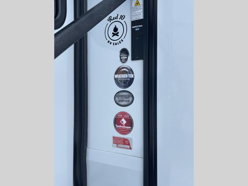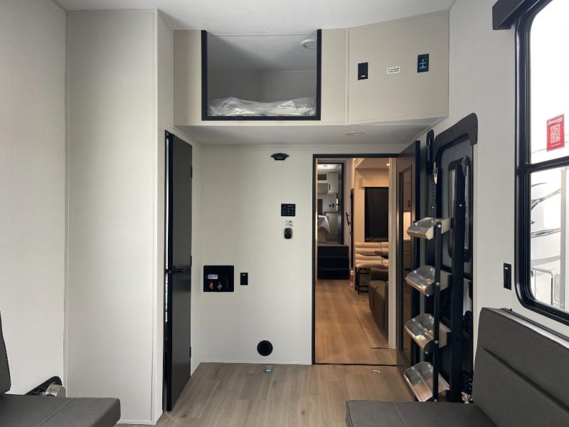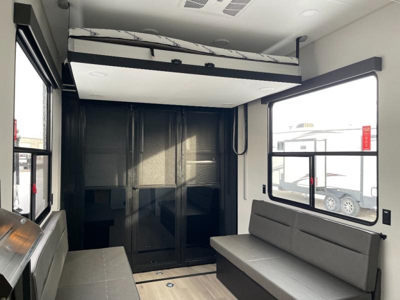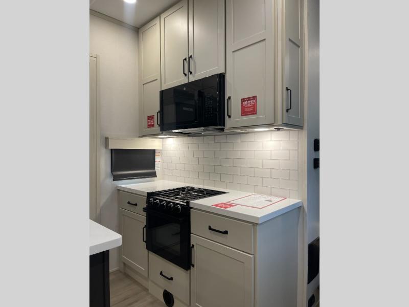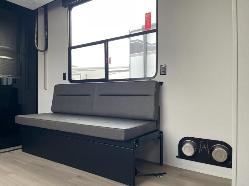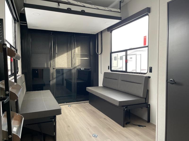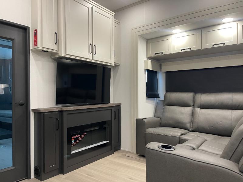 A 15' separate garage in this toy hauler offers plenty of space for your off-road toys! You will appreciate the convenience of having a full bathroom with a walk-in shower and there is washer and dryer prep so you can accommodate these appliances. You will also appreciate the two entry doors, and flip-up pet dish. The rear ramp door can even be converted into a patio, plus there are exterior speakers to keep the party going. Everyone will love hanging out in the separate living area with a fireplace at the entertainment center, theater seating, and a sectional sofa. The fully equipped kitchen has everything you need to prepare delicious home cooked meals. The front private bedroom offers an escape to rest and relax on a queen bed for the next ride!