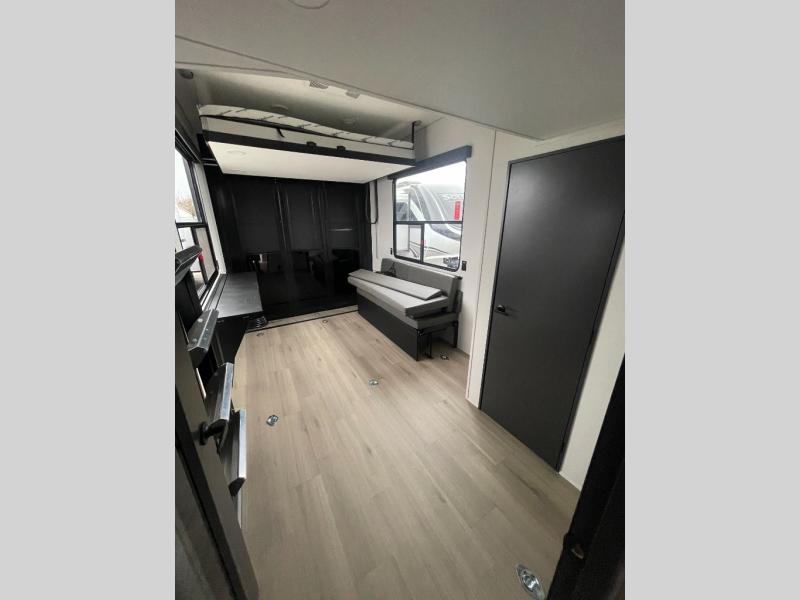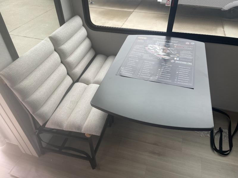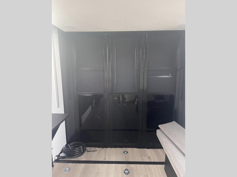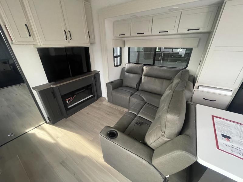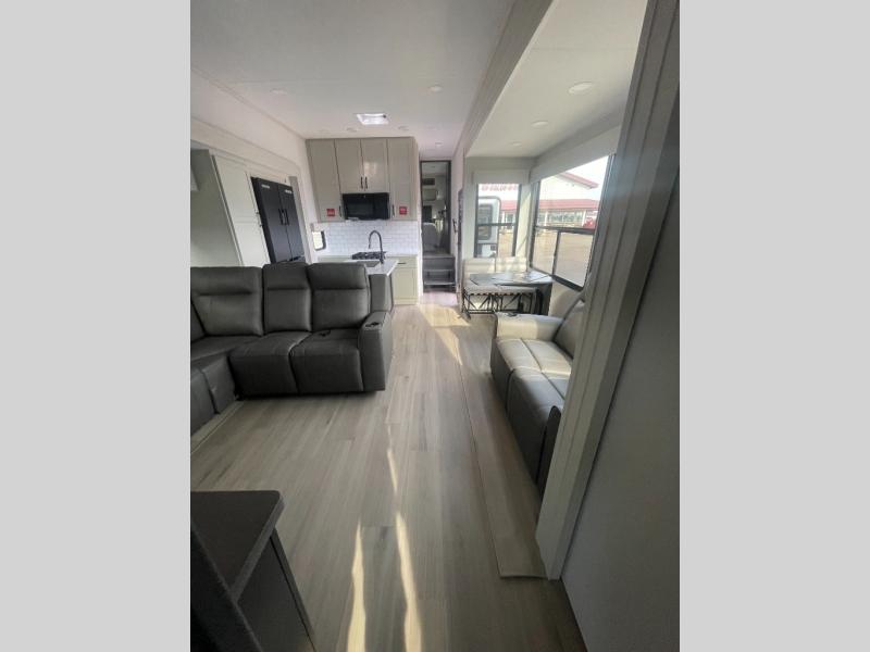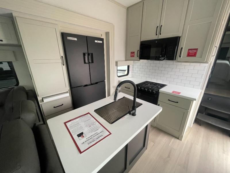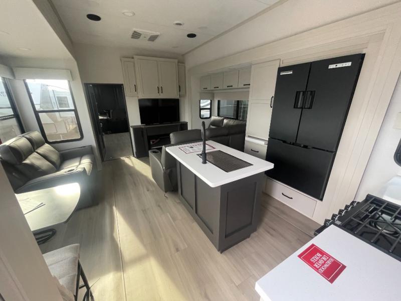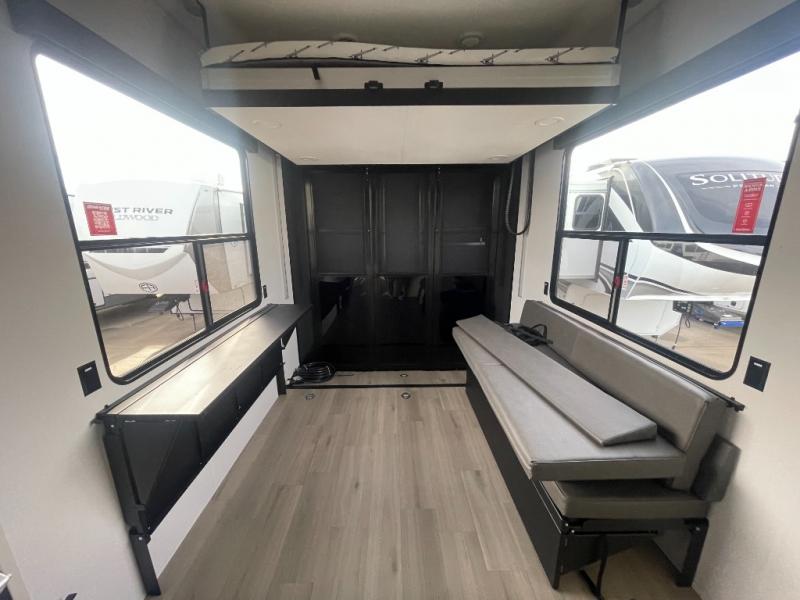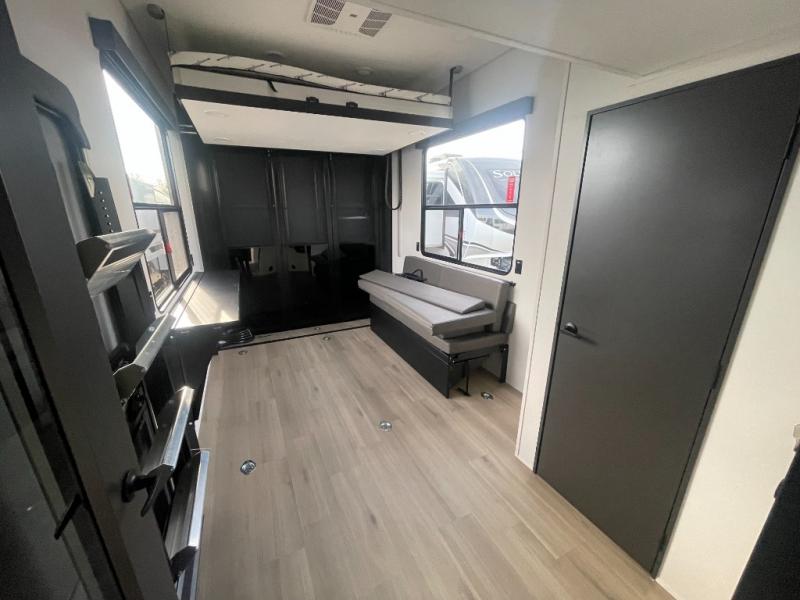 A 15' separate garage in this toy hauler offers plenty of space for your off-road toys! You will appreciate the convenience of having a full bathroom with a walk-in shower and there is washer and dryer prep so you can accommodate these appliances. You will also appreciate the two entry doors, and flip-up pet dish. The rear ramp door can even be converted into a patio, plus there are exterior speakers to keep the party going. Everyone will love hanging out in the separate living area with a fireplace at the entertainment center, theater seating, and a sectional sofa. The fully equipped kitchen has everything you need to prepare delicious home cooked meals. The front private bedroom offers an escape to rest and relax on a queen bed for the next ride!