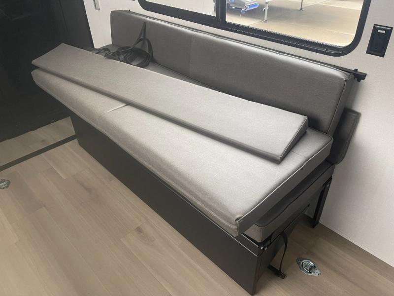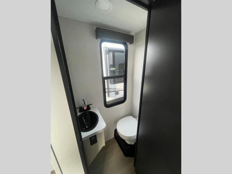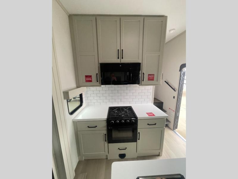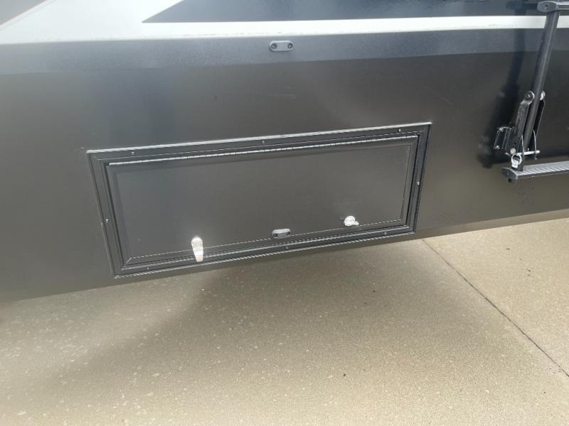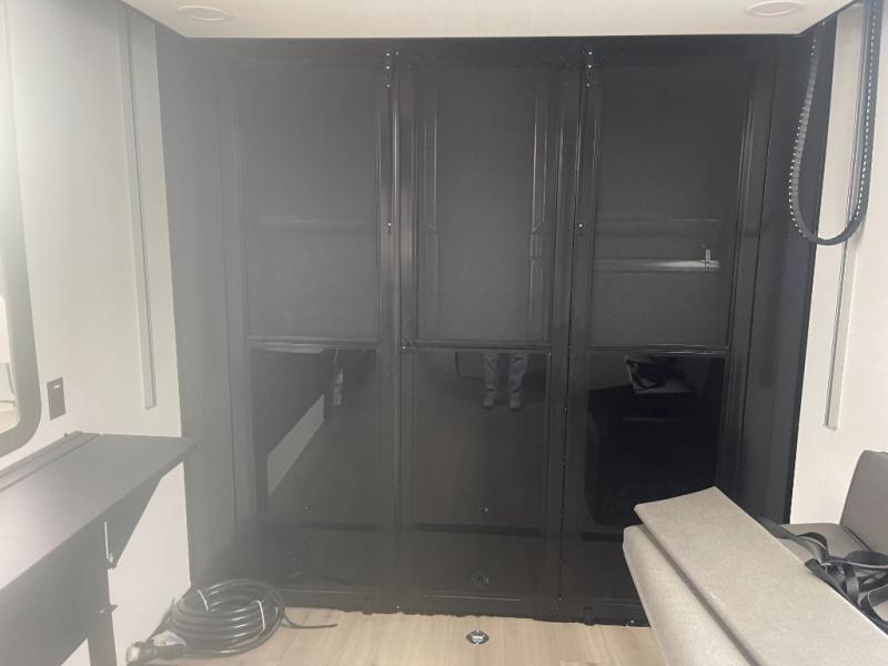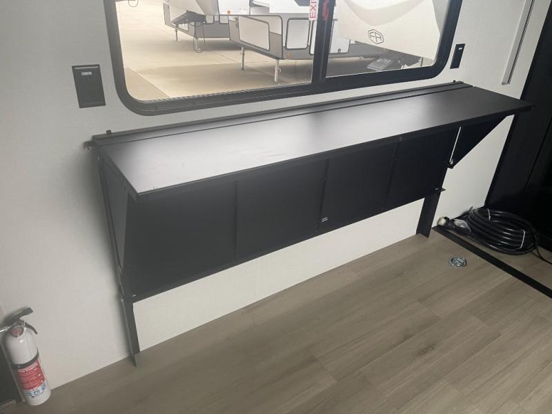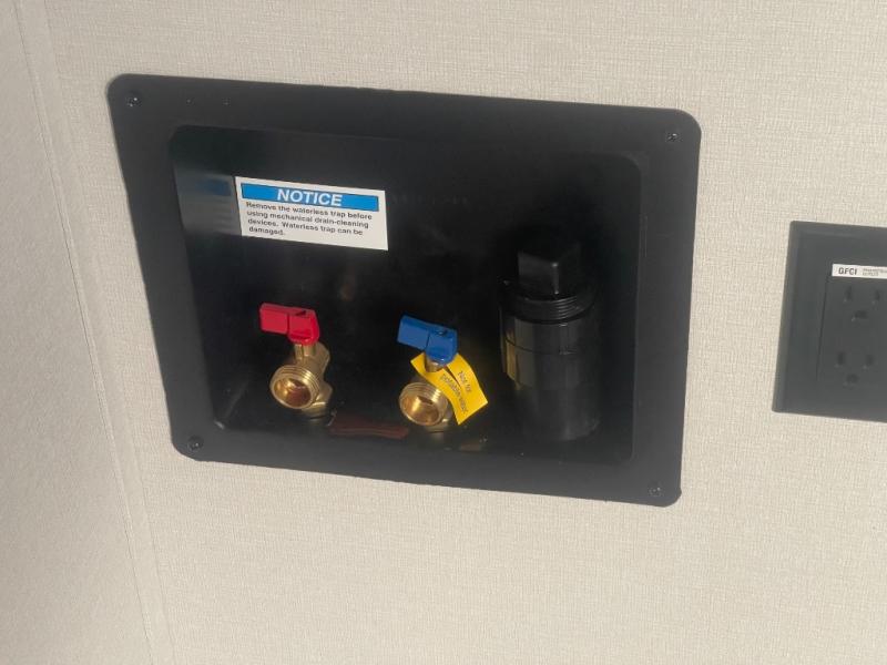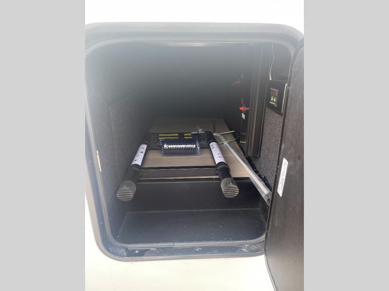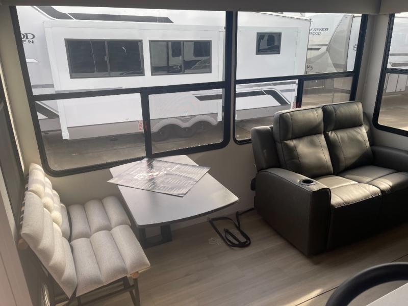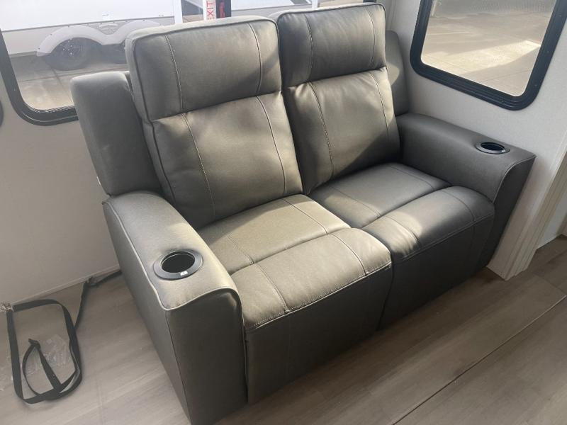 A 15' separate garage in this toy hauler offers plenty of space for your off-road toys! You will appreciate the convenience of having a full bathroom with a walk-in shower and there is washer and dryer prep so you can accommodate these appliances. You will also appreciate the two entry doors, and flip-up pet dish. The rear ramp door can even be converted into a patio, plus there are exterior speakers to keep the party going. Everyone will love hanging out in the separate living area with a fireplace at the entertainment center, theater seating, and a sectional sofa. The fully equipped kitchen has everything you need to prepare delicious home cooked meals. The front private bedroom offers an escape to rest and relax on a queen bed for the next ride!