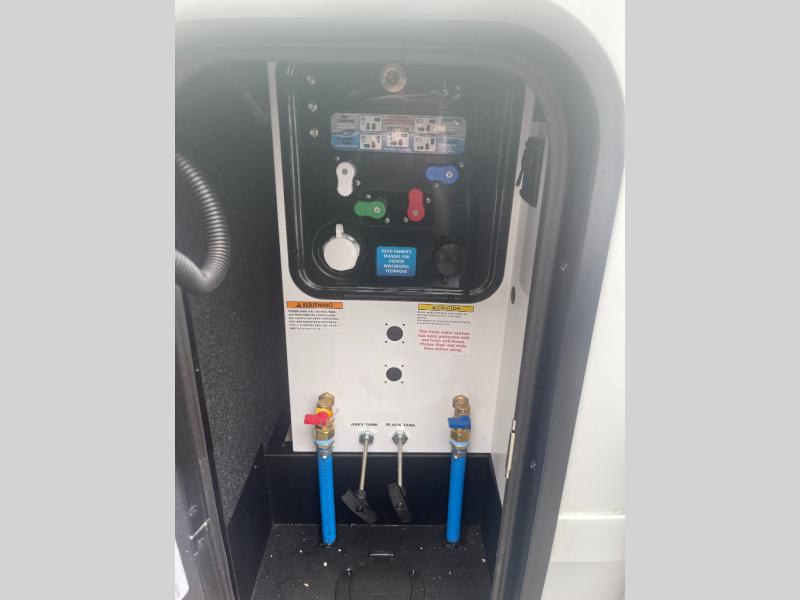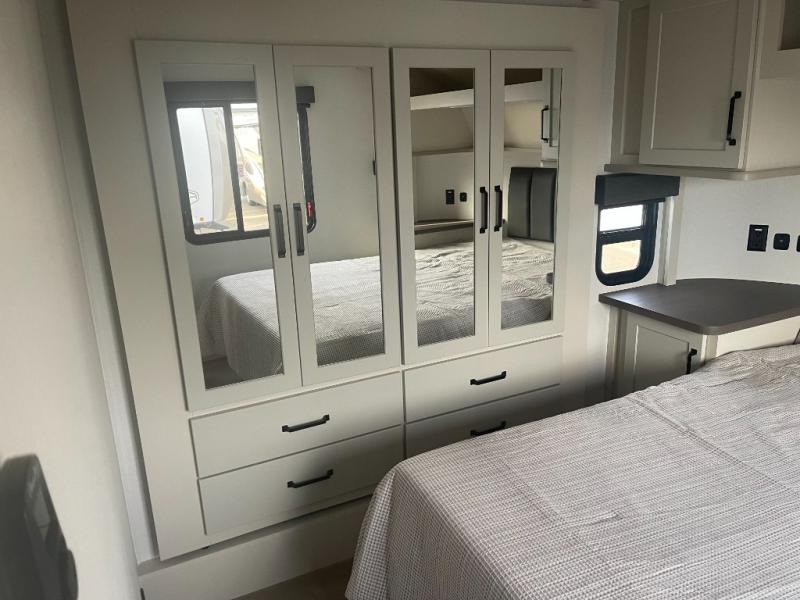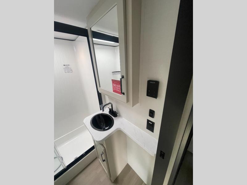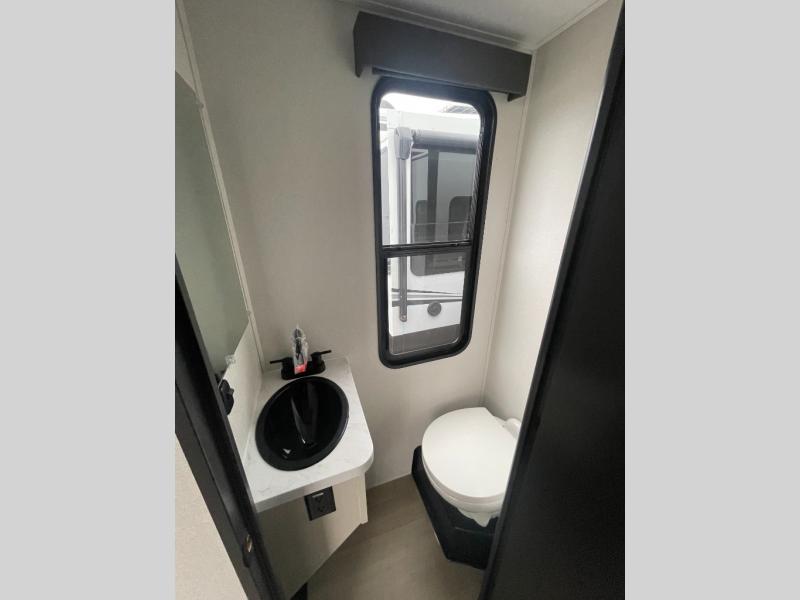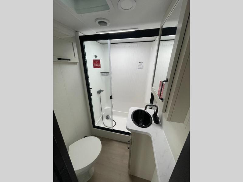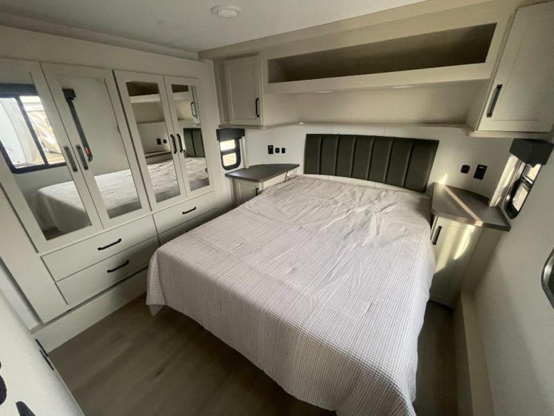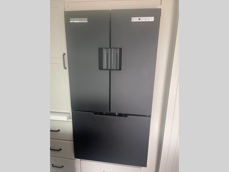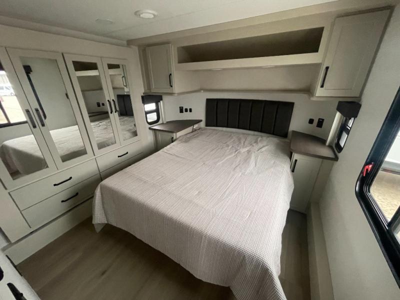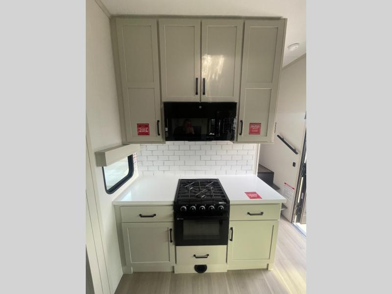 A 15' separate garage in this toy hauler offers plenty of space for your off-road toys! You will appreciate the convenience of having a full bathroom with a walk-in shower and there is washer and dryer prep so you can accommodate these appliances. You will also appreciate the two entry doors, and flip-up pet dish. The rear ramp door can even be converted into a patio, plus there are exterior speakers to keep the party going. Everyone will love hanging out in the separate living area with a fireplace at the entertainment center, theater seating, and a sectional sofa. The fully equipped kitchen has everything you need to prepare delicious home cooked meals. The front private bedroom offers an escape to rest and relax on a queen bed for the next ride!