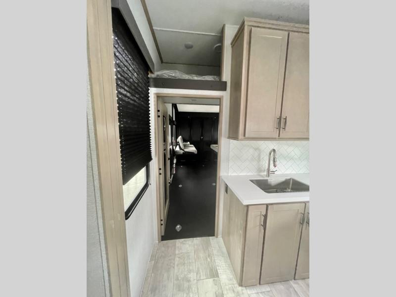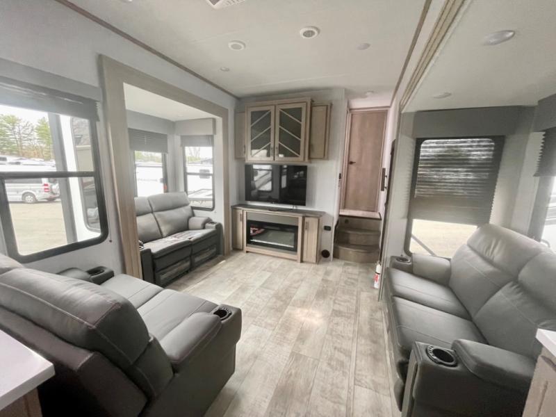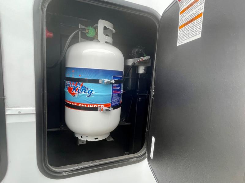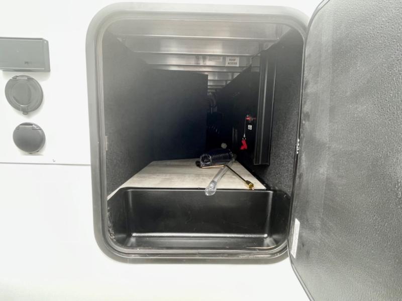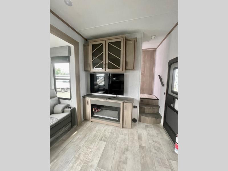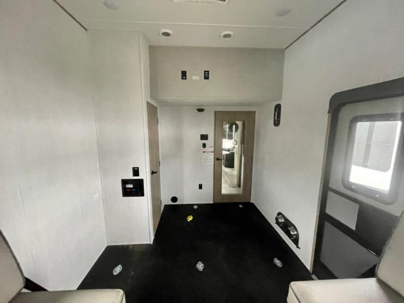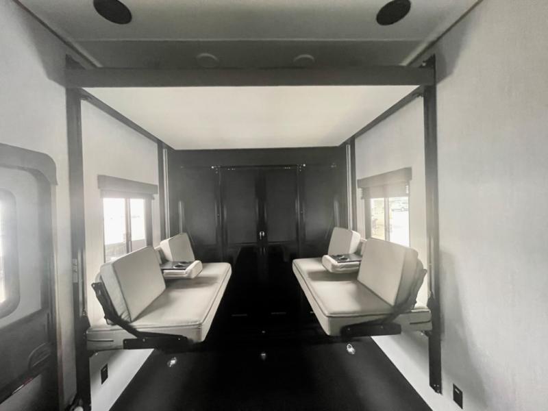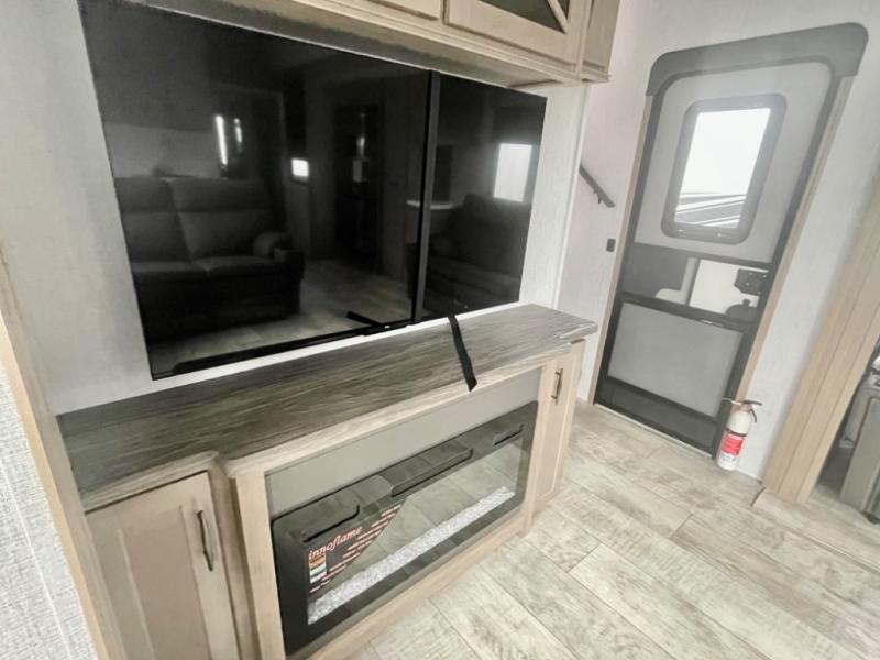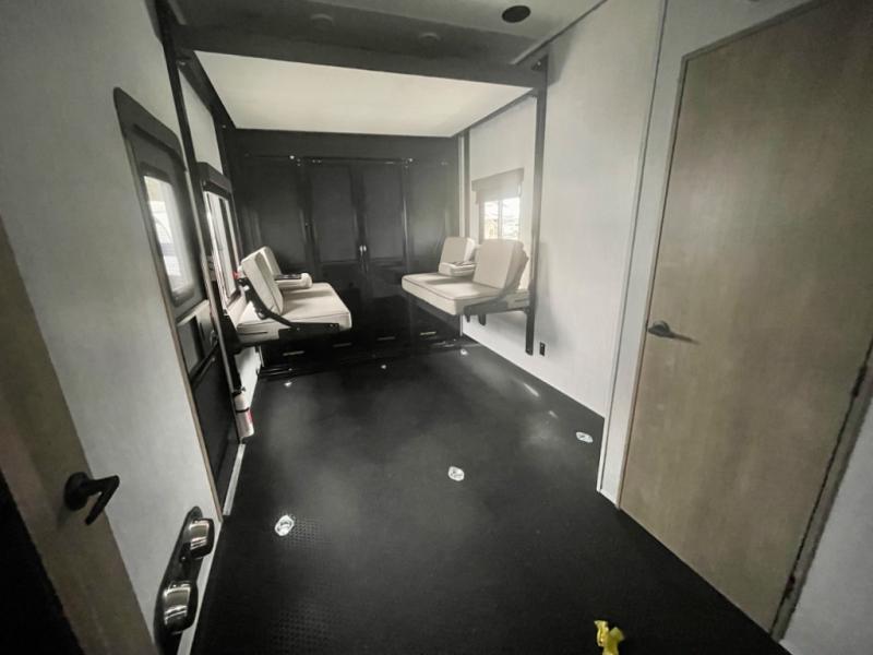 A 14' separate garage in this toy hauler offers plenty of space for your off-road toys! You will appreciate the convenience of having a full bathroom with a walk-in shower and you can even add an optional half bath to the garage area. You will also appreciate the two entry doors, and flip-up pet dish. The rear ramp door can even be converted into a patio, plus there are exterior speakers to keep the party going. Everyone will love hanging out in the separate living area with a fireplace at the entertainment center, two theater seating slides, and a third theater seating. The fully equipped kitchen has everything you need to prepare delicious home cooked meals. The front private bedroom offers an escape to rest and relax on a queen bed for the next ride!
