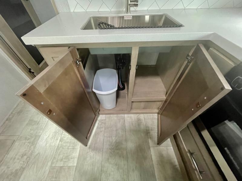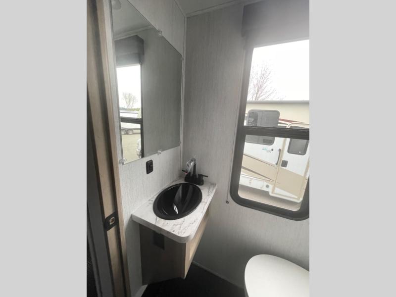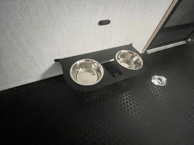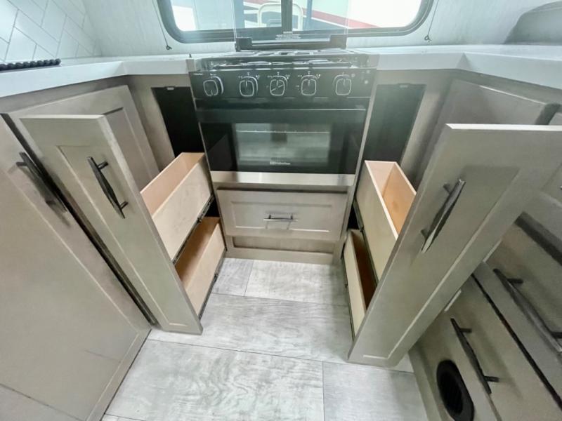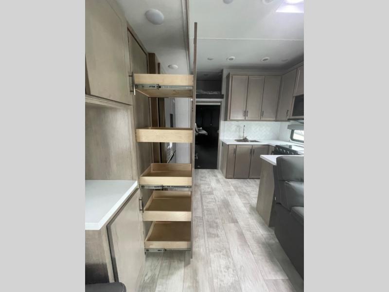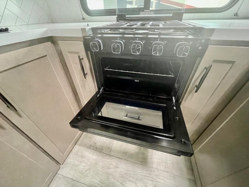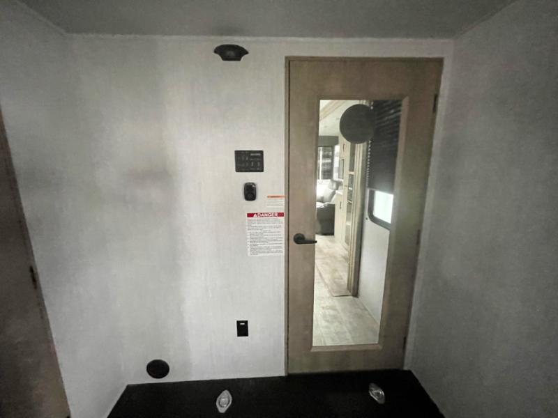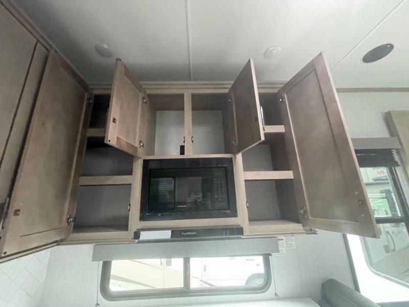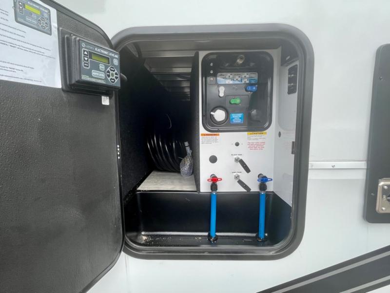 A 14' separate garage in this toy hauler offers plenty of space for your off-road toys! You will appreciate the convenience of having a full bathroom with a walk-in shower and you can even add an optional half bath to the garage area. You will also appreciate the two entry doors, and flip-up pet dish. The rear ramp door can even be converted into a patio, plus there are exterior speakers to keep the party going. Everyone will love hanging out in the separate living area with a fireplace at the entertainment center, two theater seating slides, and a third theater seating. The fully equipped kitchen has everything you need to prepare delicious home cooked meals. The front private bedroom offers an escape to rest and relax on a queen bed for the next ride!