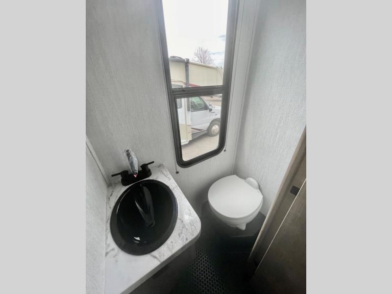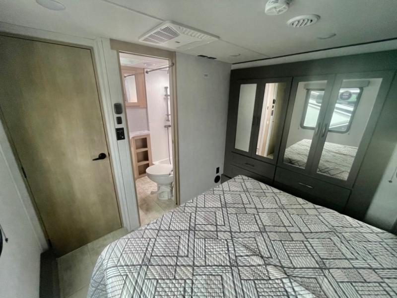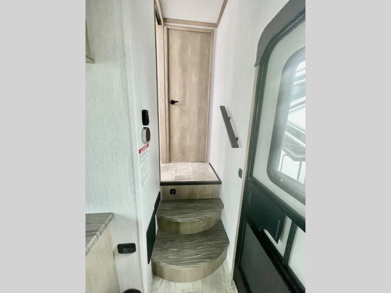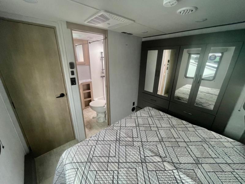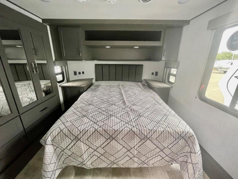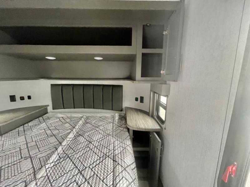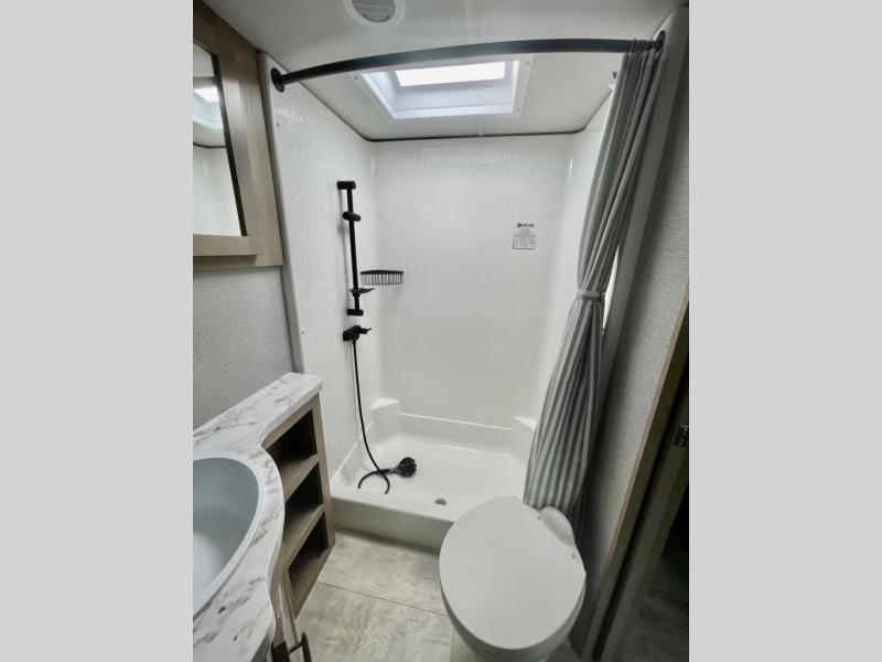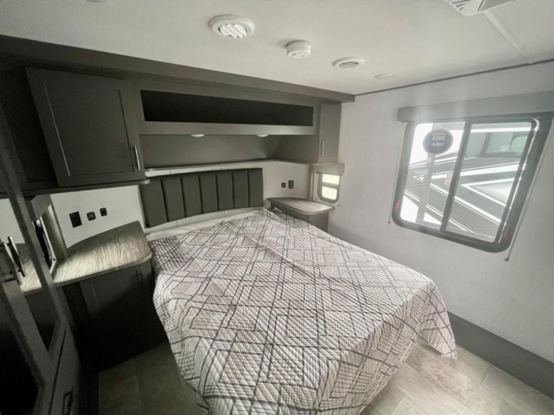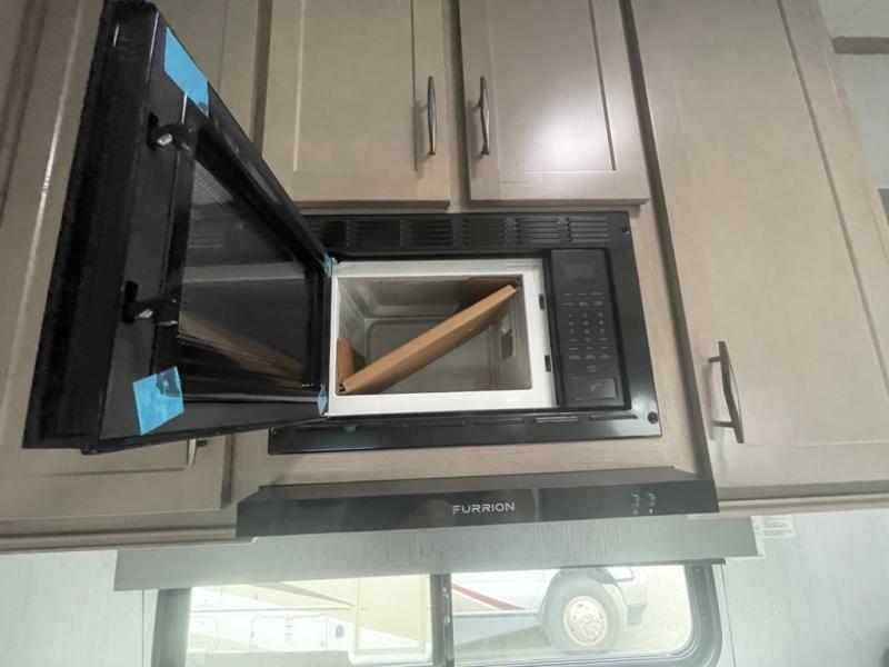 A 14' separate garage in this toy hauler offers plenty of space for your off-road toys! You will appreciate the convenience of having a full bathroom with a walk-in shower and you can even add an optional half bath to the garage area. You will also appreciate the two entry doors, and flip-up pet dish. The rear ramp door can even be converted into a patio, plus there are exterior speakers to keep the party going. Everyone will love hanging out in the separate living area with a fireplace at the entertainment center, two theater seating slides, and a third theater seating. The fully equipped kitchen has everything you need to prepare delicious home cooked meals. The front private bedroom offers an escape to rest and relax on a queen bed for the next ride!