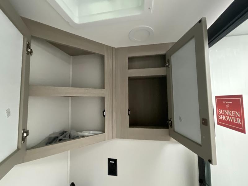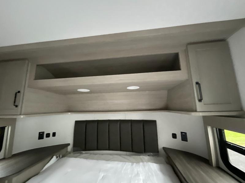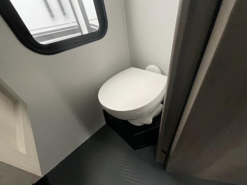 The front master suite offers a walk-around queen bed, dual wardrobes, overhead storage, and privacy doors, creating a peaceful retreat at the end of the day. The full bathroom includes a spacious shower, vanity, and thoughtful design touches that deliver residential-style comfort on the road.