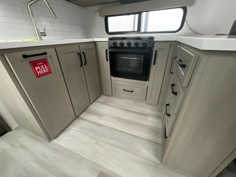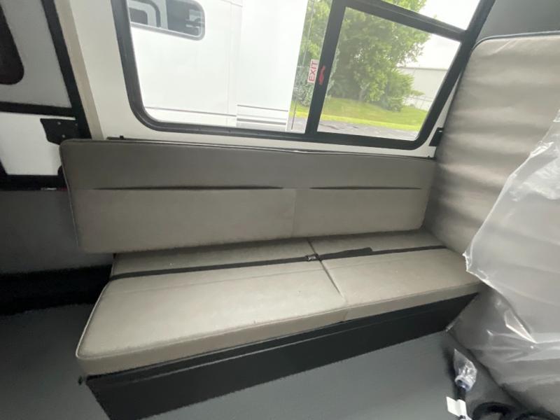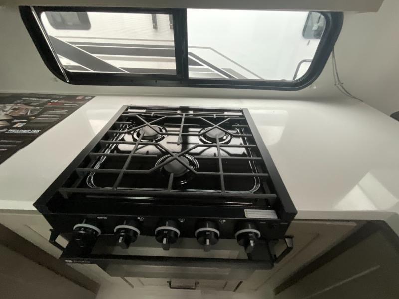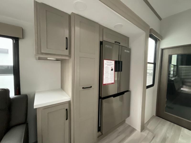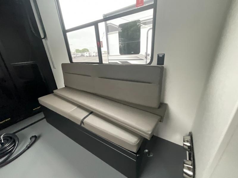 The chef-inspired kitchen is built for convenience and function, with solid-surface countertops, a three-burner cooktop, microwave, residential refrigerator, and plenty of cabinetry for storage. A dinette or optional free-standing table provides a versatile space for dining, games, or working remotely, making this toy hauler perfect for both adventure and everyday comfort.