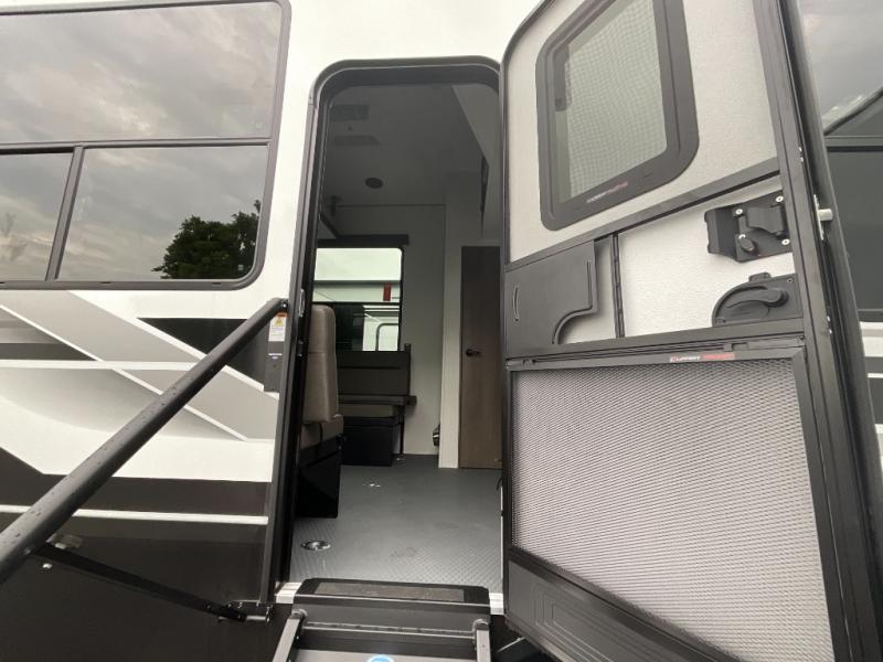 The rear garage area is a standout feature, perfect for hauling motorcycles, ATVs, or other outdoor toys, and easily converts into extra living or sleeping space with drop-down sofas and overhead beds. The main living area is designed for comfort, featuring theater seating, a tri-fold sofa, and an entertainment center with a large TV, creating a welcoming space to relax after a day of adventure. Panoramic windows bring in natural light, enhancing the bright and open feel of the interior.