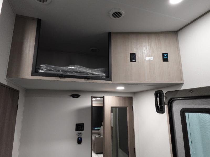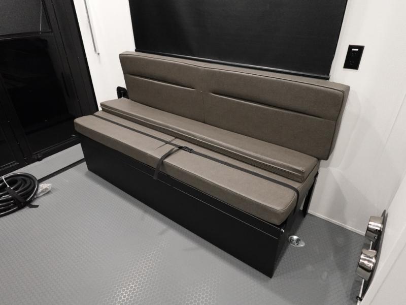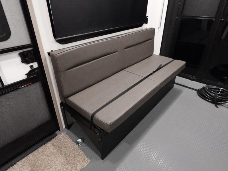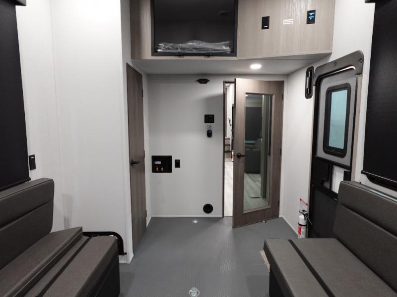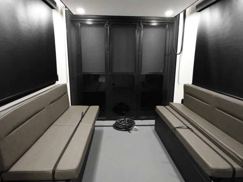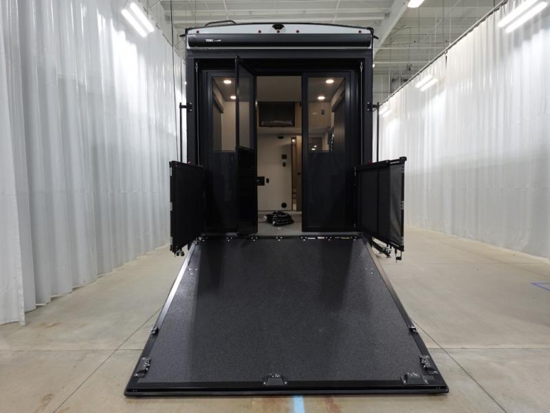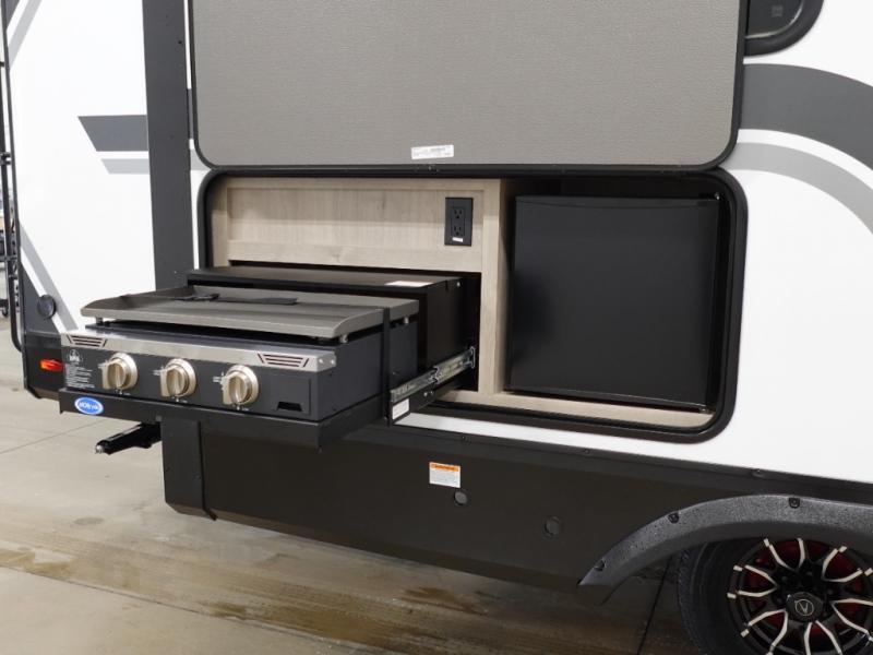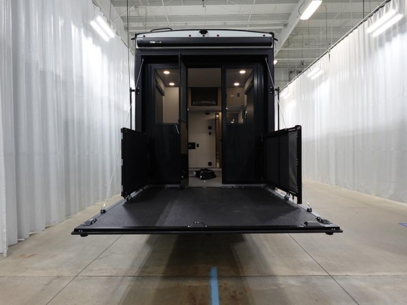 A 14' separate garage in this toy hauler offers plenty of space for your off-road toys! You will appreciate the convenience of having a full bathroom with a walk-in shower and you can even add an optional half bath to the garage area. You will also appreciate the two entry doors, and flip-up pet dish. The rear ramp door can even be converted into a patio, plus there are exterior speakers to keep the party going. Everyone will love hanging out in the separate living area with a fireplace at the entertainment center, two theater seating slides, and a third theater seating. The fully equipped kitchen has everything you need to prepare delicious home cooked meals. The front private bedroom offers an escape to rest and relax on a queen bed for the next ride!