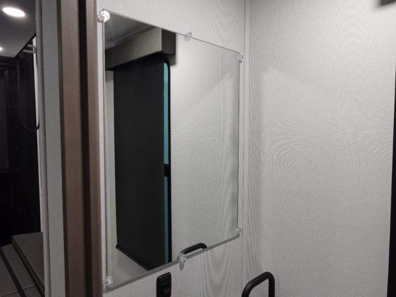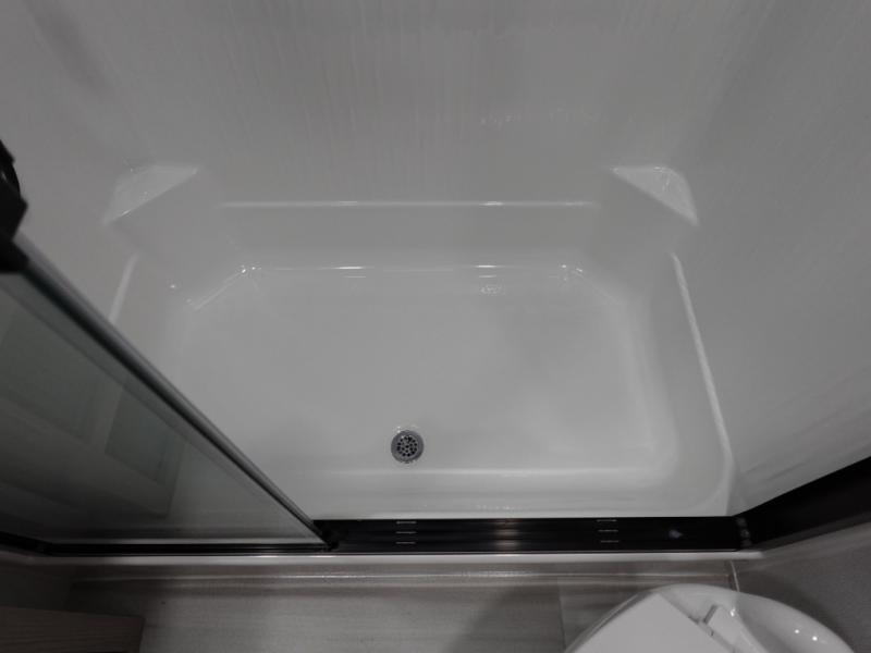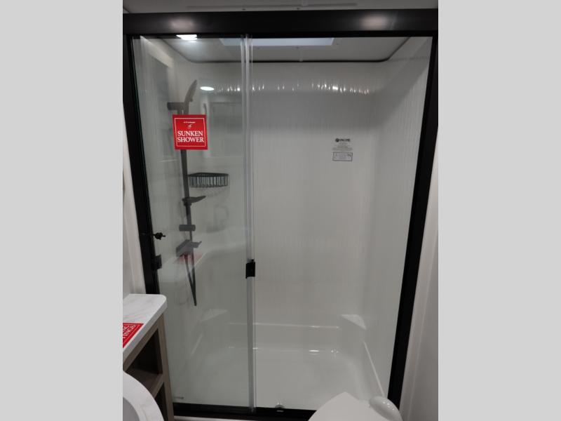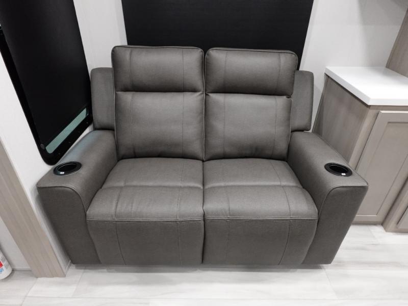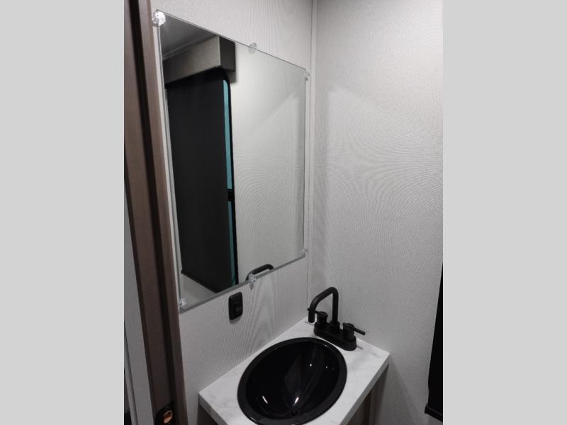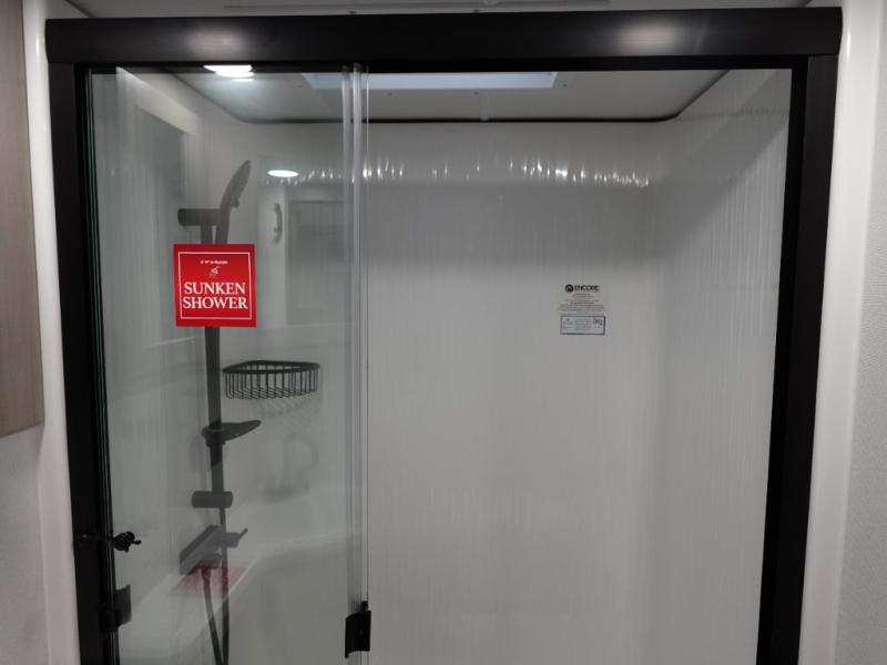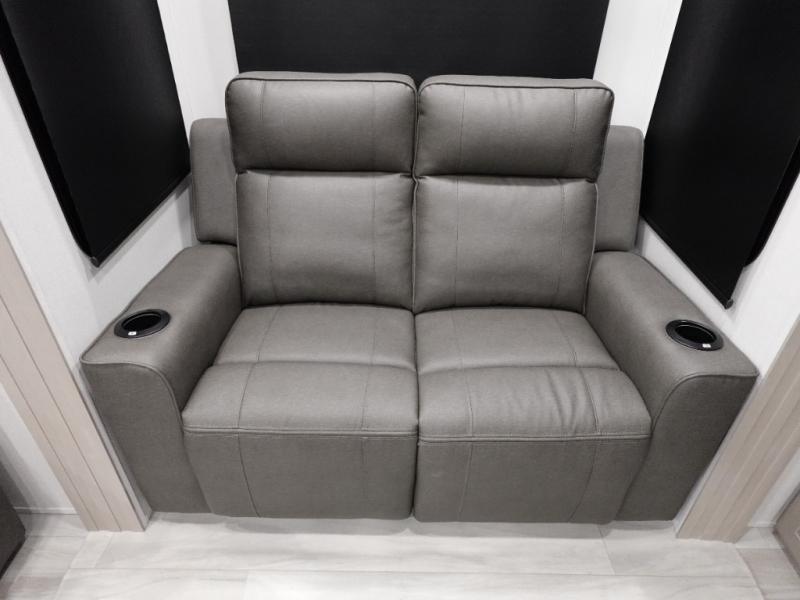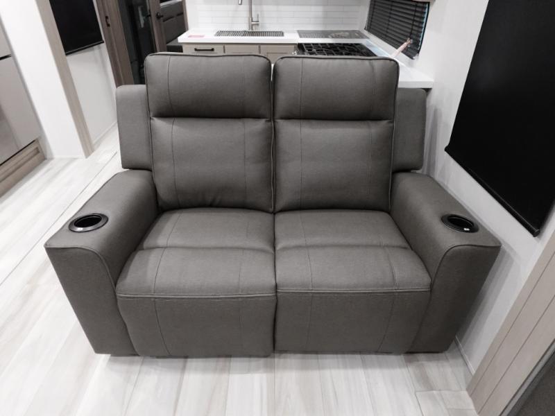 A 14' separate garage in this toy hauler offers plenty of space for your off-road toys! You will appreciate the convenience of having a full bathroom with a walk-in shower and you can even add an optional half bath to the garage area. You will also appreciate the two entry doors, and flip-up pet dish. The rear ramp door can even be converted into a patio, plus there are exterior speakers to keep the party going. Everyone will love hanging out in the separate living area with a fireplace at the entertainment center, two theater seating slides, and a third theater seating. The fully equipped kitchen has everything you need to prepare delicious home cooked meals. The front private bedroom offers an escape to rest and relax on a queen bed for the next ride!