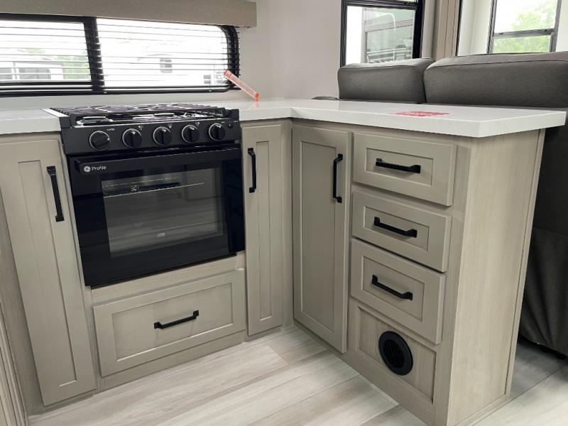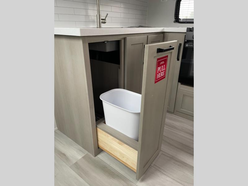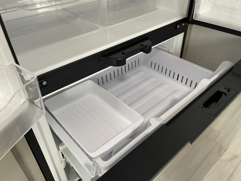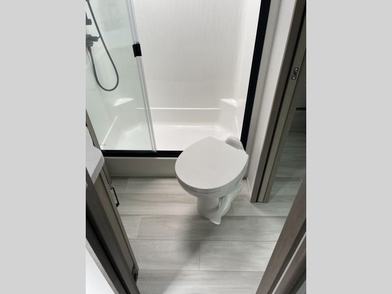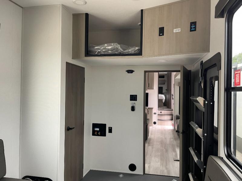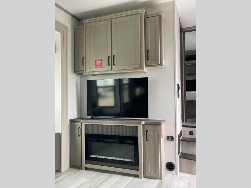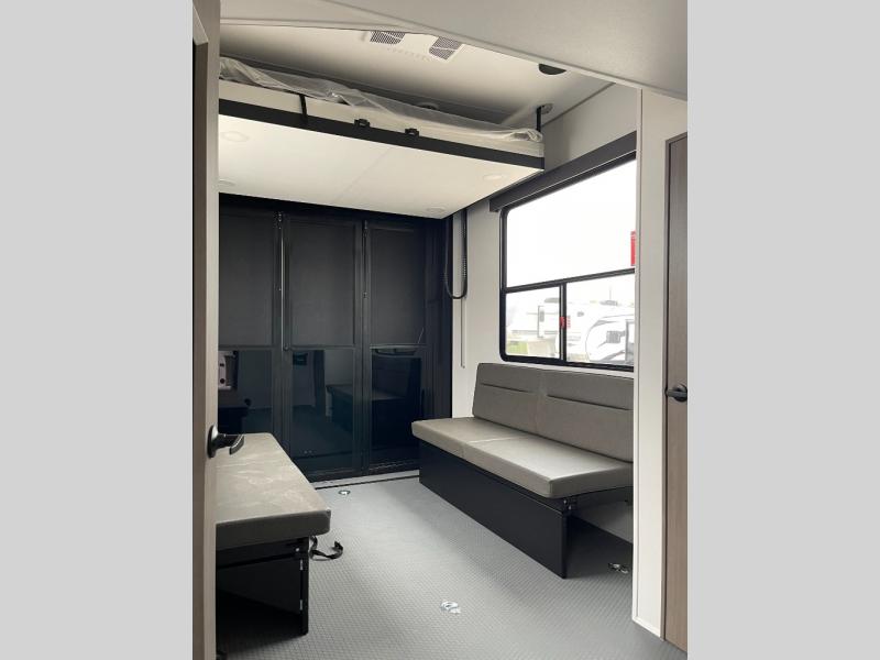 A 14' separate garage in this toy hauler offers plenty of space for your off-road toys! You will appreciate the convenience of having a full bathroom with a walk-in shower and you can even add an optional half bath to the garage area. You will also appreciate the two entry doors, and flip-up pet dish. The rear ramp door can even be converted into a patio, plus there are exterior speakers to keep the party going. Everyone will love hanging out in the separate living area with a fireplace at the entertainment center, two theater seating slides, and a third theater seating. The fully equipped kitchen has everything you need to prepare delicious home cooked meals. The front private bedroom offers an escape to rest and relax on a queen bed for the next ride!