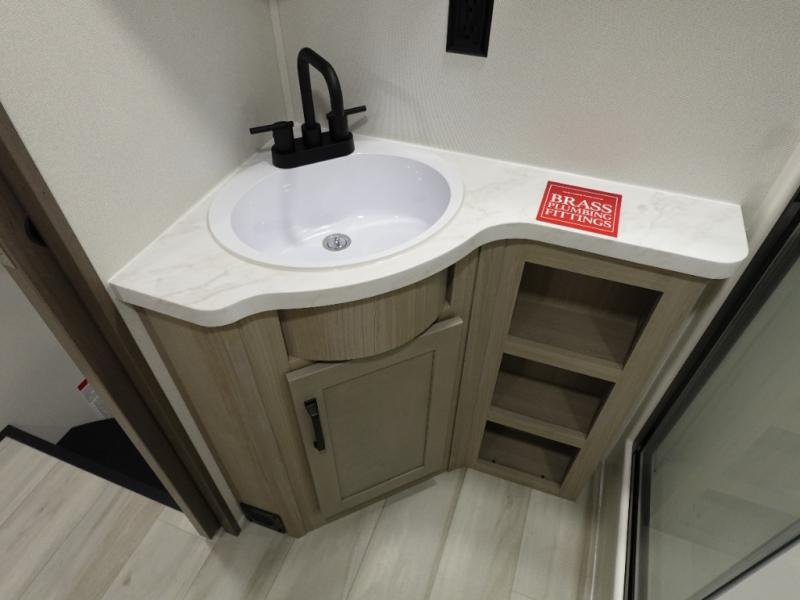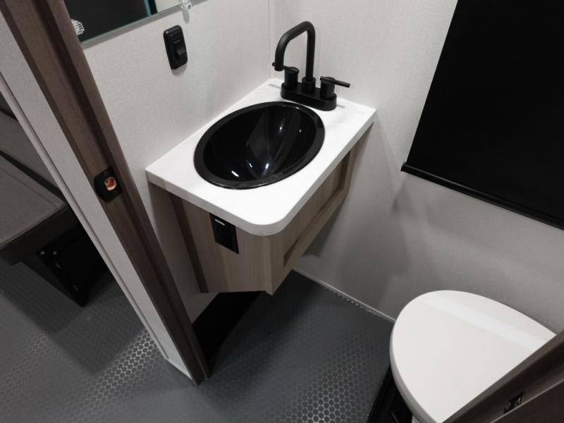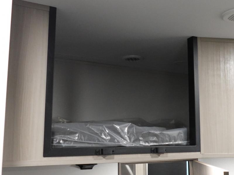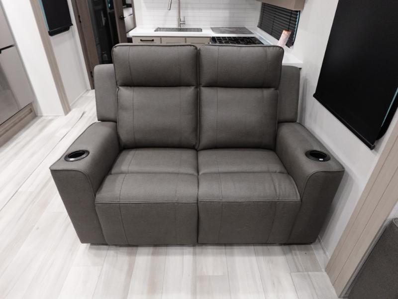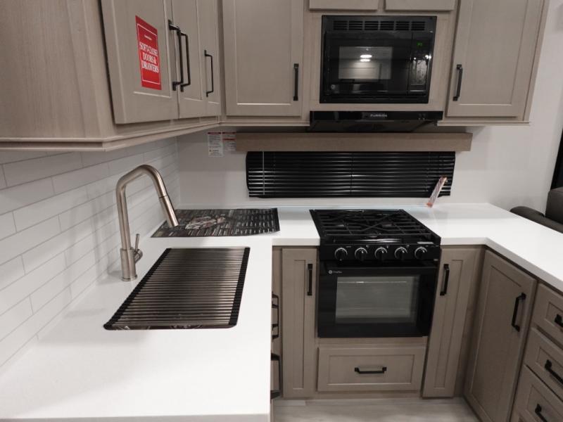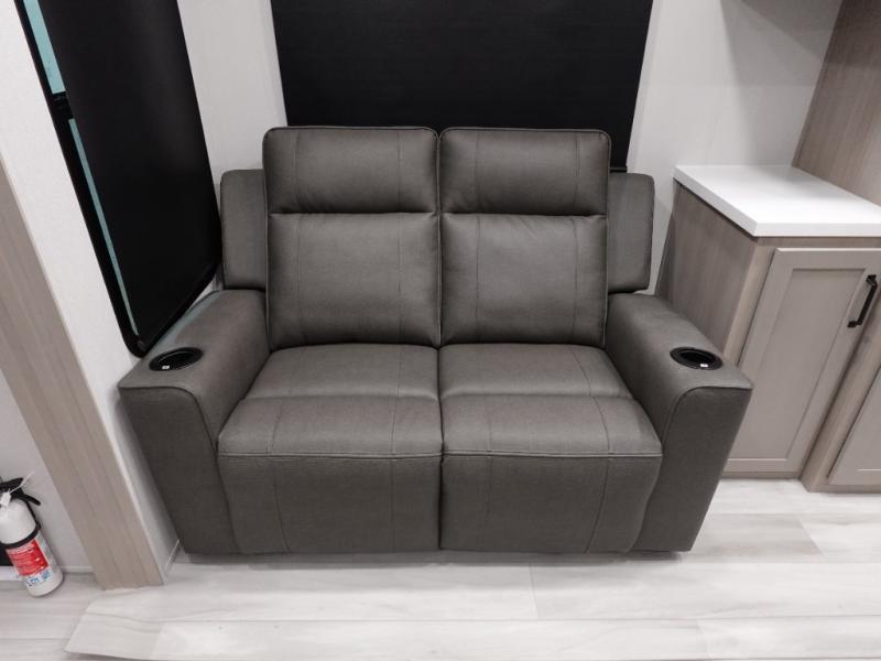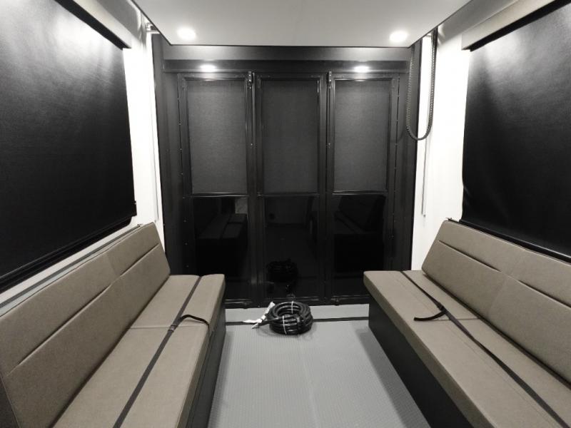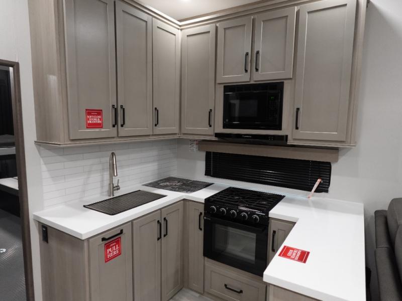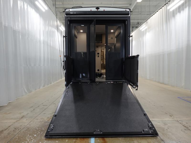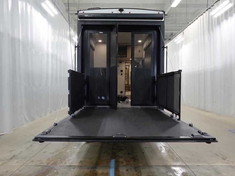 A 14' separate garage in this toy hauler offers plenty of space for your off-road toys! You will also appreciate the two entry doors, and flip-up pet dish. The rear ramp door can even be converted into a patio, plus there are exterior speakers to keep the party going. Everyone will love hanging out in the separate living area with a fireplace at the entertainment center, two theater seating slides, and a third theater seating. The fully equipped kitchen has everything you need to prepare delicious home cooked meals.