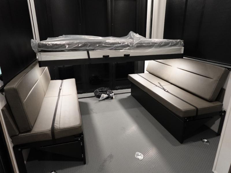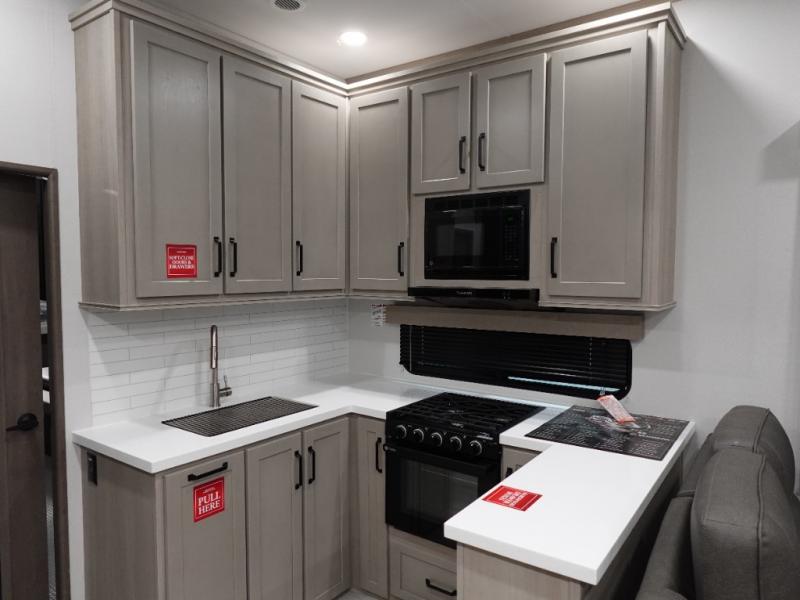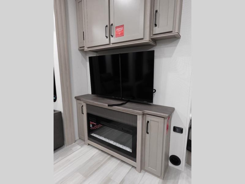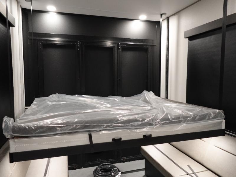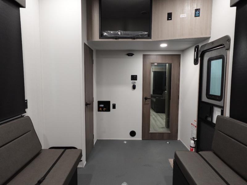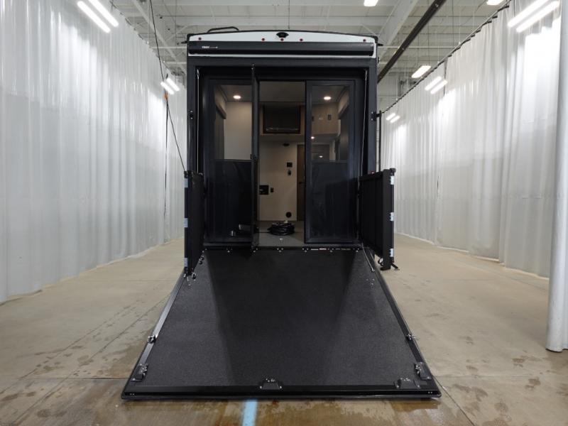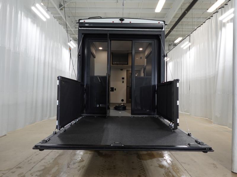 A 14' separate garage in this toy hauler offers plenty of space for your off-road toys! You will also appreciate the two entry doors, and flip-up pet dish. The rear ramp door can even be converted into a patio, plus there are exterior speakers to keep the party going. Everyone will love hanging out in the separate living area with a fireplace at the entertainment center, two theater seating slides, and a third theater seating. The fully equipped kitchen has everything you need to prepare delicious home cooked meals. The front private bedroom offers an escape to rest and relax on a queen bed for the next ride!