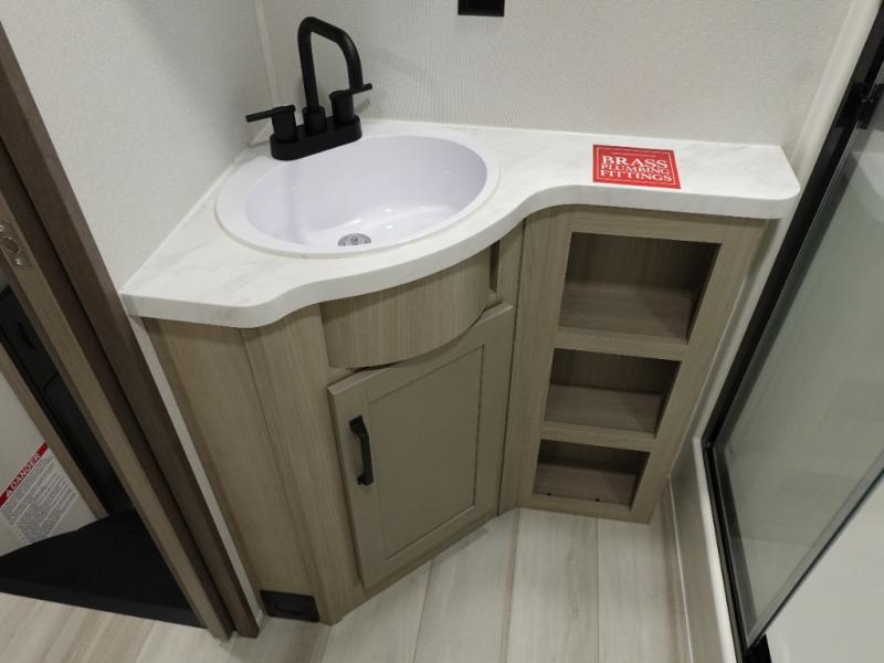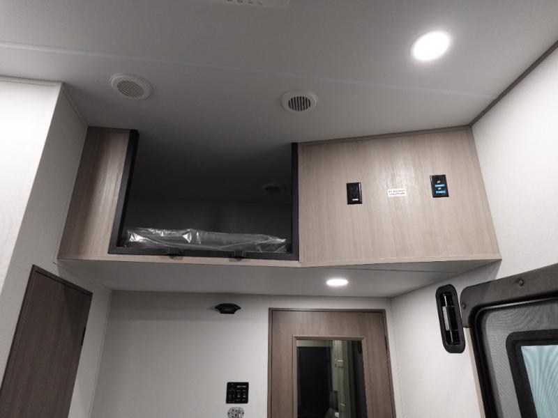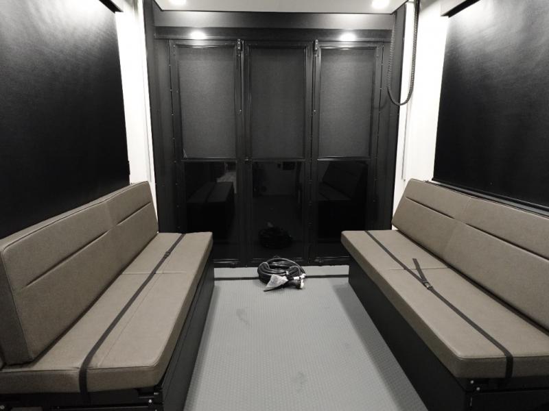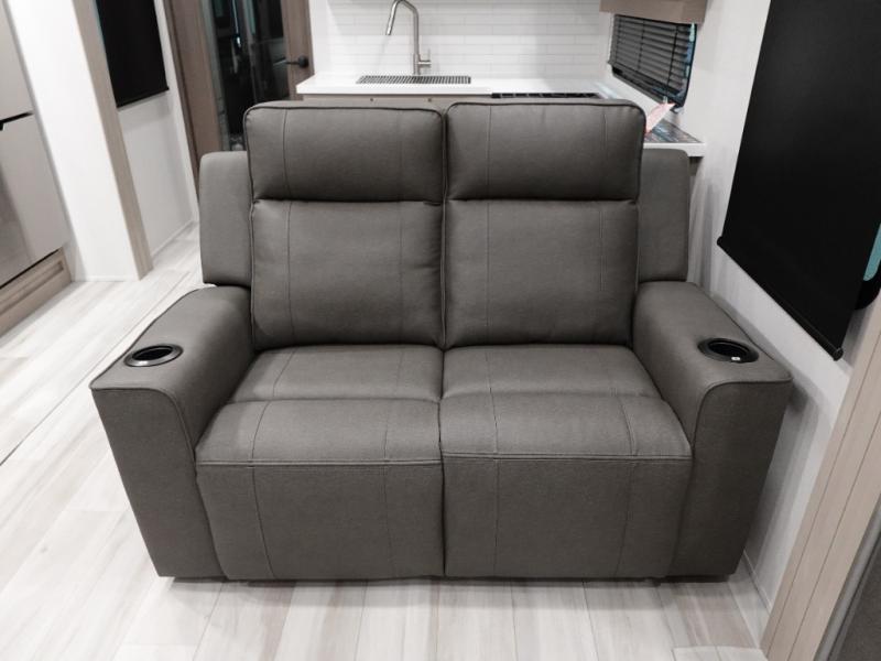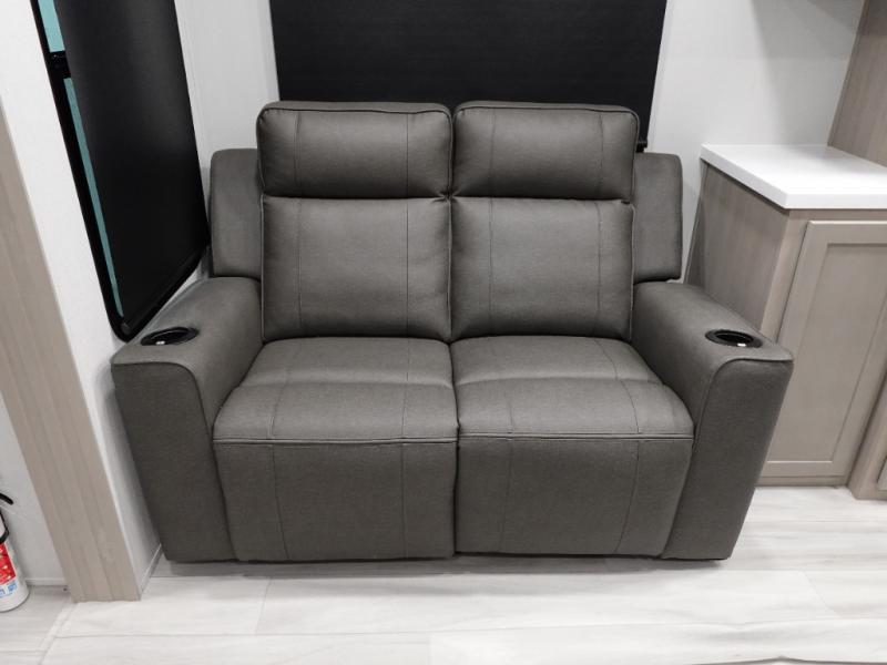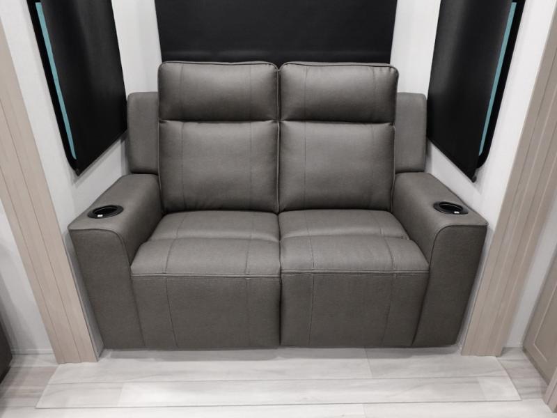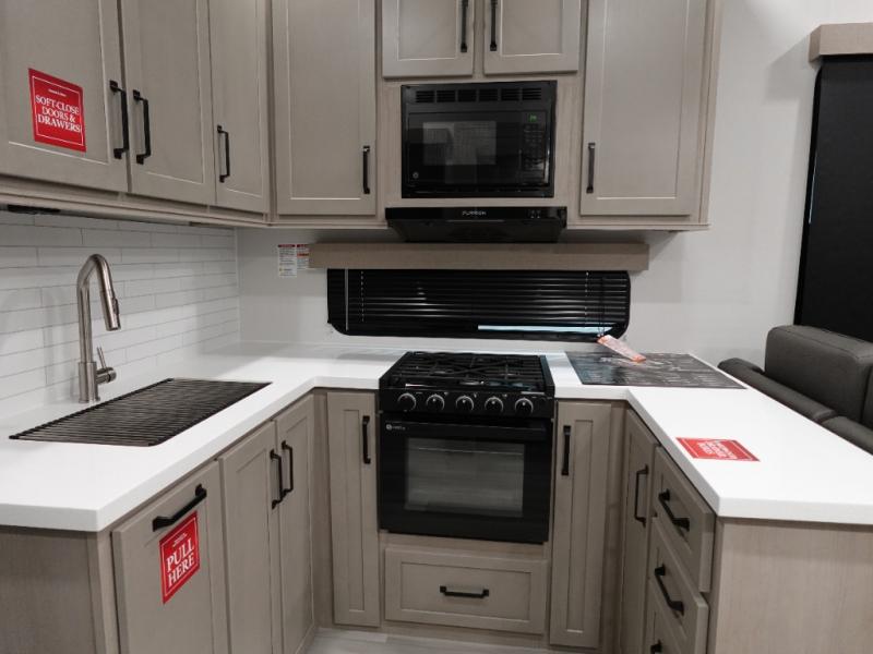 A 14' separate garage in this toy hauler offers plenty of space for your off-road toys! You will also appreciate the two entry doors, and flip-up pet dish. The rear ramp door can even be converted into a patio, plus there are exterior speakers to keep the party going. Everyone will love hanging out in the separate living area with a fireplace at the entertainment center, two theater seating slides, and a third theater seating. The fully equipped kitchen has everything you need to prepare delicious home cooked meals. The front private bedroom offers an escape to rest and relax on a queen bed for the next ride!