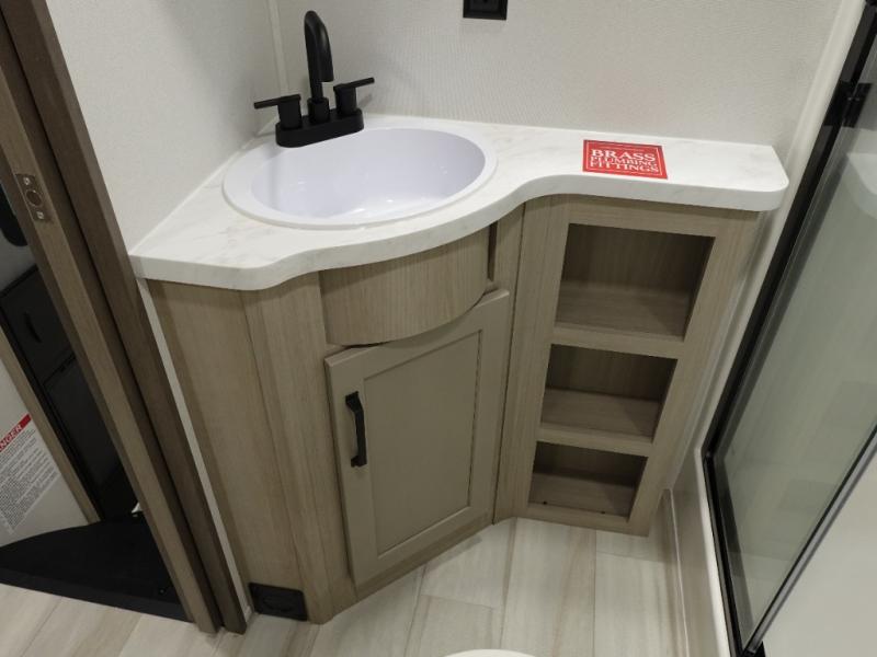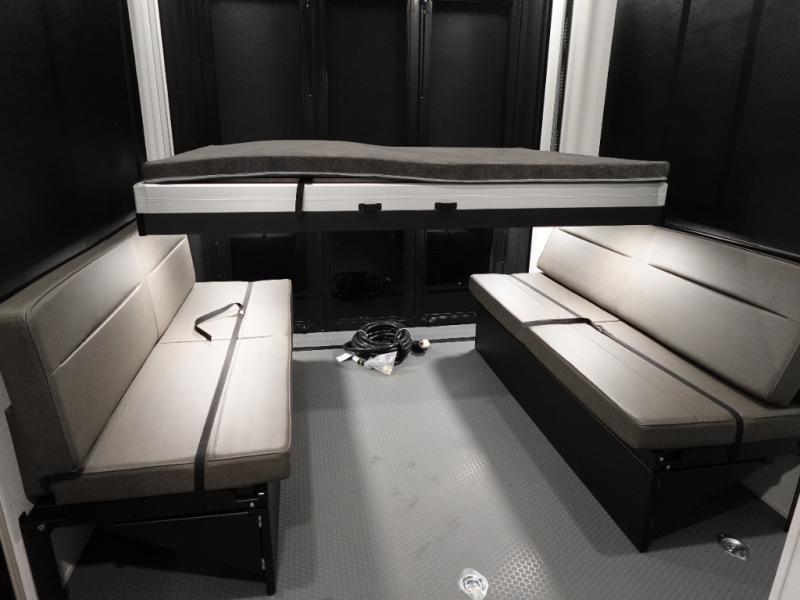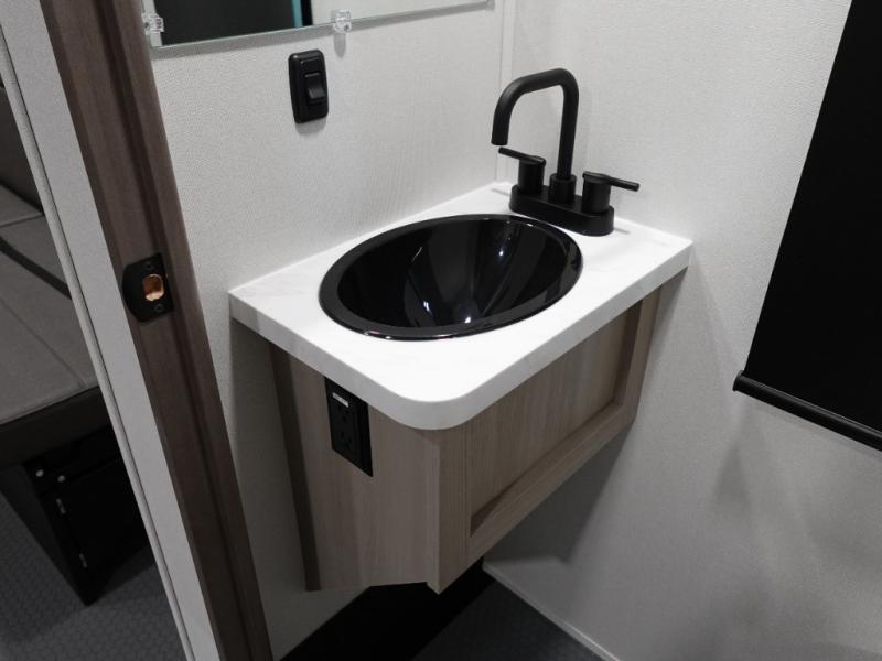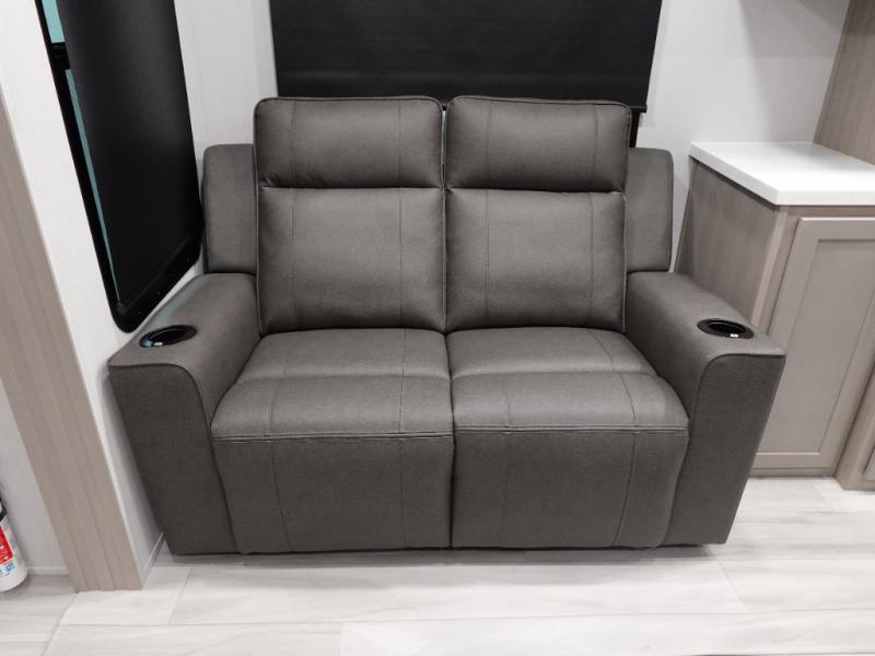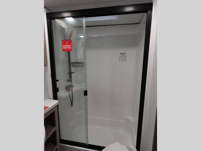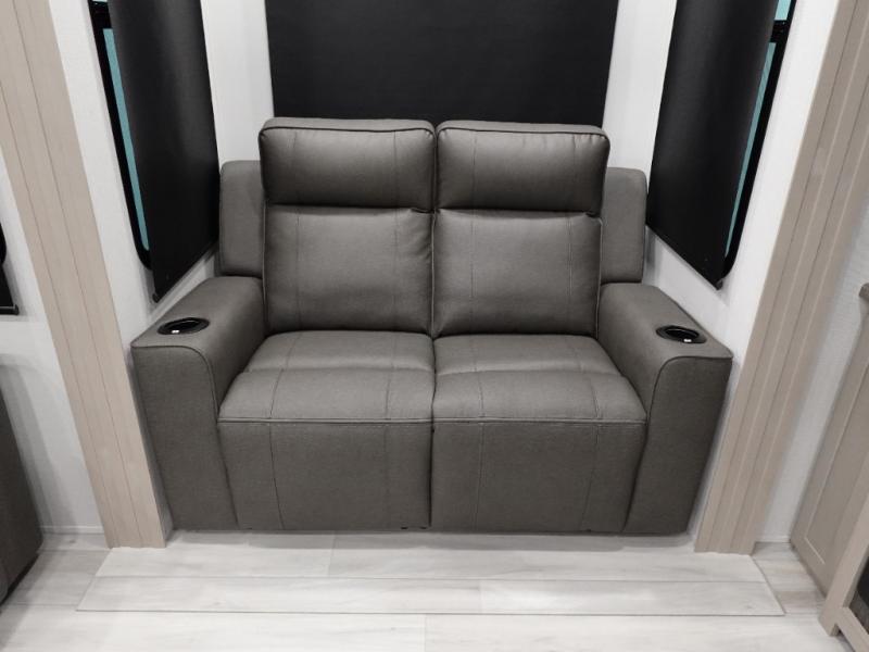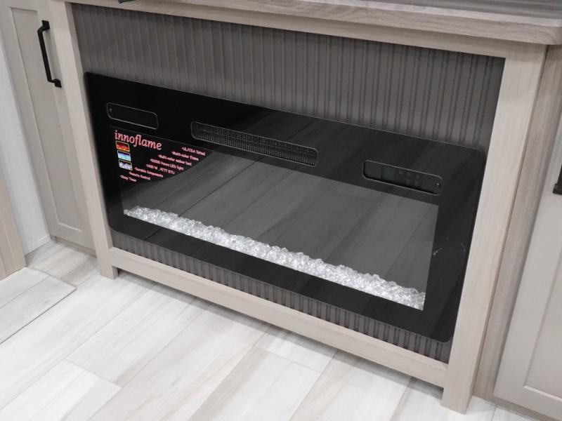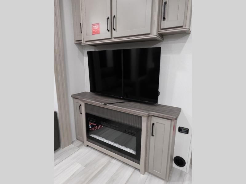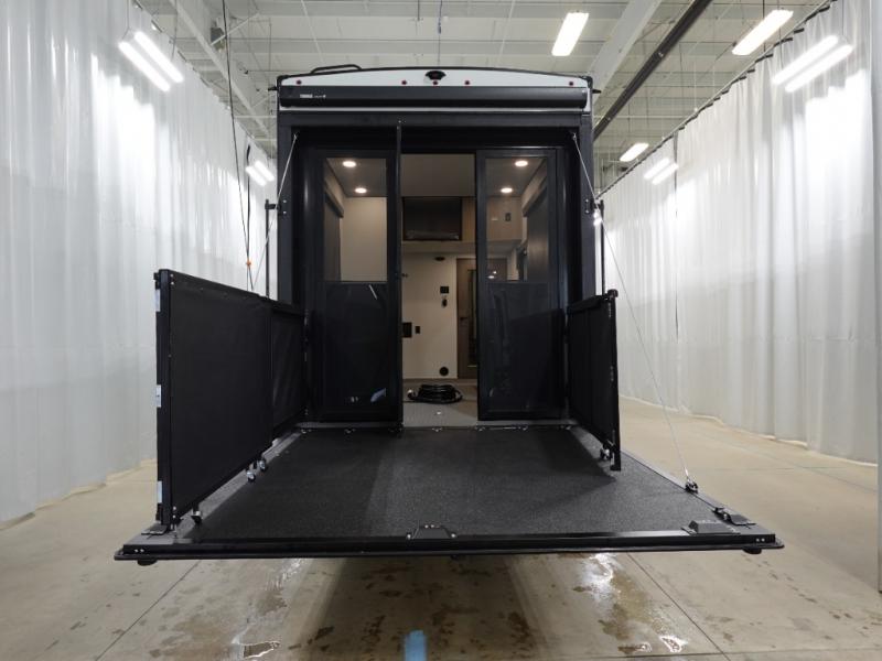 A 14' separate garage in this toy hauler offers plenty of space for your off-road toys! You will appreciate the convenience of having a full bathroom with a walk-in shower and a half bath in the garage area. You will also appreciate the two entry doors, and flip-up pet dish. The rear ramp door can even be converted into a patio, plus there are exterior speakers to keep the party going. Everyone will love hanging out in the separate living area with a fireplace at the entertainment center, two theater seating slides, and a third theater seating. The fully equipped kitchen has everything you need to prepare delicious home cooked meals. The front private bedroom offers an escape to rest and relax on a queen bed for the next ride!
