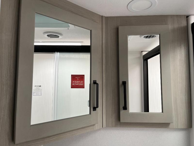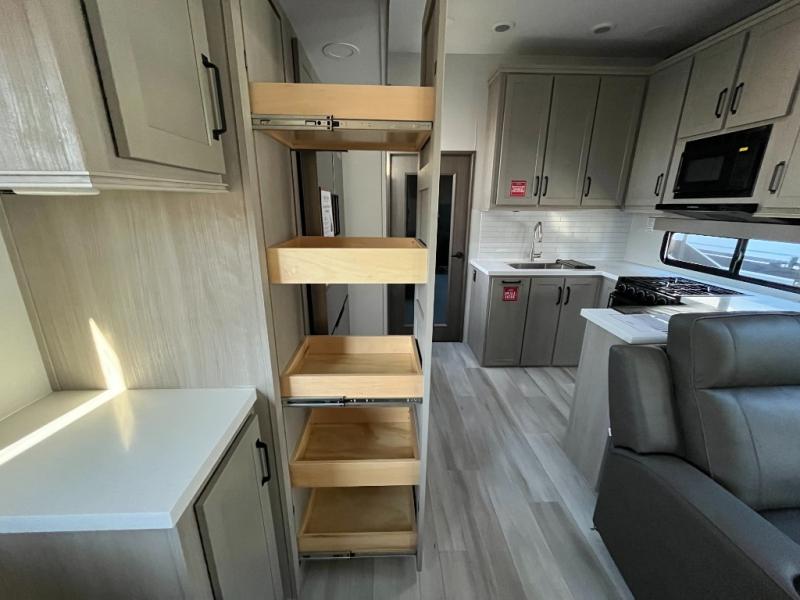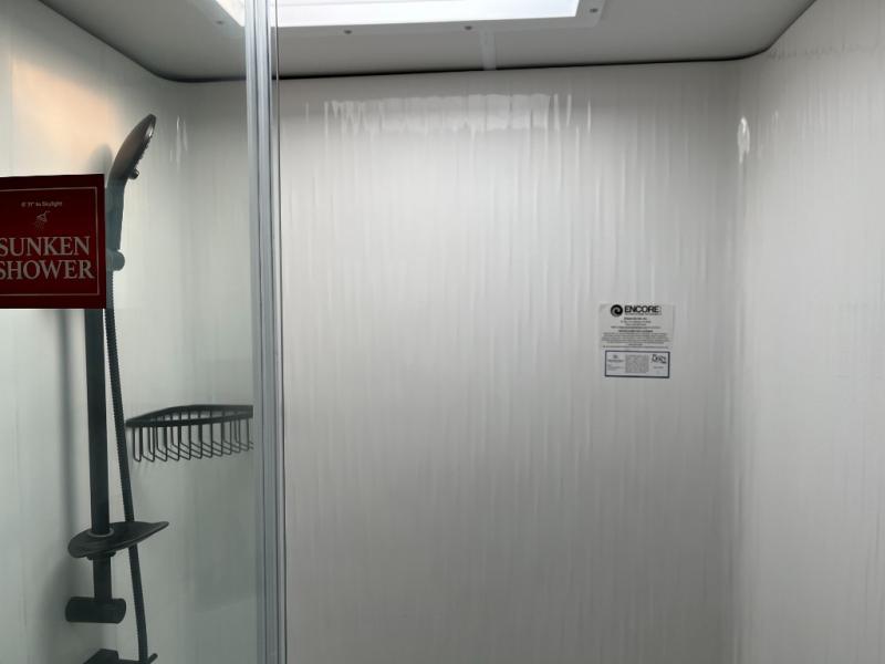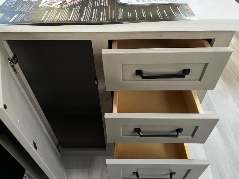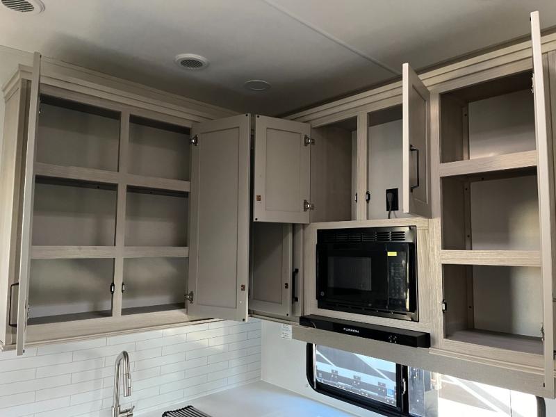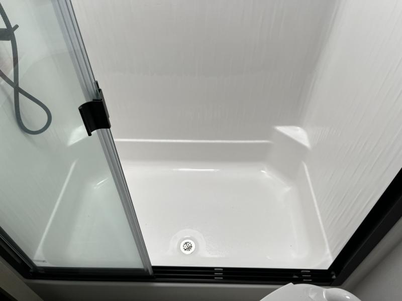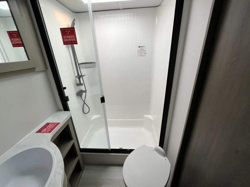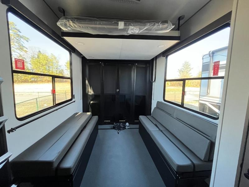 A 14' separate garage in this toy hauler offers plenty of space for your off-road toys! You will appreciate the convenience of having a full bathroom with a walk-in shower and you can even add an optional half bath to the garage area. You will also appreciate the two entry doors, and flip-up pet dish. The rear ramp door can even be converted into a patio, plus there are exterior speakers to keep the party going. Everyone will love hanging out in the separate living area with a fireplace at the entertainment center, two theater seating slides, and a third theater seating. The fully equipped kitchen has everything you need to prepare delicious home cooked meals. The front private bedroom offers an escape to rest and relax on a queen bed for the next ride!