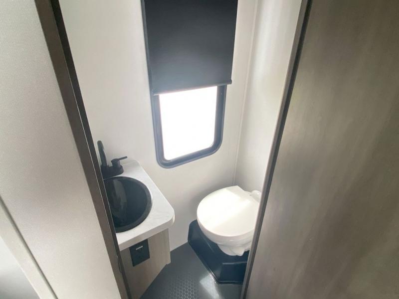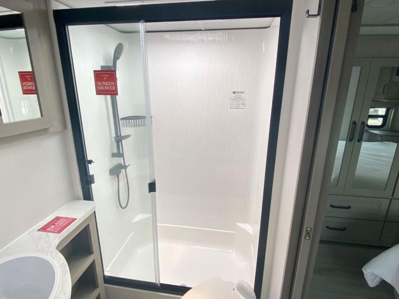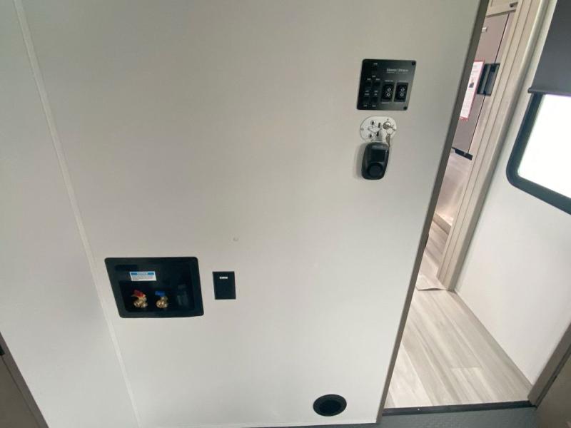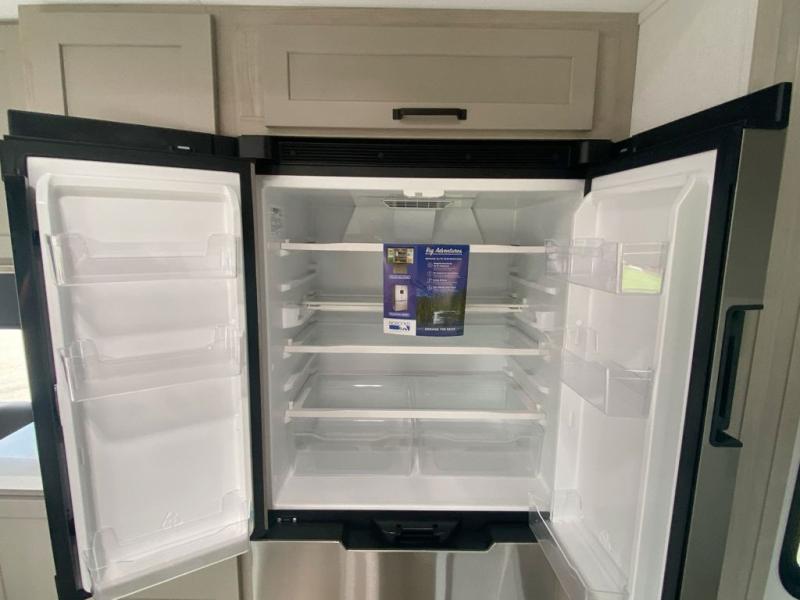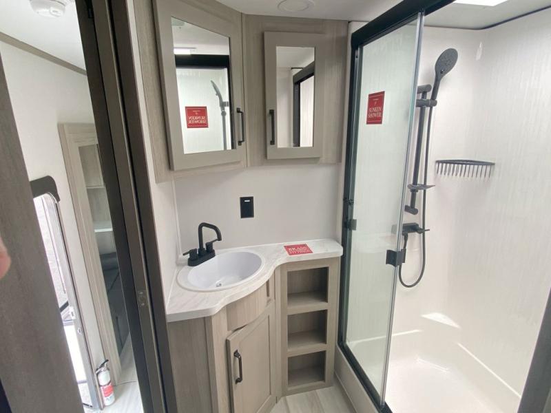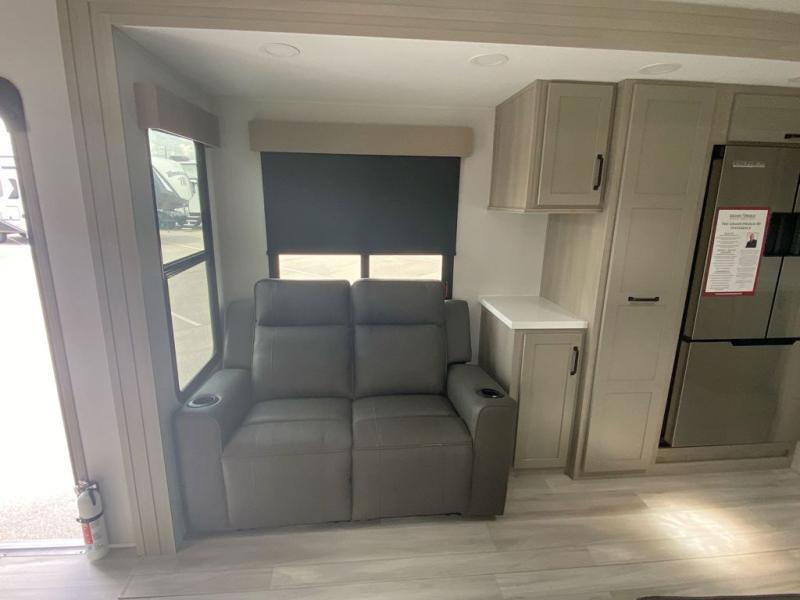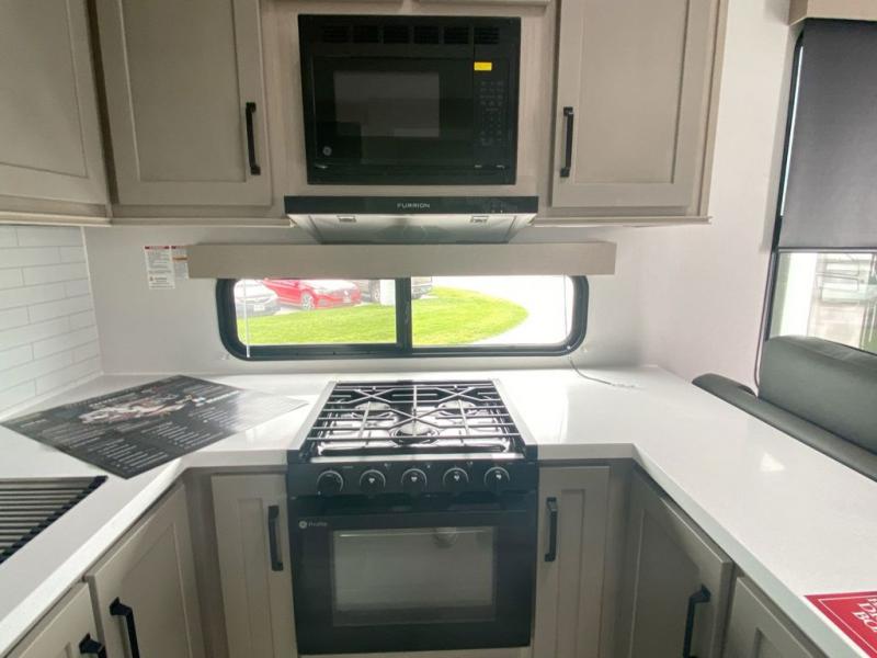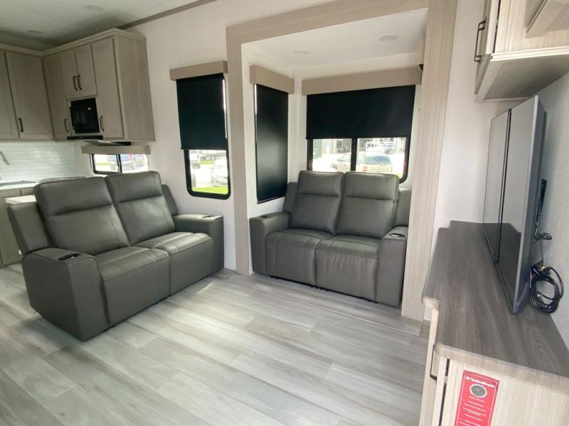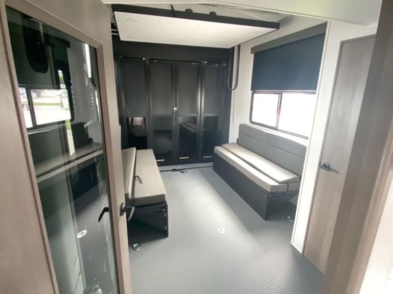 A 14' separate garage in this toy hauler offers plenty of space for your off-road toys! You will appreciate the convenience of having a full bathroom with a walk-in shower and you can even add an optional half bath to the garage area. You will also appreciate the two entry doors, and flip-up pet dish. The rear ramp door can even be converted into a patio, plus there are exterior speakers to keep the party going. Everyone will love hanging out in the separate living area with a fireplace at the entertainment center, two theater seating slides, and a third theater seating. The fully equipped kitchen has everything you need to prepare delicious home cooked meals. The front private bedroom offers an escape to rest and relax on a queen bed for the next ride!