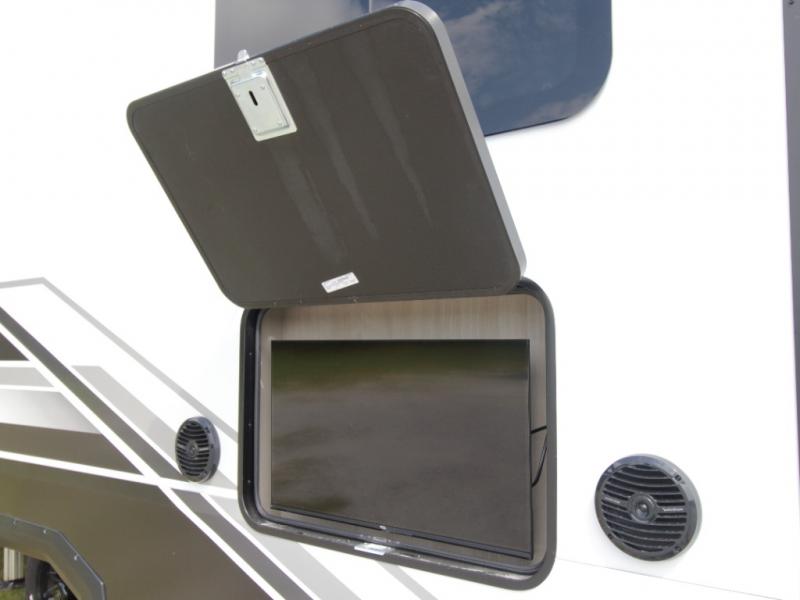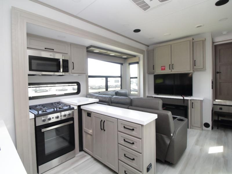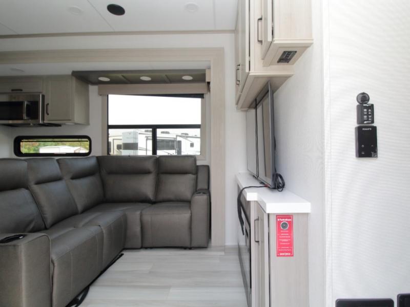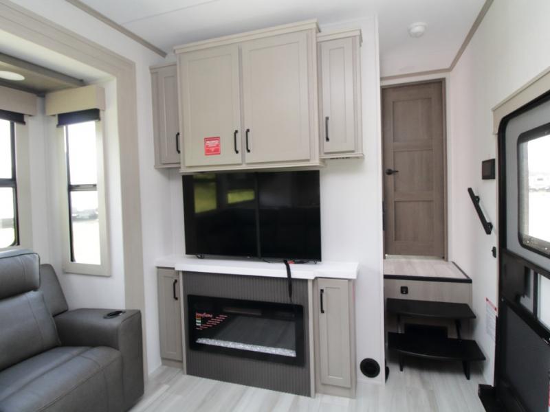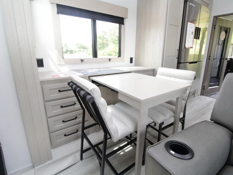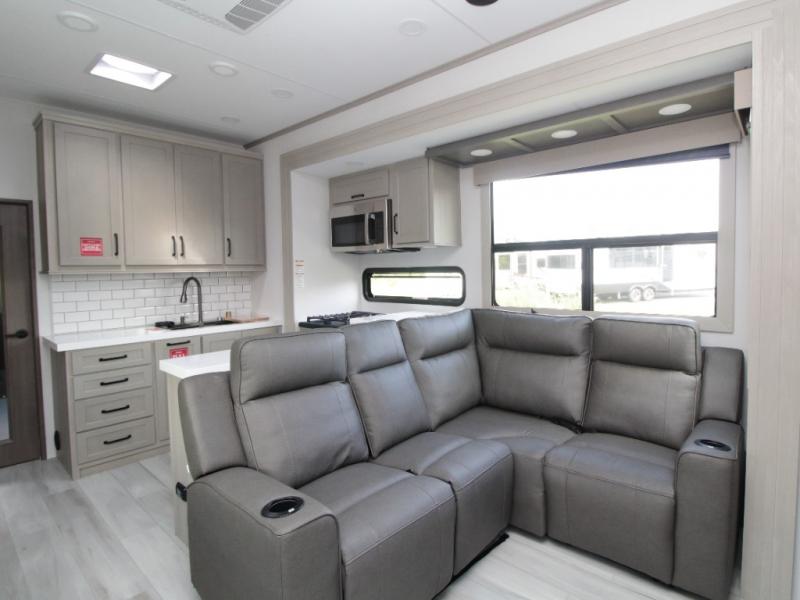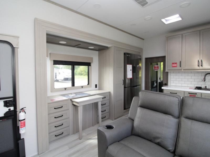 In the main living area, enjoy the open feel of dual opposing slides, an L-shaped reclining sofa, a hybrid desk/dinette, and a cozy fireplace for relaxing evenings.
