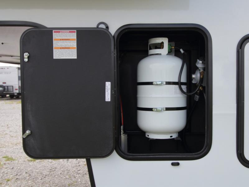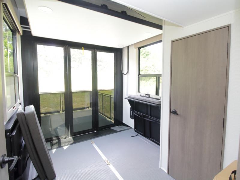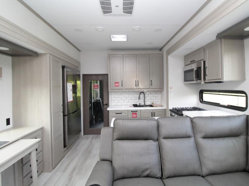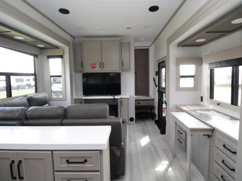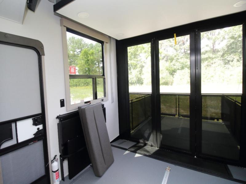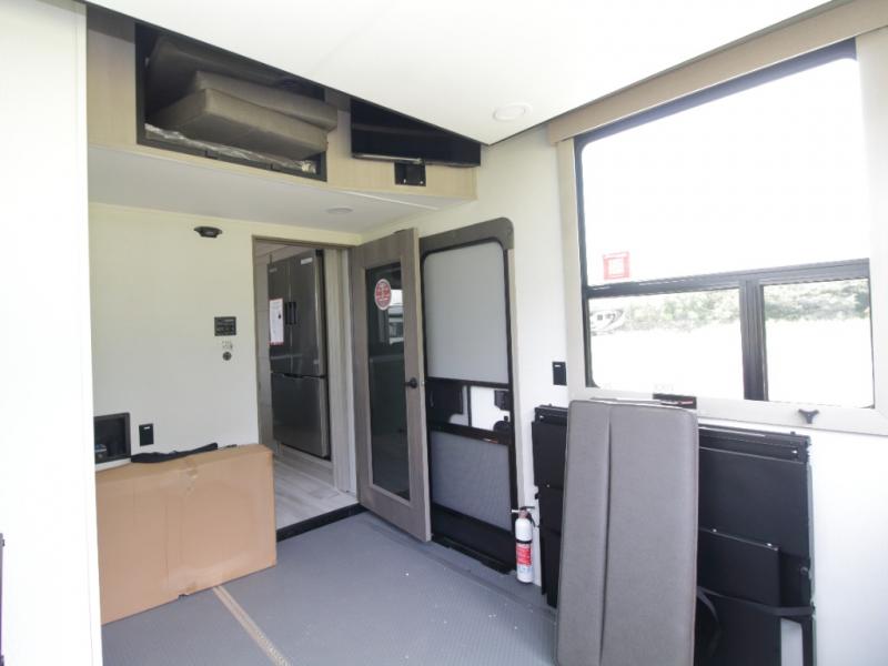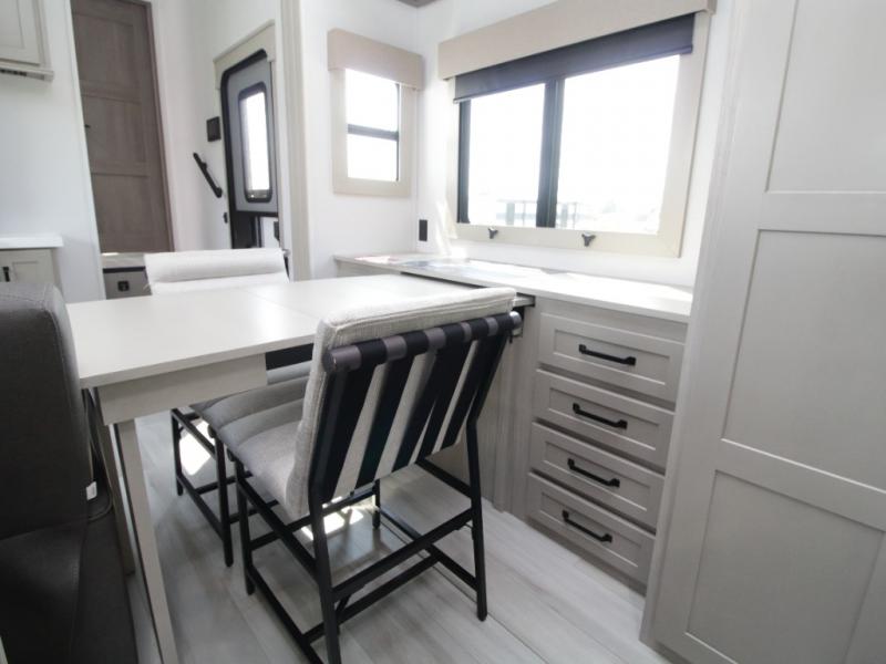 In the main living area, enjoy the open feel of dual opposing slides, an L-shaped reclining sofa, a hybrid desk/dinette, and a cozy fireplace for relaxing evenings.