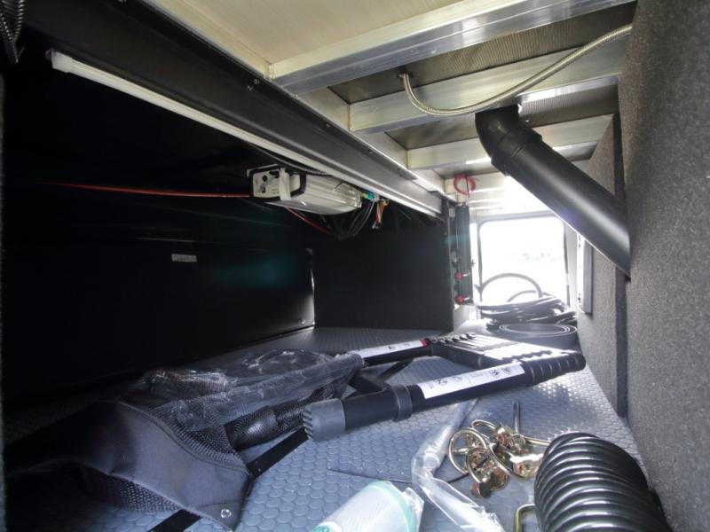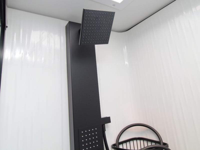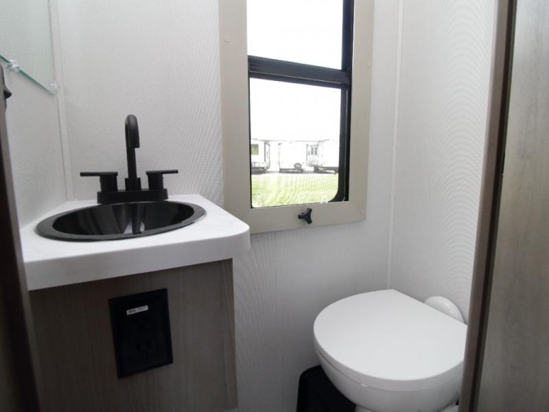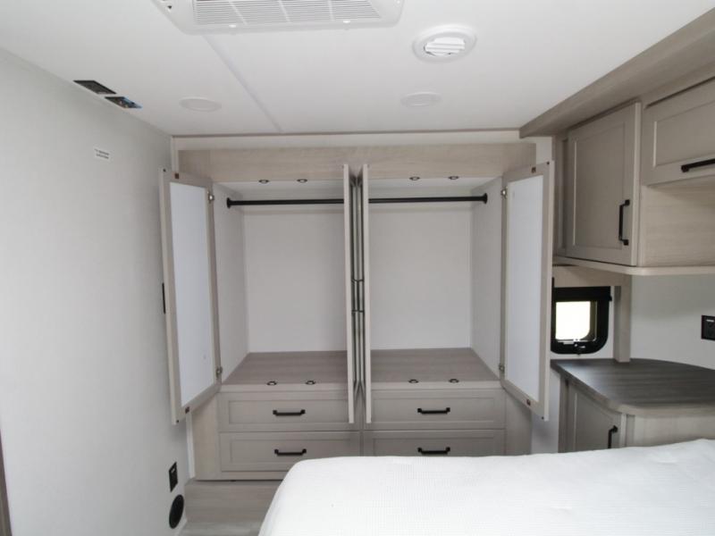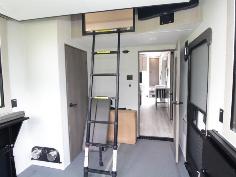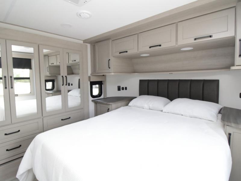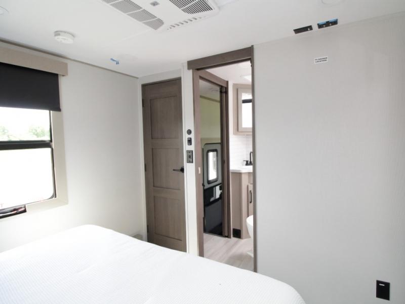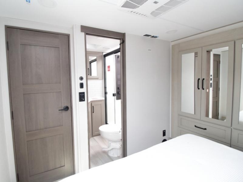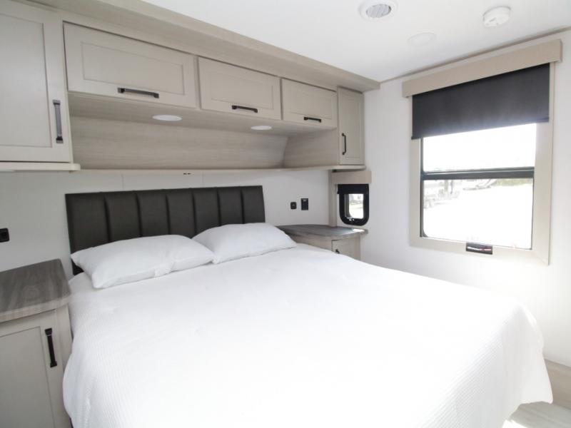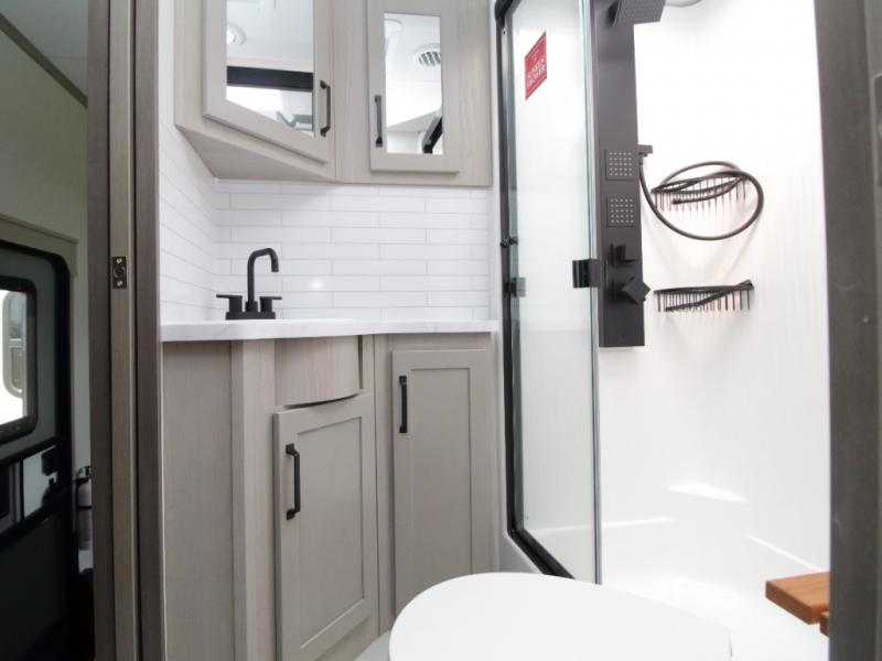 Up front, the private master suite offers a queen bed (optional king), a wardrobe slide, overhead cabinets, and direct access to the dual-entry bath with a fiberglass shower and glass door.