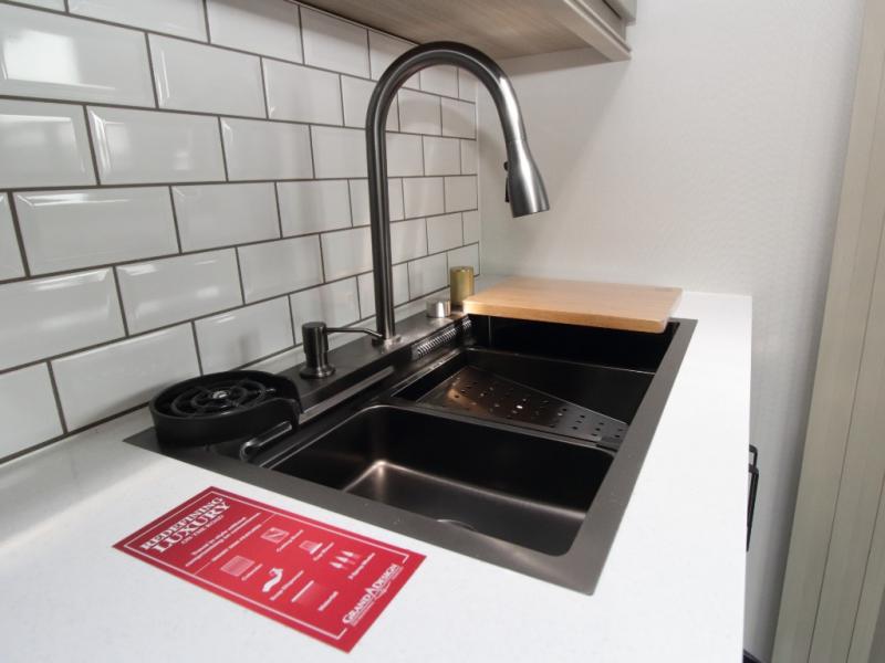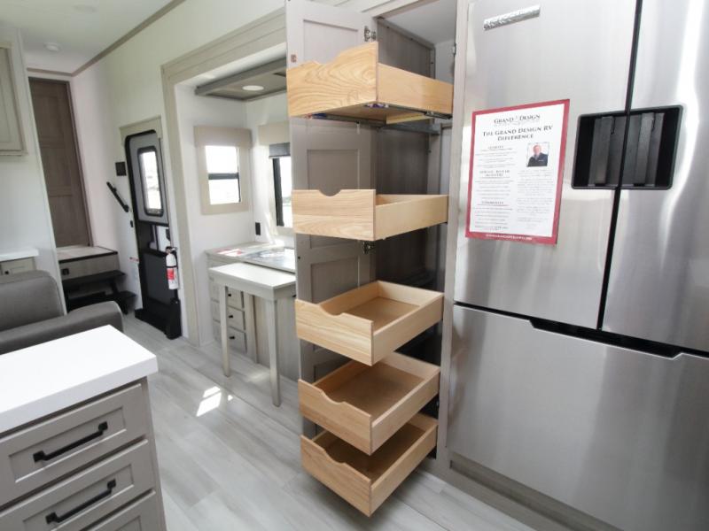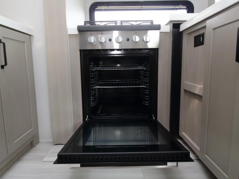 The kitchen is equipped with a 20 cu. ft. refrigerator, professional-grade cooktop, and large pantry for all your camping meals.