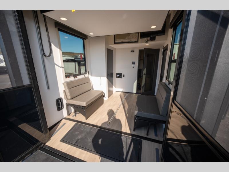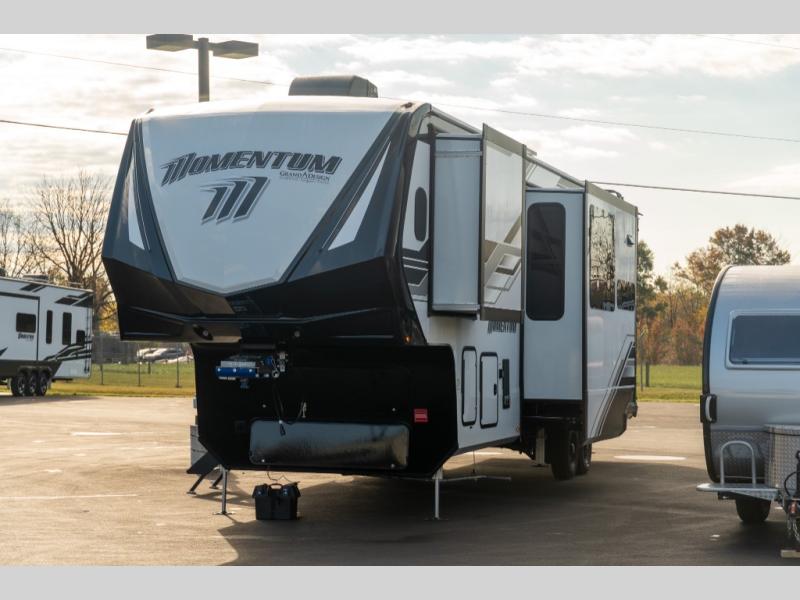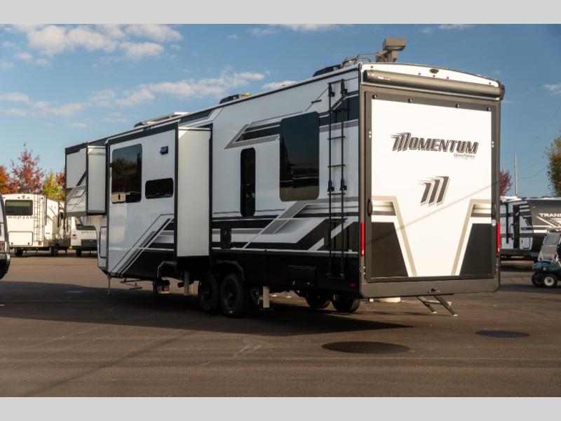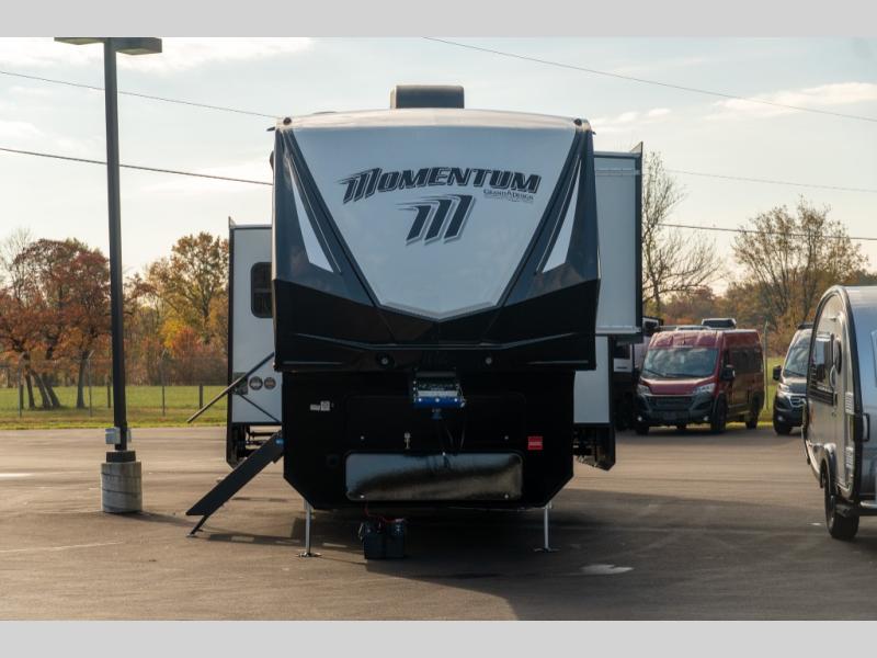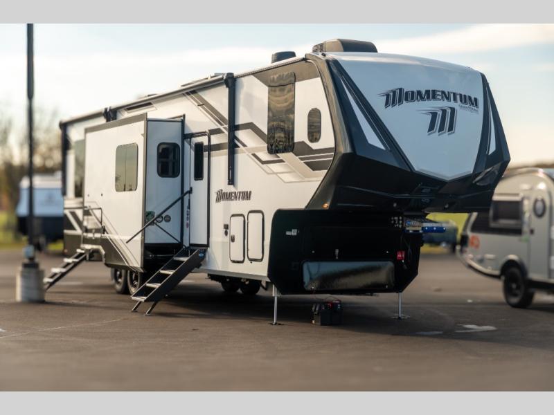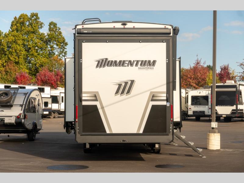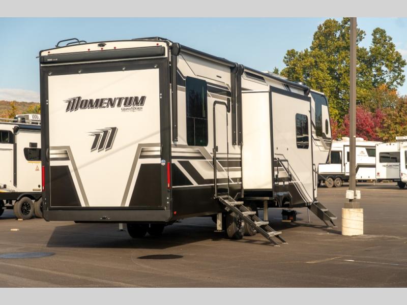 With any Momentum M-Class toy hauler by Grand Design, you will enjoy luxury at every turn! They have been constructed to a superior standard with a thermal roof design, triple insulated main floor and garage floor, and a Rail-Tite underbelly seal that will allow you to camp in all elements. Each model also features an 8' 5" wide body chassis with a wide rail design, no wheel wheels, and a dovetail entry for easier loading. The Stealth A/C system provides maximum cooling power, and the CRE3000 suspension system means you can enjoy a smooth tow each time. You will love the luxurious interior with a professional grade stainless steel cooktop, interior color changing LED accent lighting, a fiberglass shower with a glass door, and solid surface countertops.