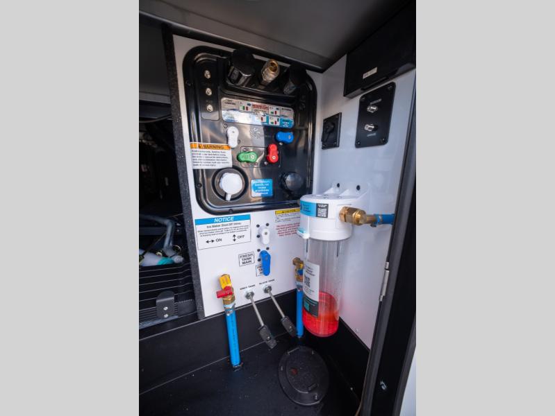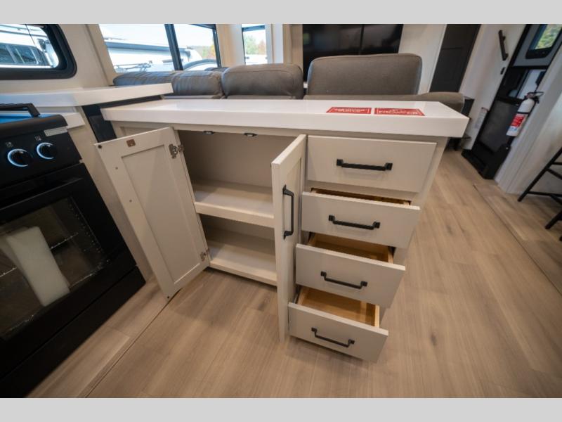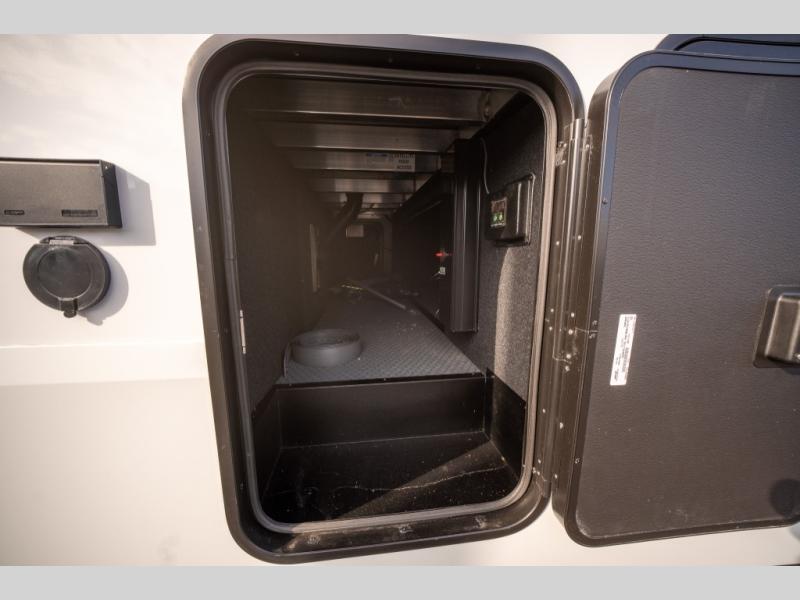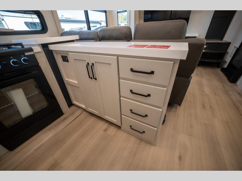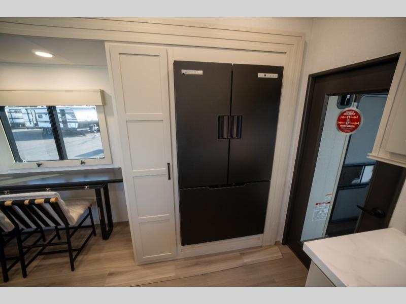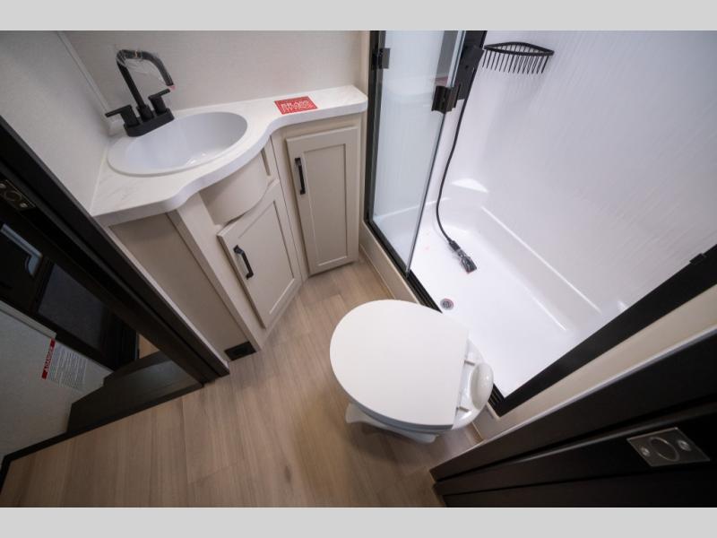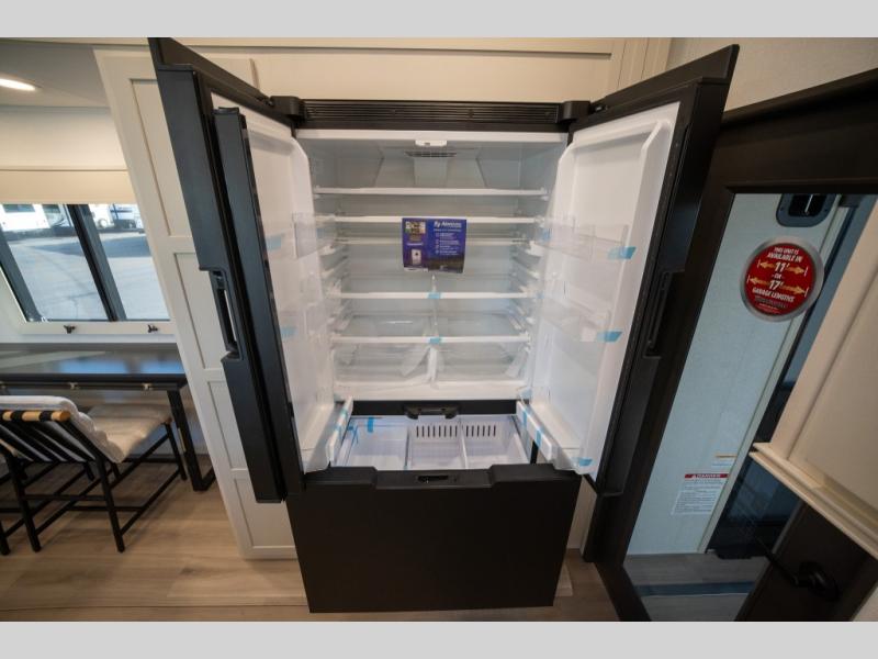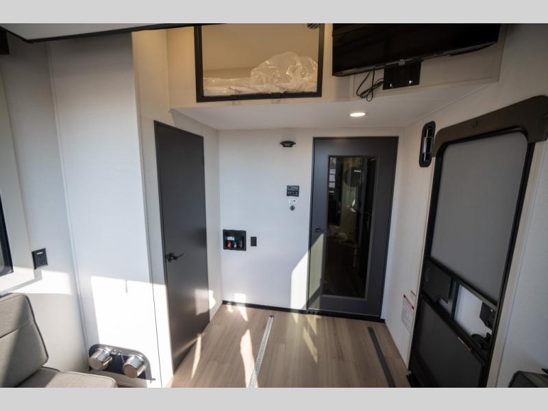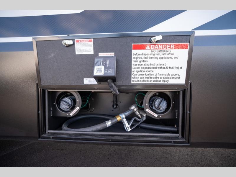 Spend your days at the campground kicking up mud with this toy hauler in tow! once you've unloaded your toys from the ramp door, you can use the 60 gallon fuel station to fill up and head out on a trail! The overhead bed provides a place for guests to sleep, and there is an optional Liftsuite System for more sleeping space if needed. There is even an optional half bath here if you choose to make this space more accommodating. Head to the middle kitchen and living area where you'll enjoy generous counter space to prep meals, a spacious 20 cu. ft. refrigerator, an L-shaped sofa with recline, plus a hybrid desk/dinette that will serve as a dining or working space. The dual entry bath creates a front master bedroom you are sure to love. There is a queen bed with an optional king bed, plenty of overhead storage, and a wardrobe slide to keep your things organized.