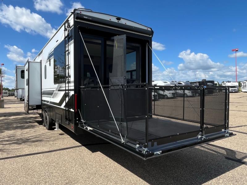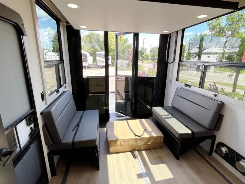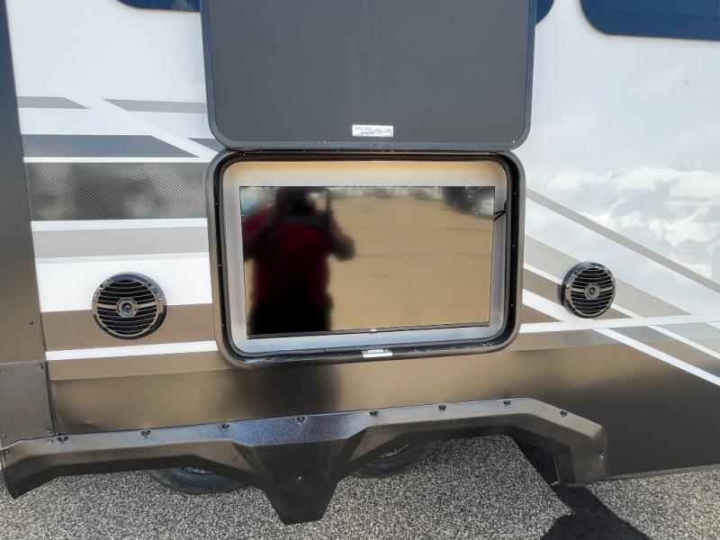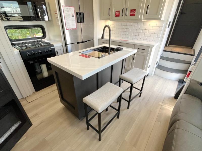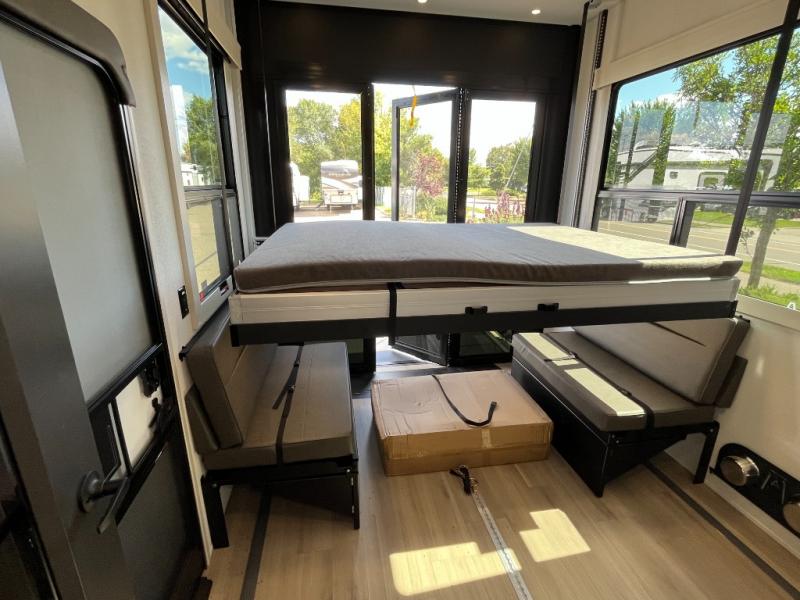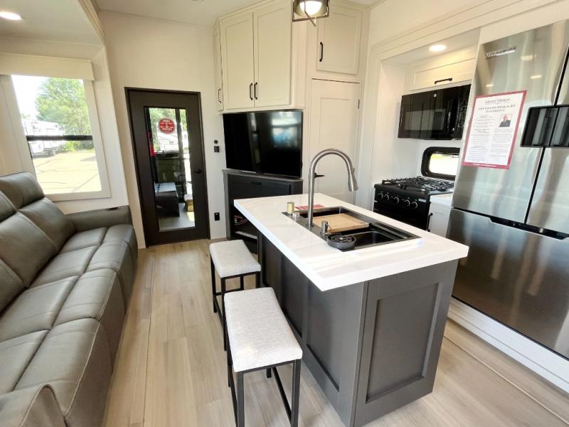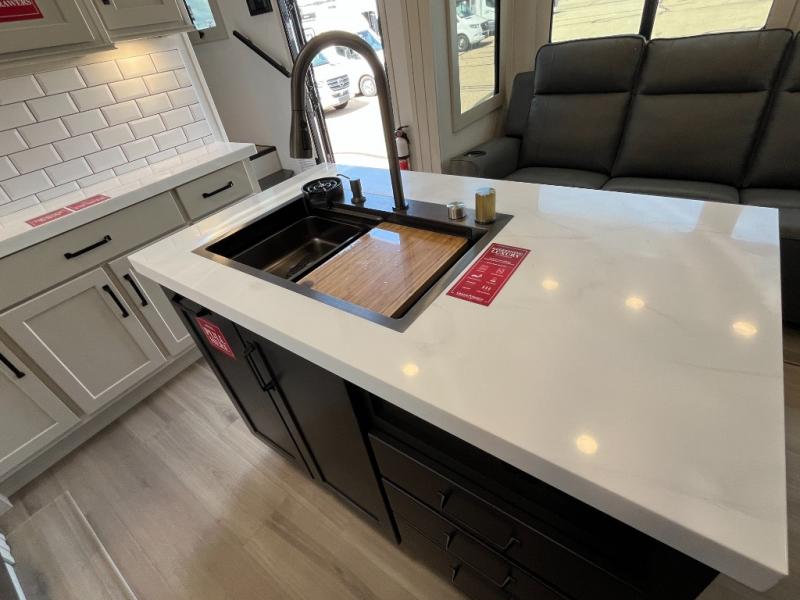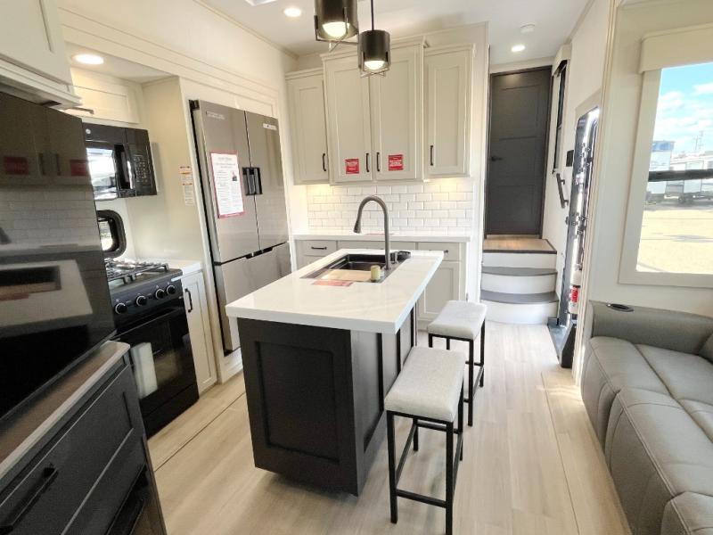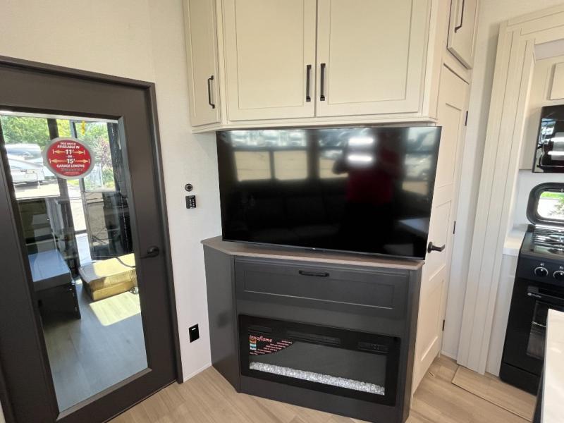 Traveling with friends and family can be comfortable when you have a full double entry bathroom and a half bath available when camping and enjoying the trails on your off-road toys! You will have an 11' garage space that can become a second living/dining area, and you can add the optional Liftsuite System for more sleeping space. An overhead bed comes standard, along with a super sofa in the main living area where guests can sleep. Everyone can watch the LED TV when waiting for dinner, and enjoy the fireplace on those chiller nights. The kitchen island offers a sink to wash dishes, extra counter space for serving meals and two stools to dine at. The cook will love all the upgraded appliances, and the space thanks to the slide. The front bedroom gives you a queen bed slide with a king bed option, lots of clothing space, and a slide top dresser for even more storage.