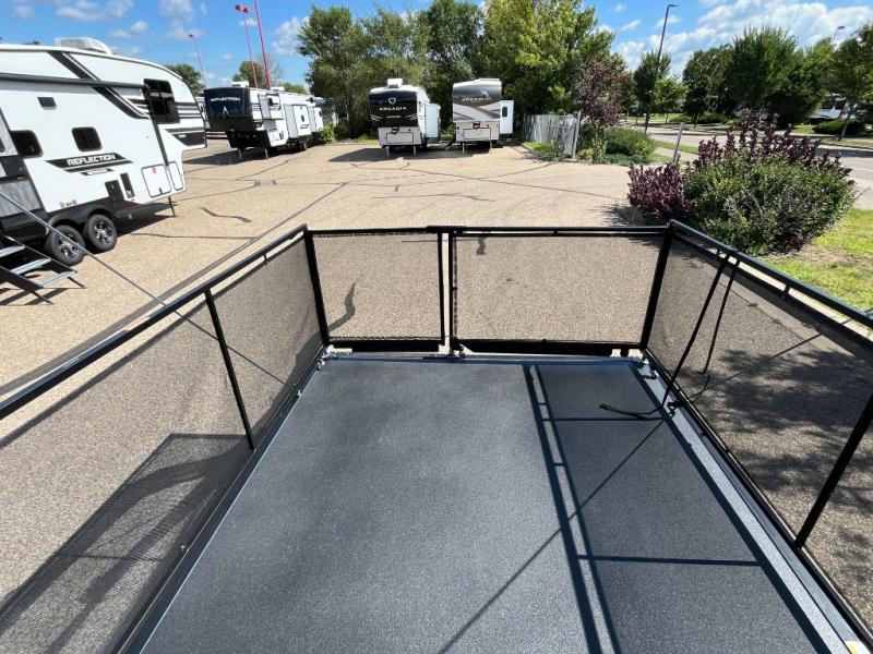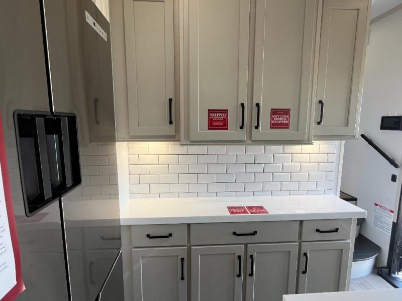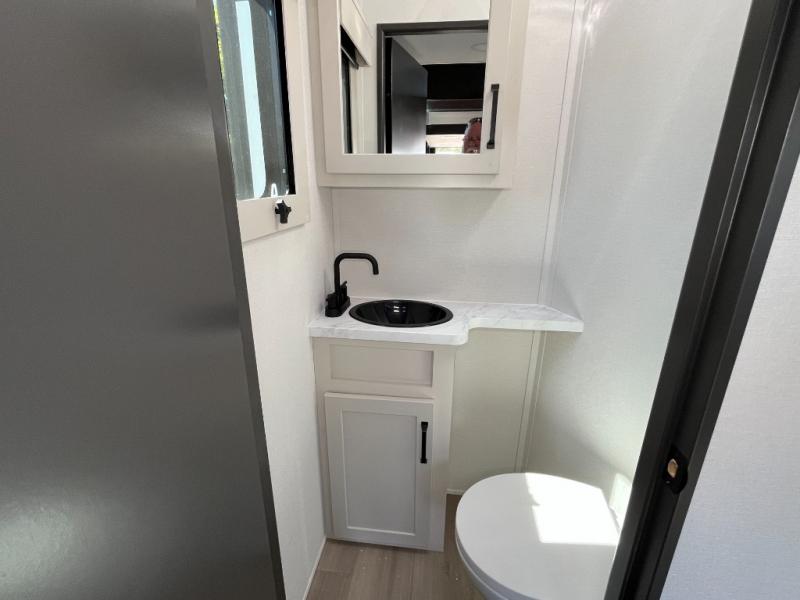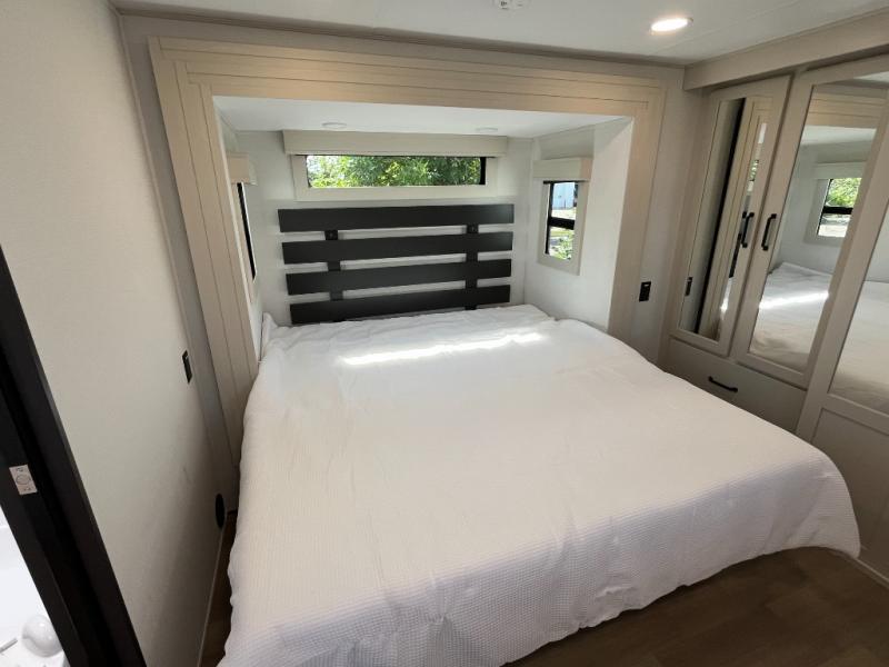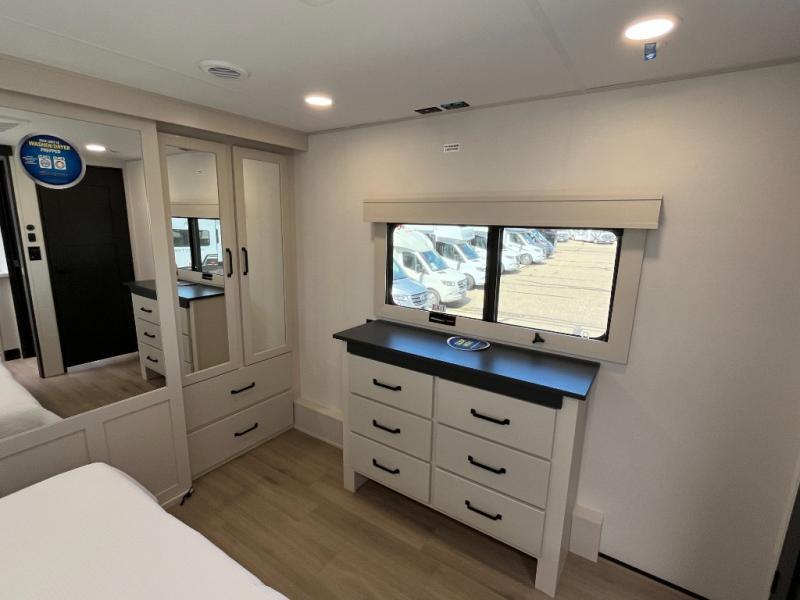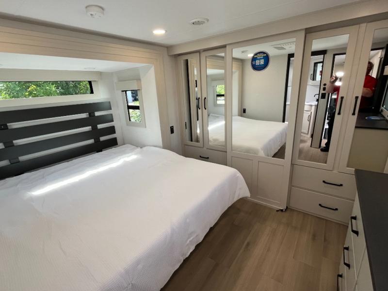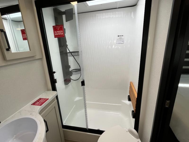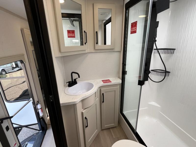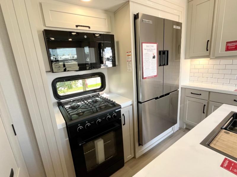 Traveling with friends and family can be comfortable when you have a full double entry bathroom and a half bath available when camping and enjoying the trails on your off-road toys! You will have an 11' garage space that can become a second living/dining area, and you can add the optional Liftsuite System for more sleeping space. An overhead bed comes standard, along with a super sofa in the main living area where guests can sleep. Everyone can watch the LED TV when waiting for dinner, and enjoy the fireplace on those chiller nights. The kitchen island offers a sink to wash dishes, extra counter space for serving meals and two stools to dine at. The cook will love all the upgraded appliances, and the space thanks to the slide. The front bedroom gives you a queen bed slide with a king bed option, lots of clothing space, and a slide top dresser for even more storage.