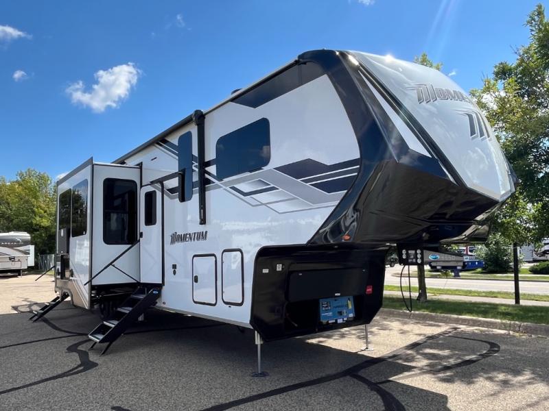 With any Momentum M-Class toy hauler by Grand Design, you will enjoy luxury at every turn! They have been constructed to a superior standard with a thermal roof design, triple insulated main floor and garage floor, and a Rail-Tite underbelly seal that will allow you to camp in all elements. Each model also features an 8' 5" wide body chassis with a wide rail design, no wheel wheels, and a dovetail entry for easier loading. The Stealth A/C system provides maximum cooling power, and the CRE3000 suspension system means you can enjoy a smooth tow each time. You will love the luxurious interior with a professional grade stainless steel cooktop, interior color changing LED accent lighting, a fiberglass shower with a glass door, and solid surface countertops.