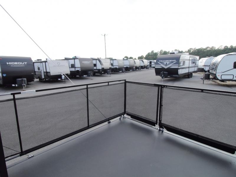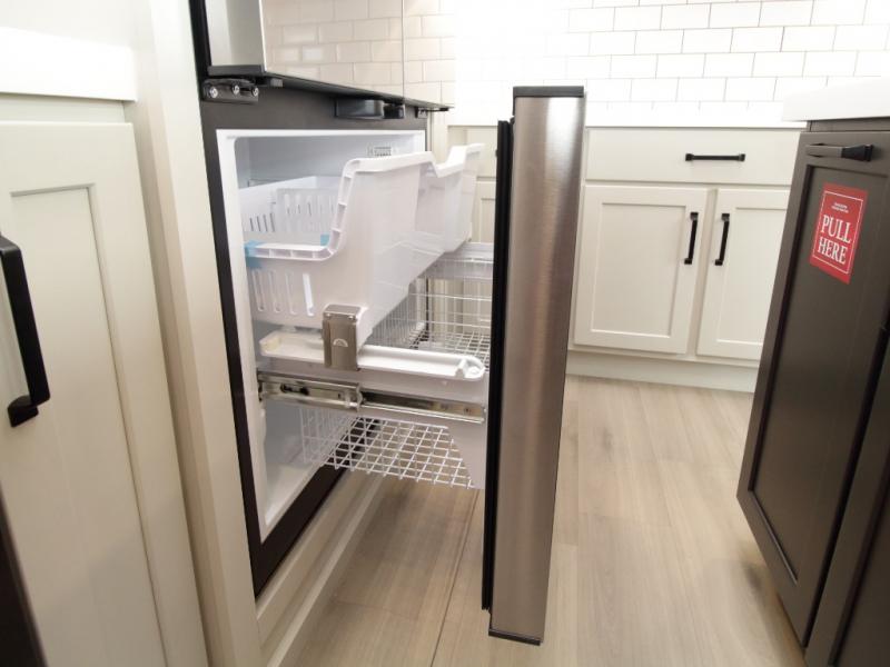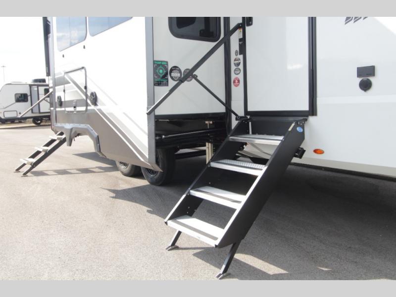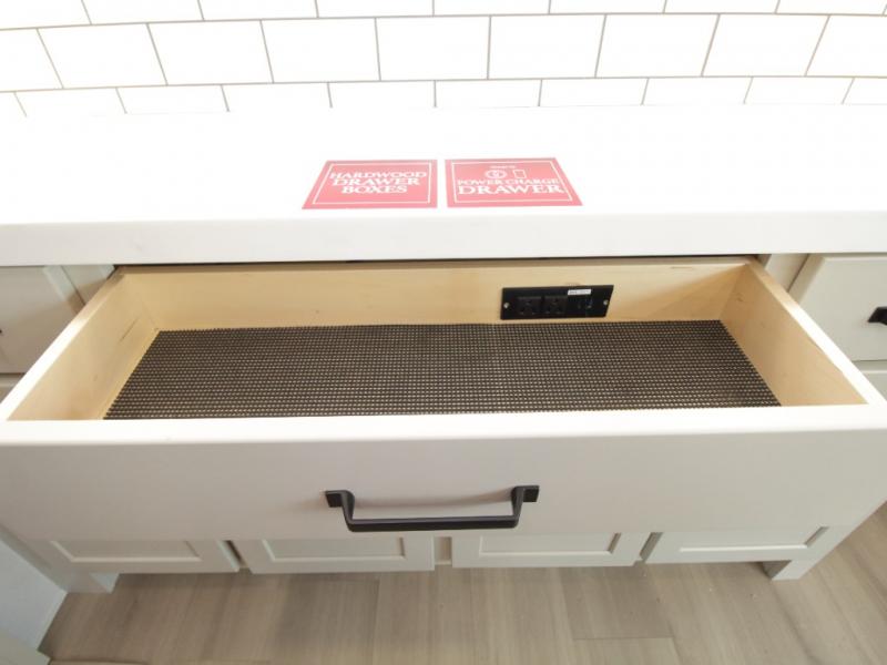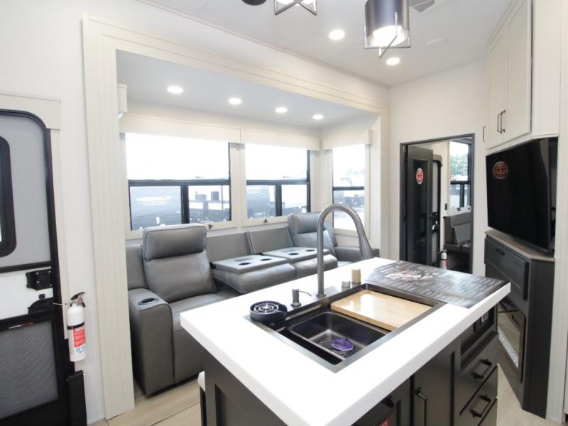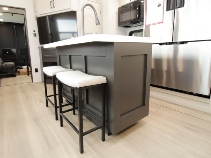 Inside, the chef will love the kitchen island with bar stools, upgraded appliances, and solid surface countertops, all within a spacious slide-out. Relax in the main living area on the super sofa, gather around the LED TV and fireplace, or unwind in the front bedroom with a queen bed slide (king optional), a slide-top dresser, and generous storage.