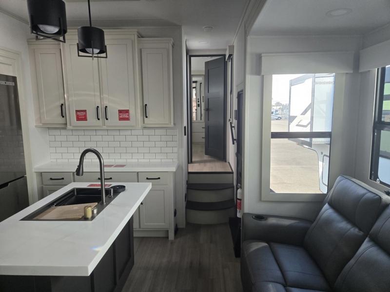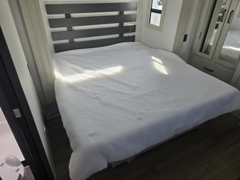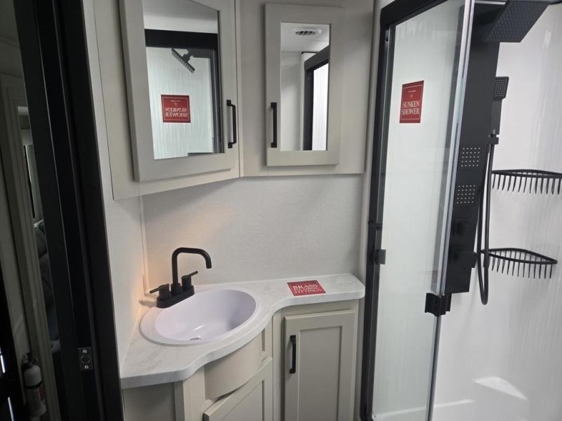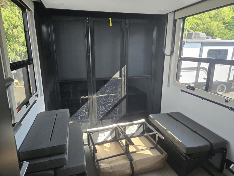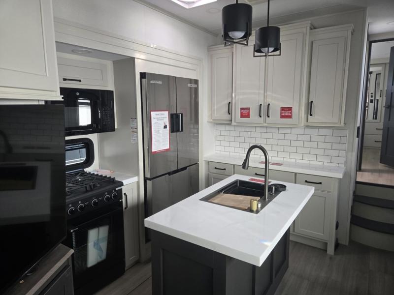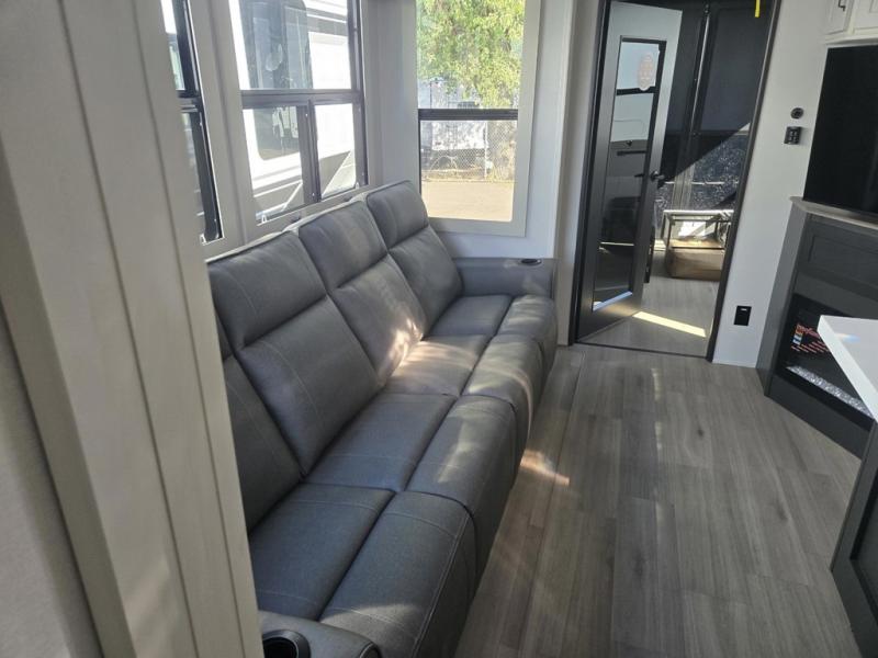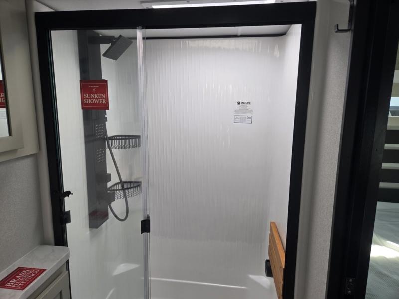 Traveling with friends and family can be comfortable when you have a full double entry bathroom and a half bath available when camping and enjoying the trails on your off-road toys! You will have an 11' garage space that can become a second living/dining area, and you can add the optional Liftsuite System for more sleeping space. An overhead bed comes standard, along with a super sofa in the main living area where guests can sleep. Everyone can watch the LED TV when waiting for dinner, and enjoy the fireplace on those chiller nights. The kitchen island offers a sink to wash dishes, extra counter space for serving meals and two stools to dine at. The cook will love all the upgraded appliances, and the space thanks to the slide. The front bedroom gives you a queen bed slide with a king bed option, lots of clothing space, and a slide top dresser for even more storage.