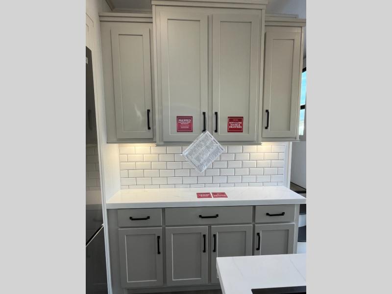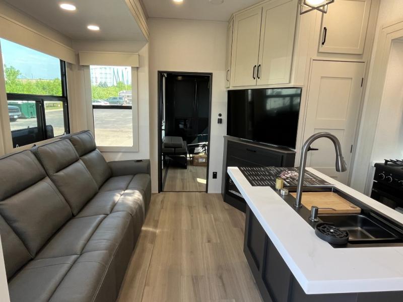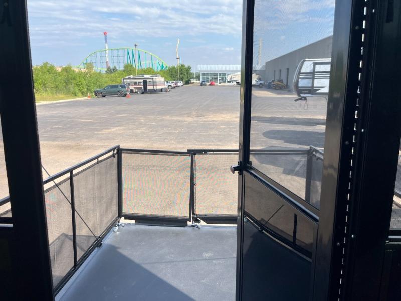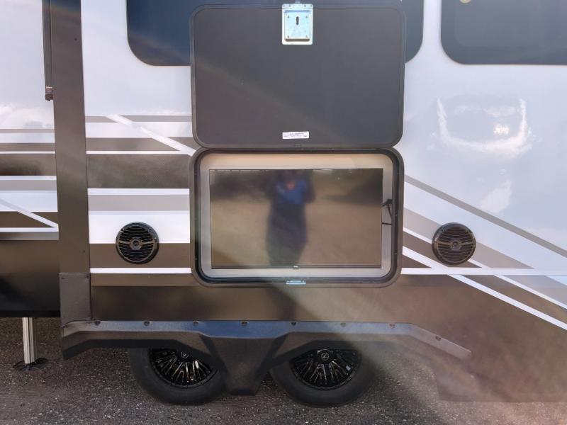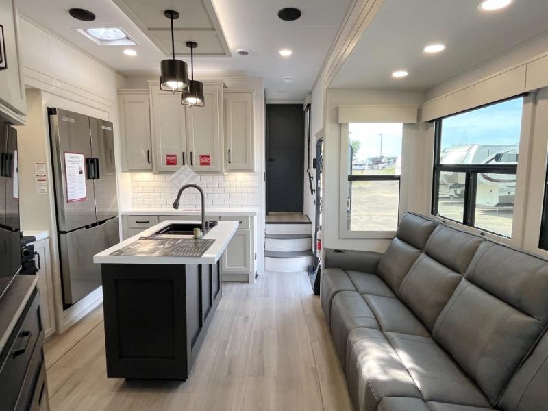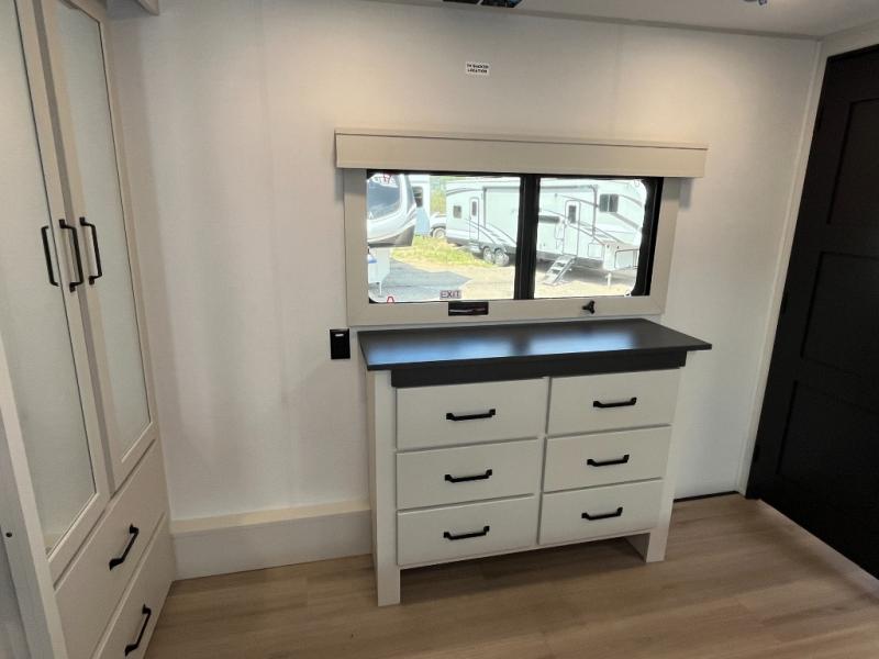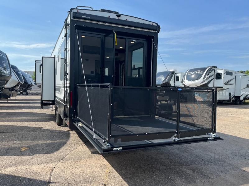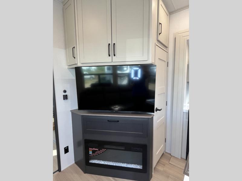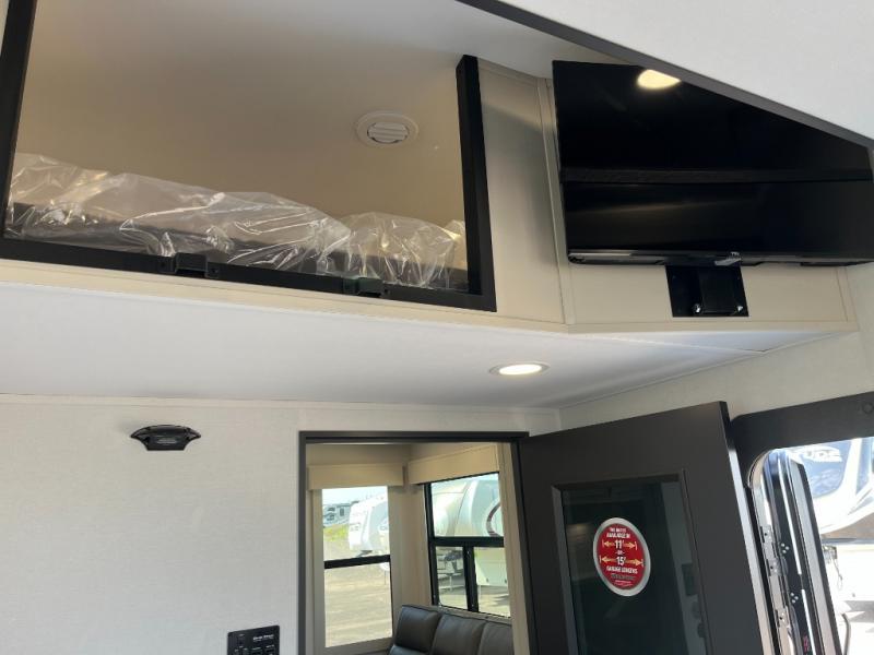 Traveling with friends and family can be comfortable when you have a full double entry bathroom and a half bath available when camping and enjoying the trails on your off-road toys! You will have an 11' garage space that can become a second living/dining area, and you can add the optional Liftsuite System for more sleeping space. An overhead bed comes standard, along with a super sofa in the main living area where guests can sleep. Everyone can watch the LED TV when waiting for dinner, and enjoy the fireplace on those chiller nights. The kitchen island offers a sink to wash dishes, extra counter space for serving meals and two stools to dine at. The cook will love all the upgraded appliances, and the space thanks to the slide. The front bedroom gives you a queen bed slide with a king bed option, lots of clothing space, and a slide top dresser for even more storage.