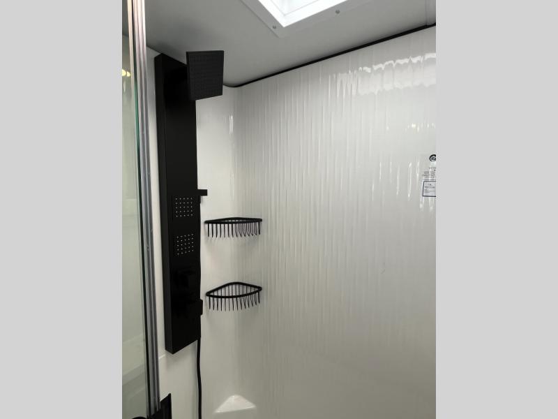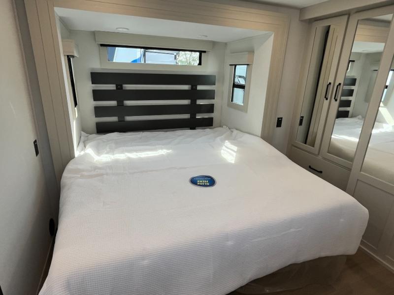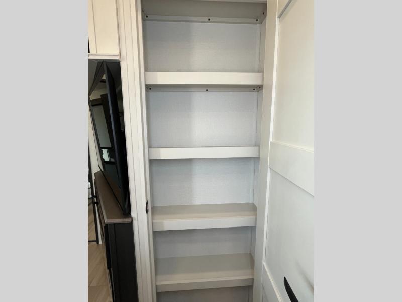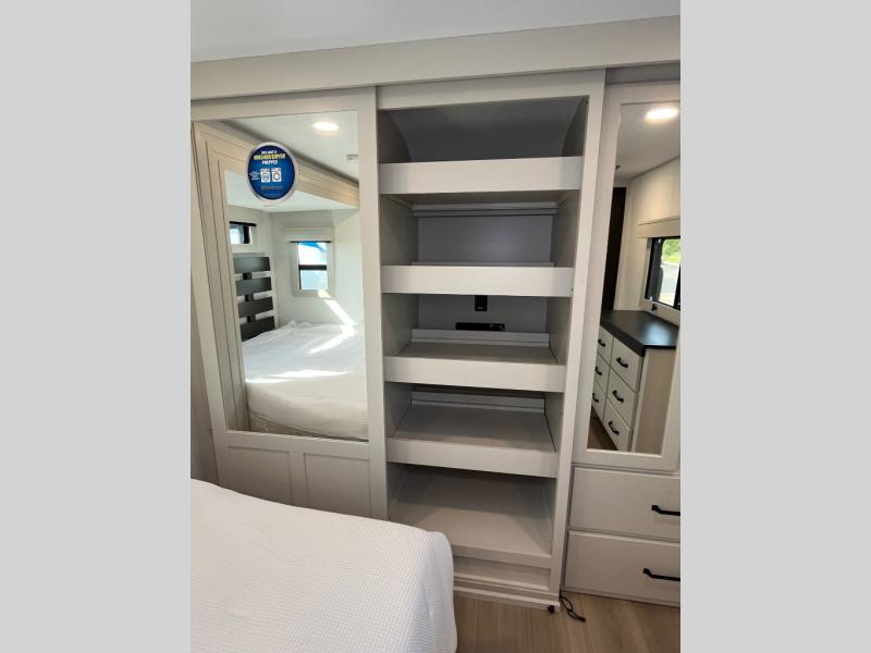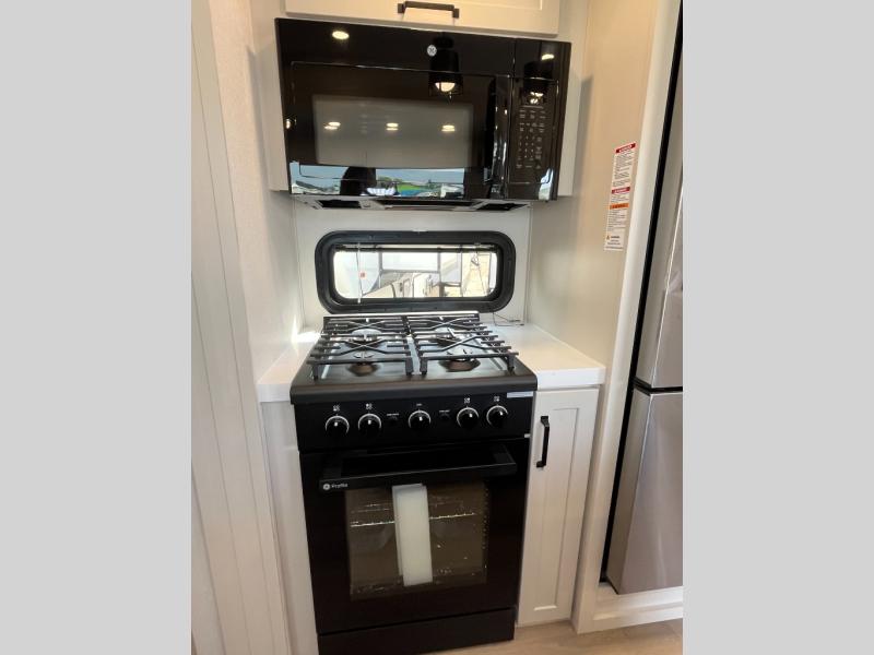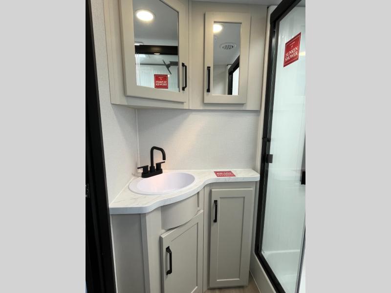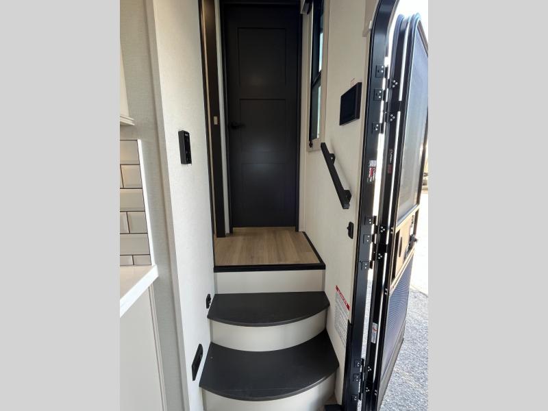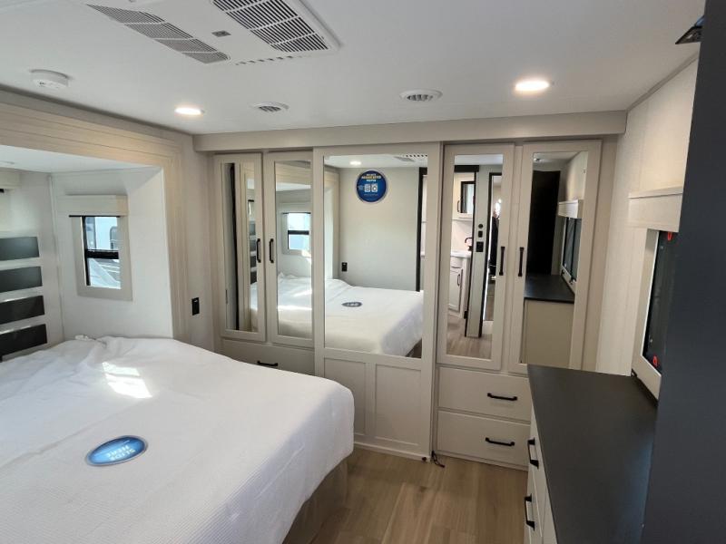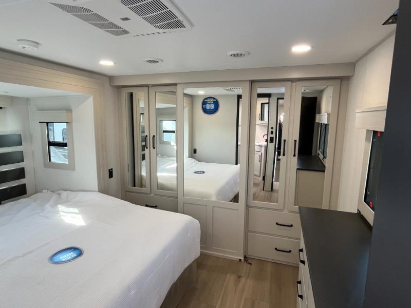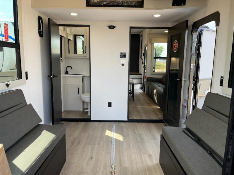Traveling with friends and family can be comfortable when you have a full double entry bathroom and a half bath available when camping and enjoying the trails on your off-road toys! You will have an 11' garage space that can become a second living/dining area, and you can add the optional Liftsuite System for more sleeping space. An overhead bed comes standard, along with a super sofa in the main living area where guests can sleep. Everyone can watch the LED TV when waiting for dinner, and enjoy the fireplace on those chiller nights. The kitchen island offers a sink to wash dishes, extra counter space for serving meals and two stools to dine at. The cook will love all the upgraded appliances, and the space thanks to the slide. The front bedroom gives you a queen bed slide with a king bed option, lots of clothing space, and a slide top dresser for even more storage.