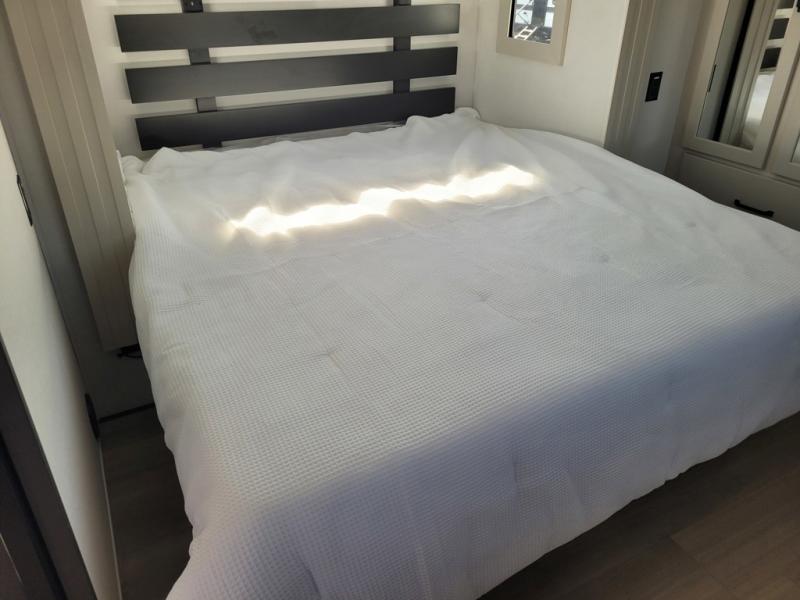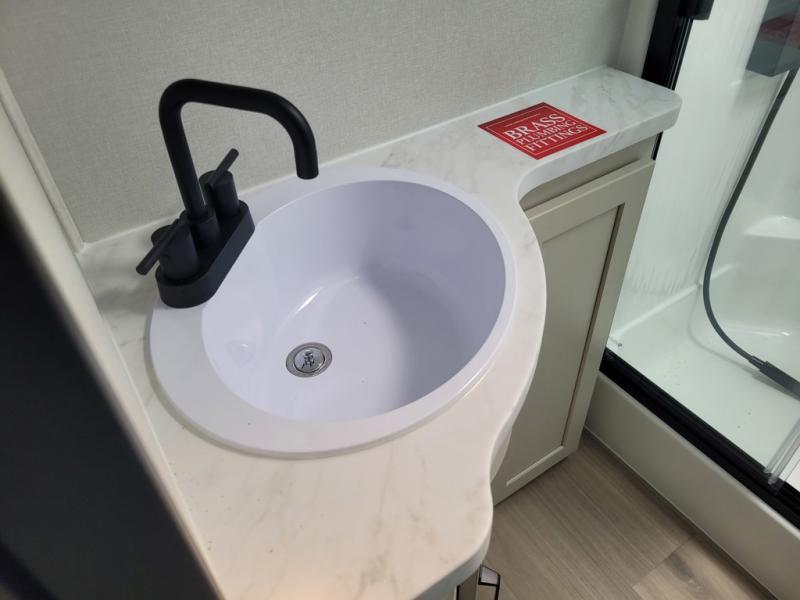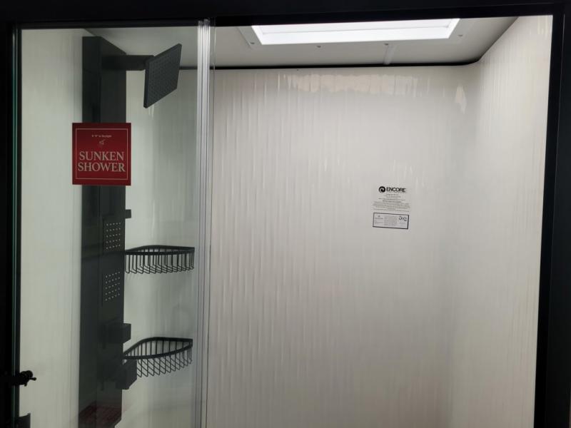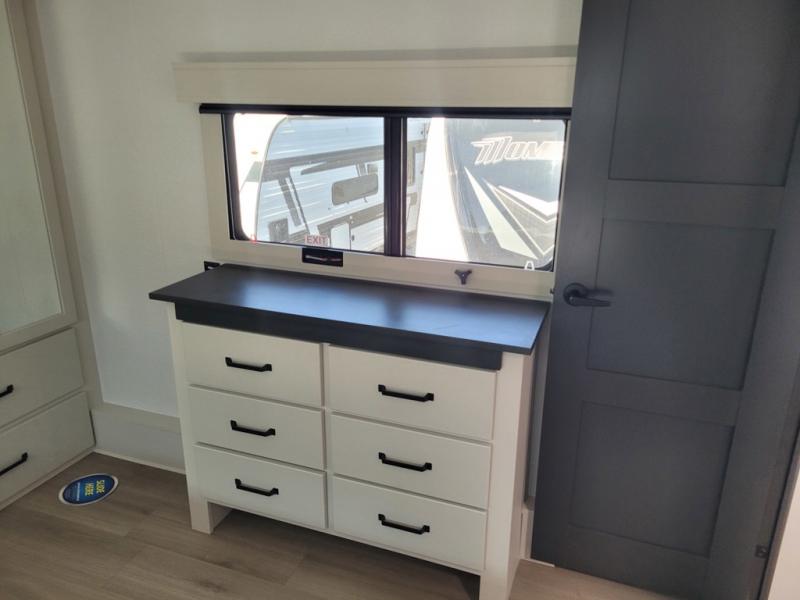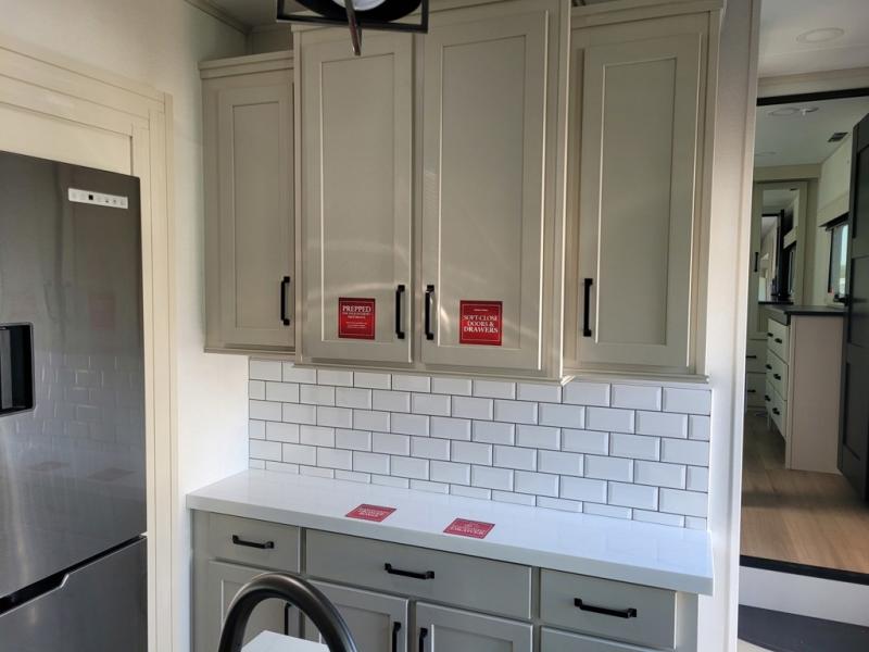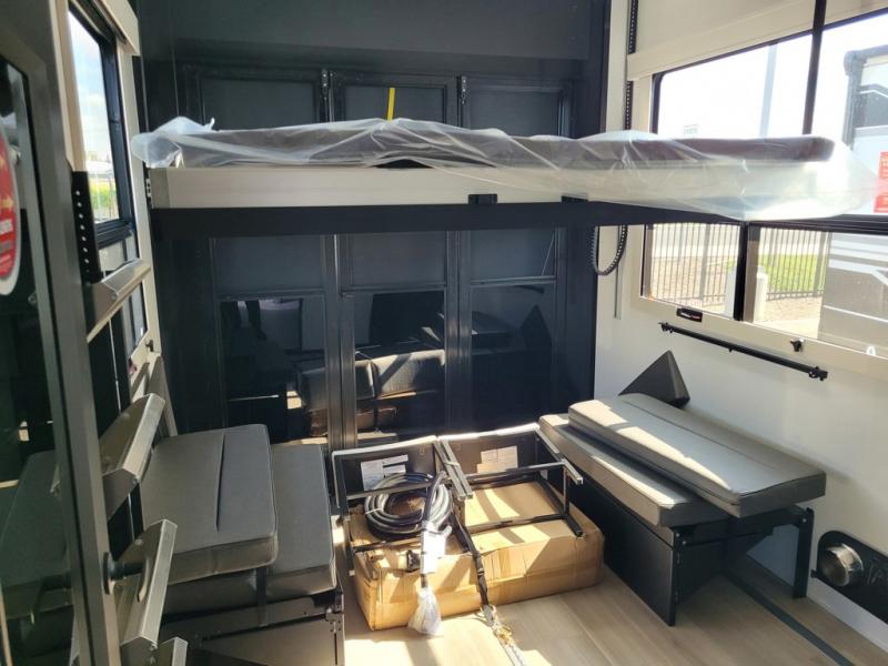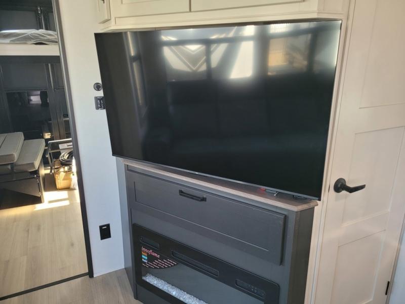 Traveling with friends and family can be comfortable when you have a full double entry bathroom and a half bath available when camping and enjoying the trails on your off-road toys! You will have an 11' garage space that can become a second living/dining area, and you can add the optional Liftsuite System for more sleeping space. An overhead bed comes standard, along with a super sofa in the main living area where guests can sleep. Everyone can watch the LED TV when waiting for dinner, and enjoy the fireplace on those chiller nights. The kitchen island offers a sink to wash dishes, extra counter space for serving meals and two stools to dine at. The cook will love all the upgraded appliances, and the space thanks to the slide. The front bedroom gives you a queen bed slide with a king bed option, lots of clothing space, and a slide top dresser for even more storage.