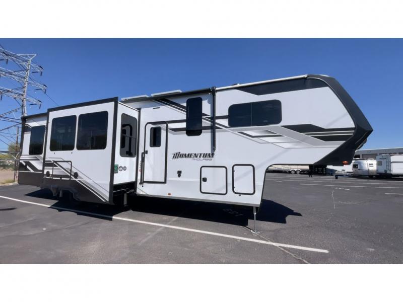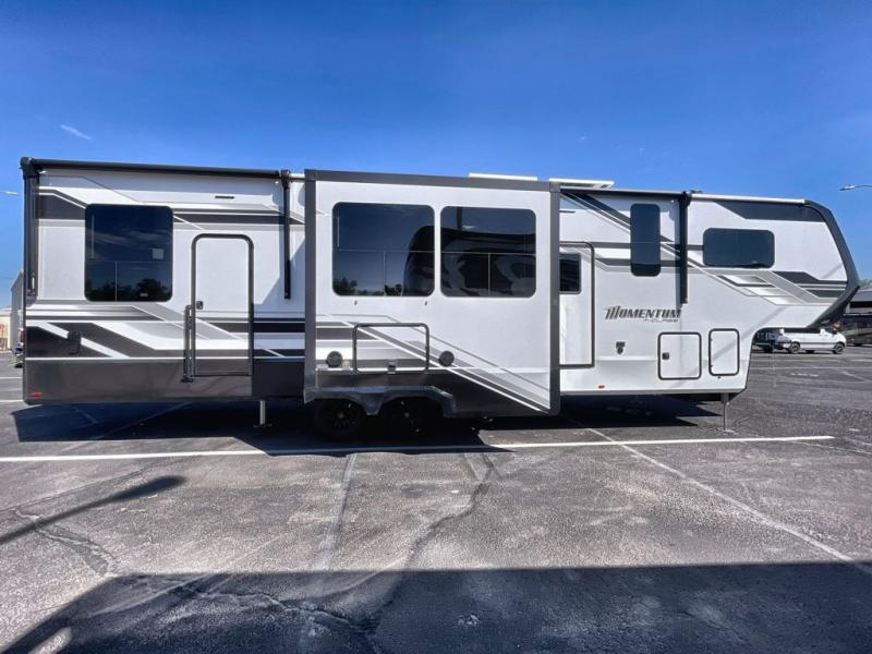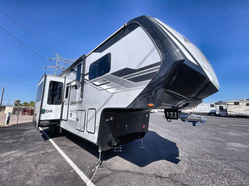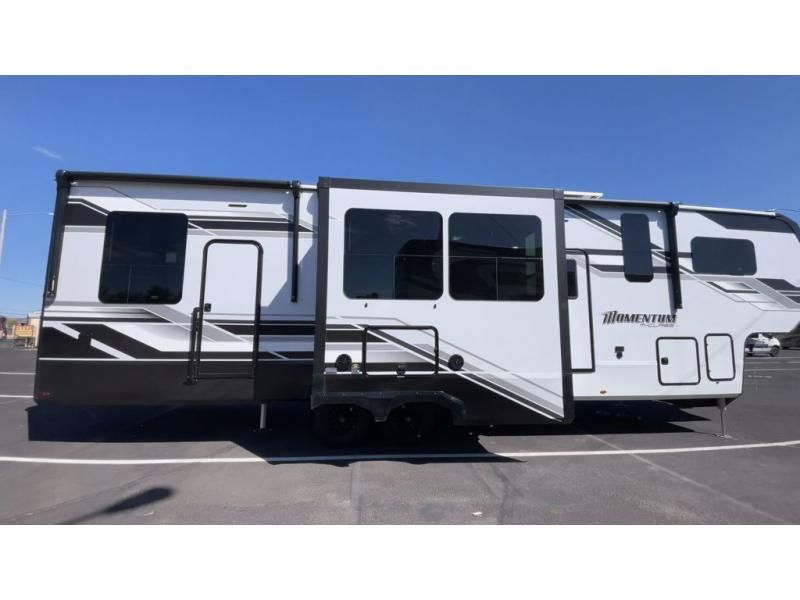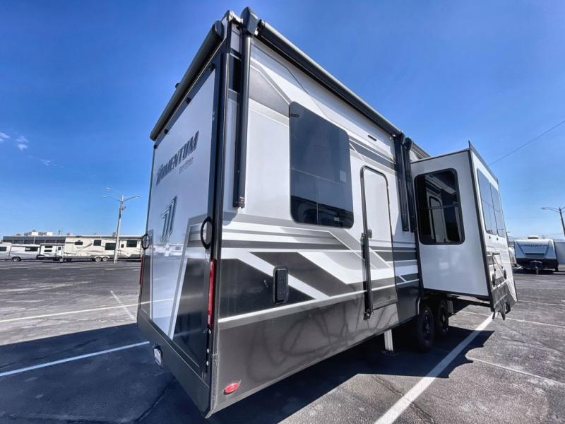 The Momentum fifth wheel toy haulers by Grand Design are built for four seasons of travel with your off-road toys and include luxurious accommodations throughout for extreme living! Each is constructed to a superior standard with the fully enclosed and heated underbelly and storage area, the 5-sided aluminum cage, and the triple insulated garage floor. The MORryde CRE3000 suspension system and rubber pin box, plus the upgraded axle hangers provide the performance and smooth towing you desire, while the interior offers luxury such as color changing LED accent lighting, hardwood cabinet doors with hidden hinges, and a central vacuum system. Each toy hauler also includes four packages, including the Garage Package with Tuff-Ply gas and oil-resistant flooring, the Weather-Tek Package with a Stealth AC System, and the Interior Luxury Package with solid surface countertops!