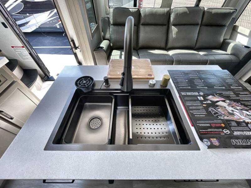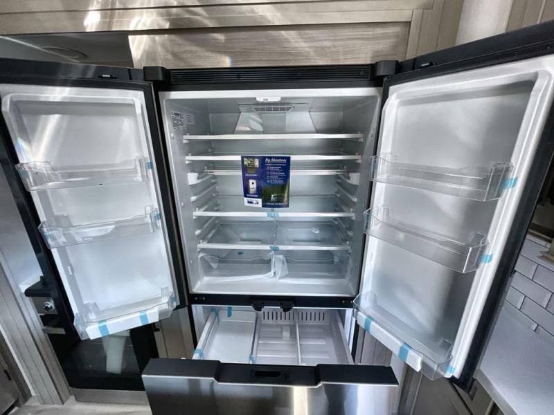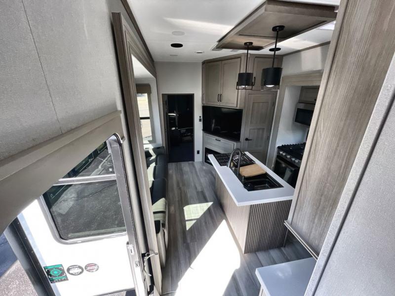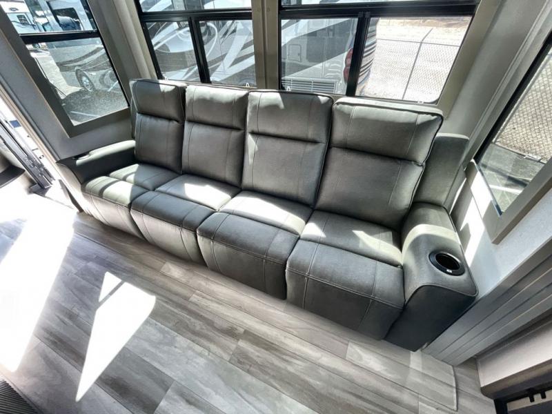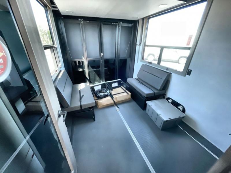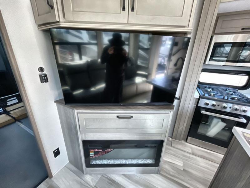 Traveling with friends and family can be comfortable when you have a full double entry bathroom and a half bath available when camping and enjoying the trails on your off-road toys! You will have an 11' garage space that can become a second living/dining area. An overhead bed comes standard, along with a super sofa in the main living area where guests can sleep. Everyone can watch the LED TV when waiting for dinner and enjoy the fireplace on those chiller nights. The kitchen island offers a sink to wash dishes, extra counter space for serving meals and two stools to dine at. The cook will love all the upgraded appliances, and the space thanks to the slide. The front bedroom gives you a queen bed slide with a king bed option, lots of clothing space, and a slide top dresser for even more storage.