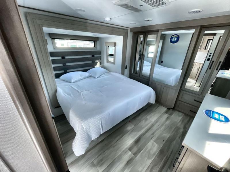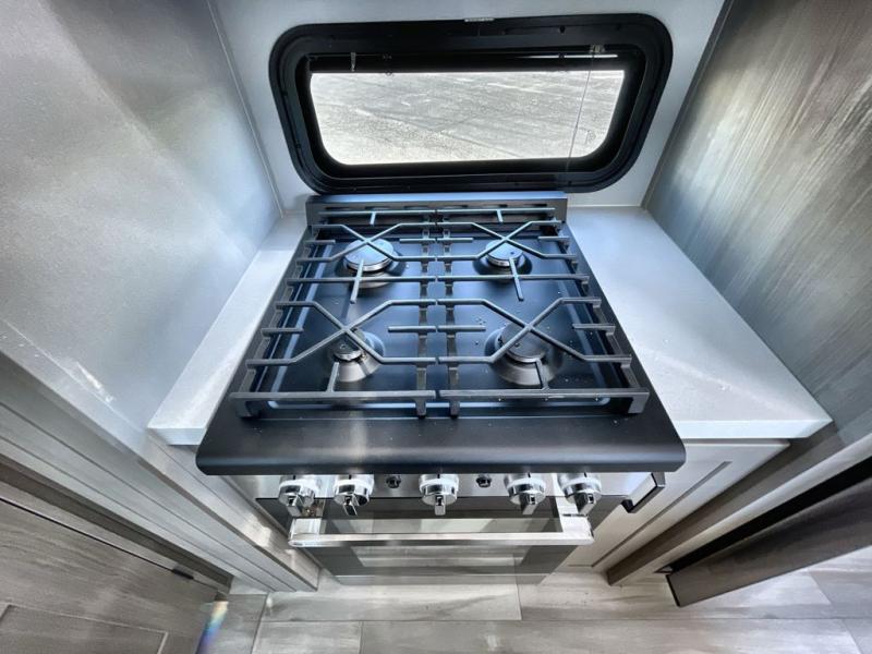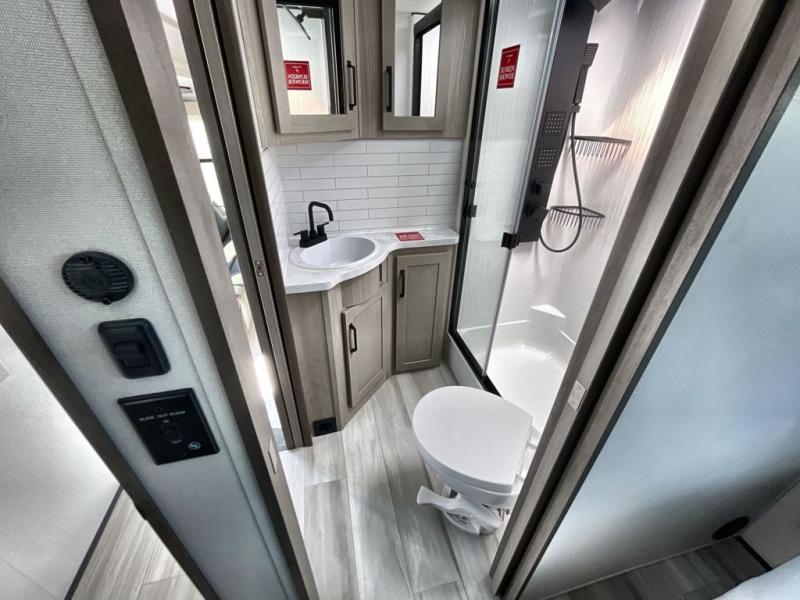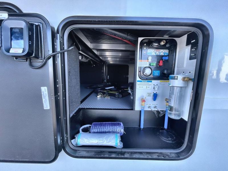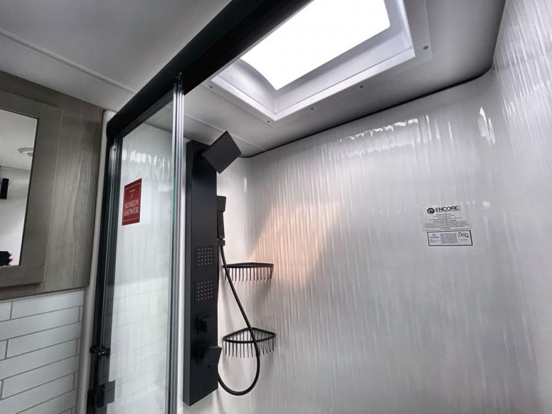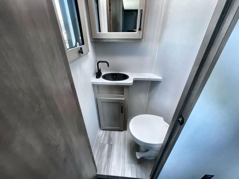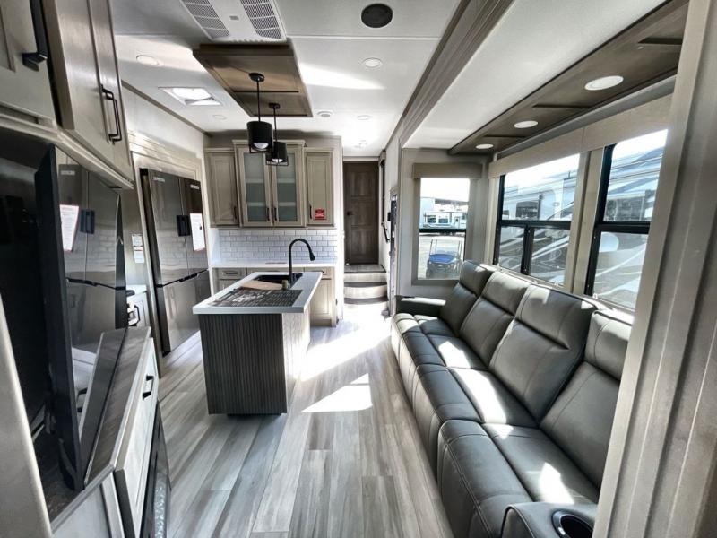 Traveling with friends and family can be comfortable when you have a full double entry bathroom and a half bath available when camping and enjoying the trails on your off-road toys! You will have an 11' garage space that can become a second living/dining area. An overhead bed comes standard, along with a super sofa in the main living area where guests can sleep. Everyone can watch the LED TV when waiting for dinner and enjoy the fireplace on those chiller nights. The kitchen island offers a sink to wash dishes, extra counter space for serving meals and two stools to dine at. The cook will love all the upgraded appliances, and the space thanks to the slide. The front bedroom gives you a queen bed slide with a king bed option, lots of clothing space, and a slide top dresser for even more storage.