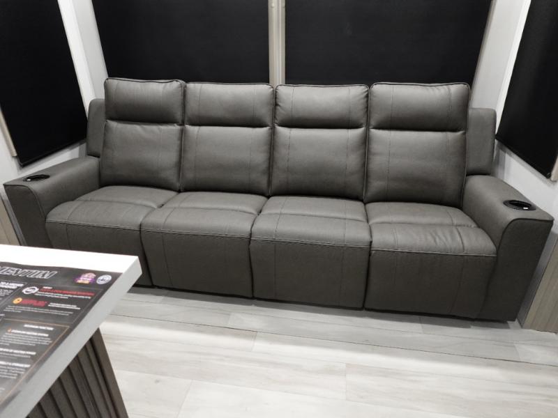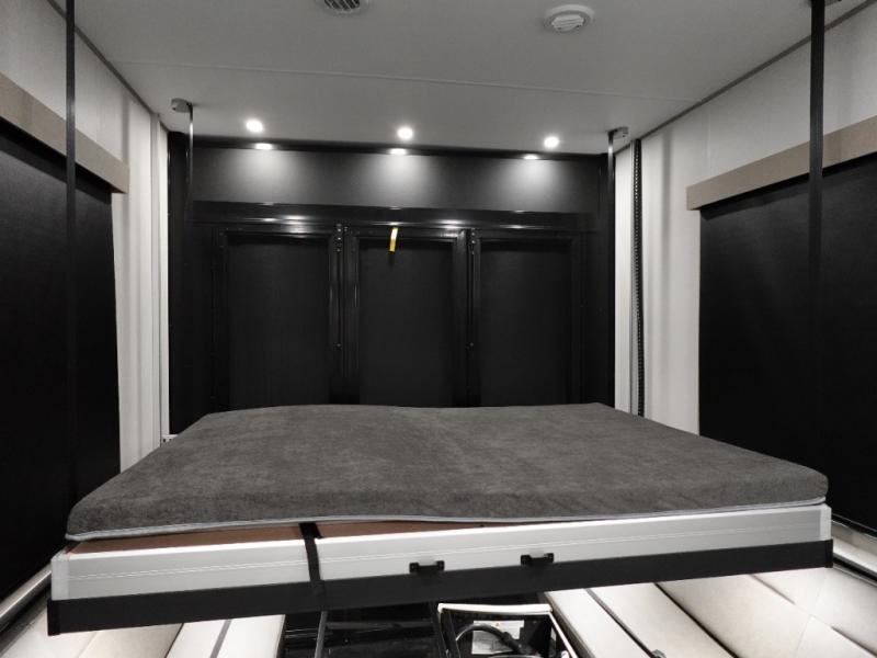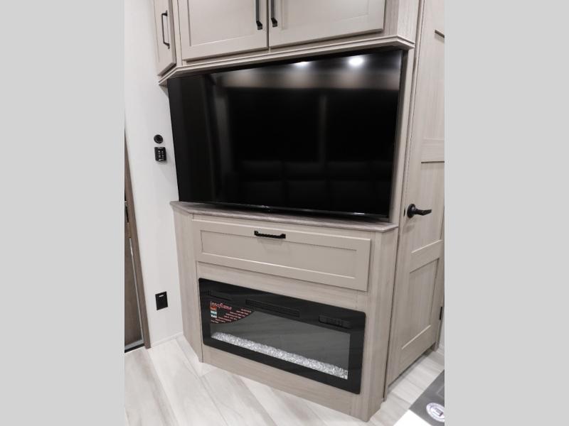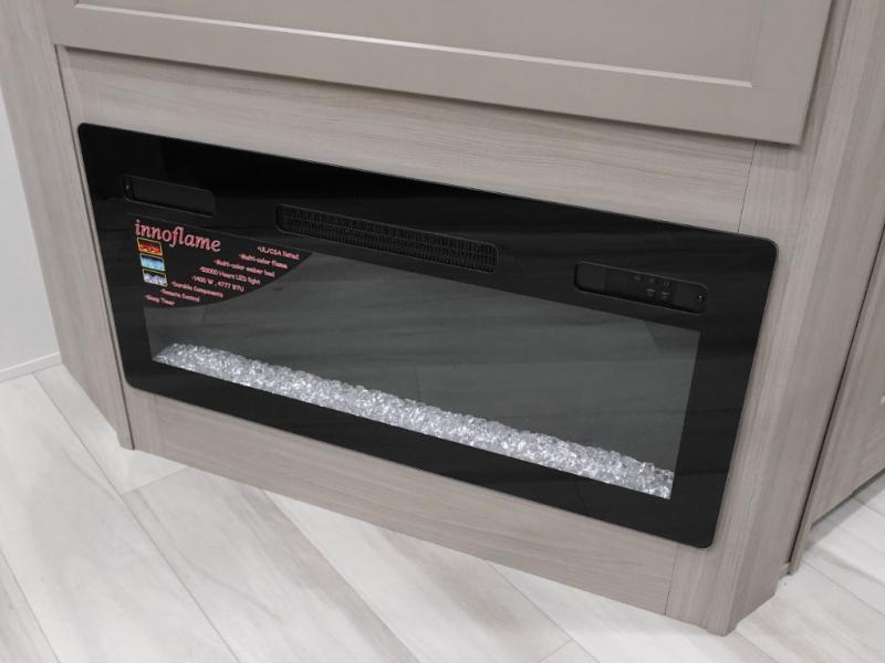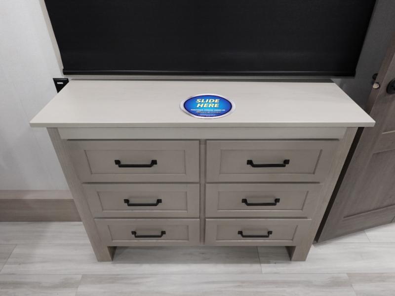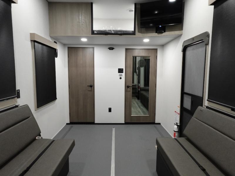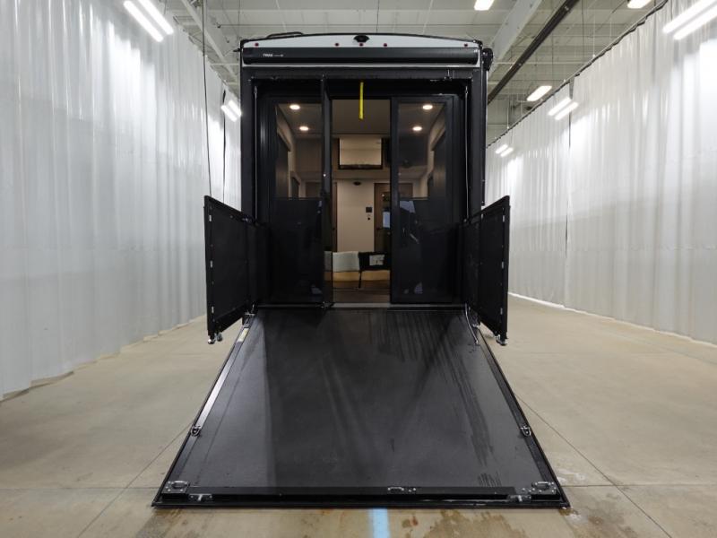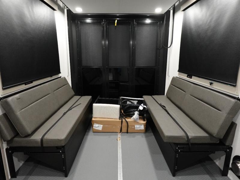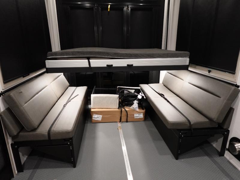 Traveling with friends and family can be comfortable when you have a full double entry bathroom and a half bath available when camping and enjoying the trails on your off-road toys! You will have an 15' garage space that can become a second living/dining area as well as a bedroom if you add the optional Liftsuite System. There is an overhead loft bed and a four-seat sofa slide for more sleeping space in the main living area. Everyone can watch the LED TV when waiting for dinner, and enjoy the fireplace on those chiller nights. The kitchen island offers a sink to wash dishes, extra counter space for serving meals and two stools to dine at. The cook will love all the upgraded appliances and the space thanks to the slide. The front bedroom gives you a queen bed slide with a king bed option, lots of clothing space, and a slide top dresser for even more storage.