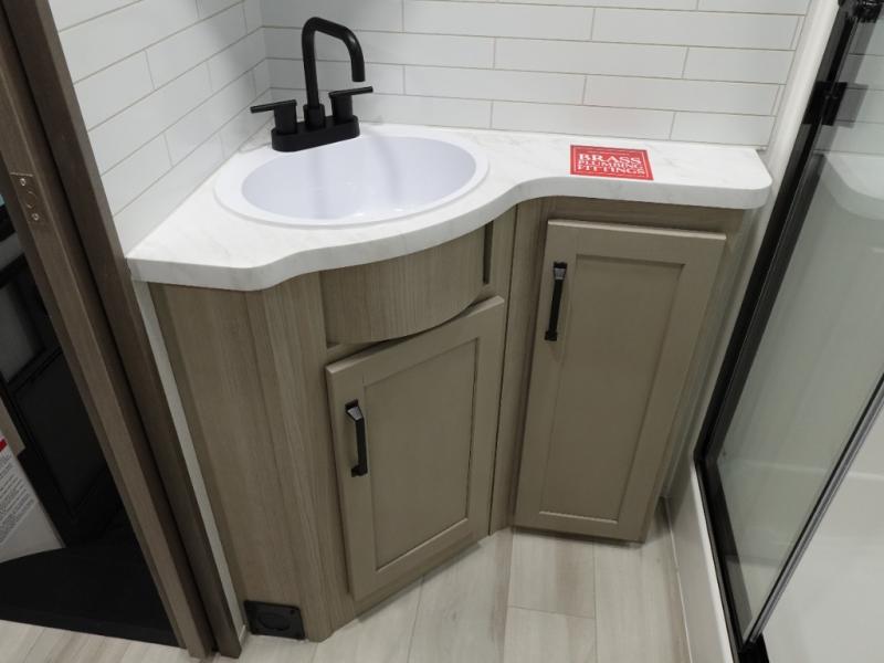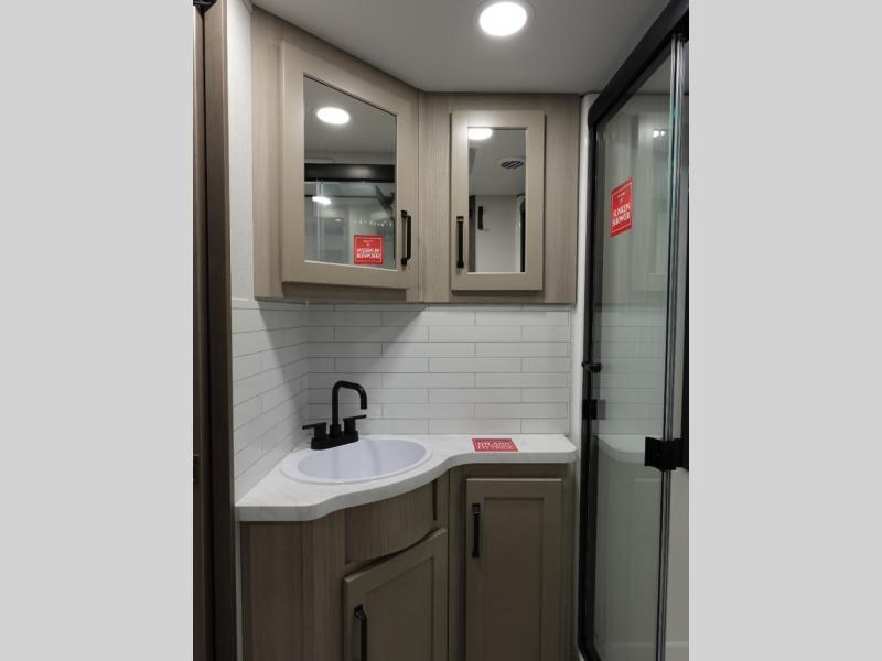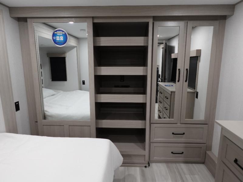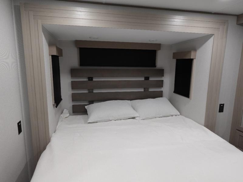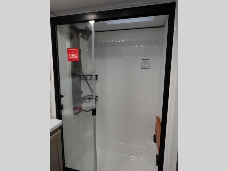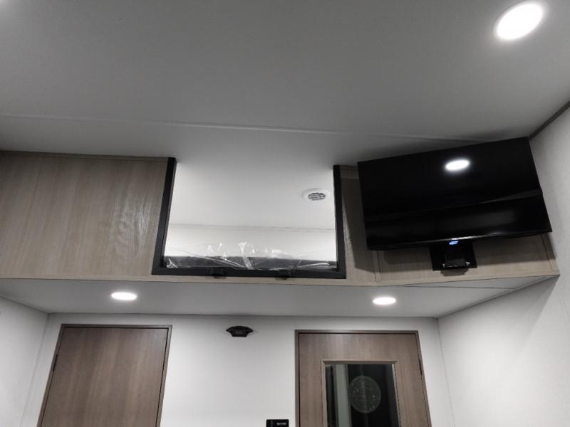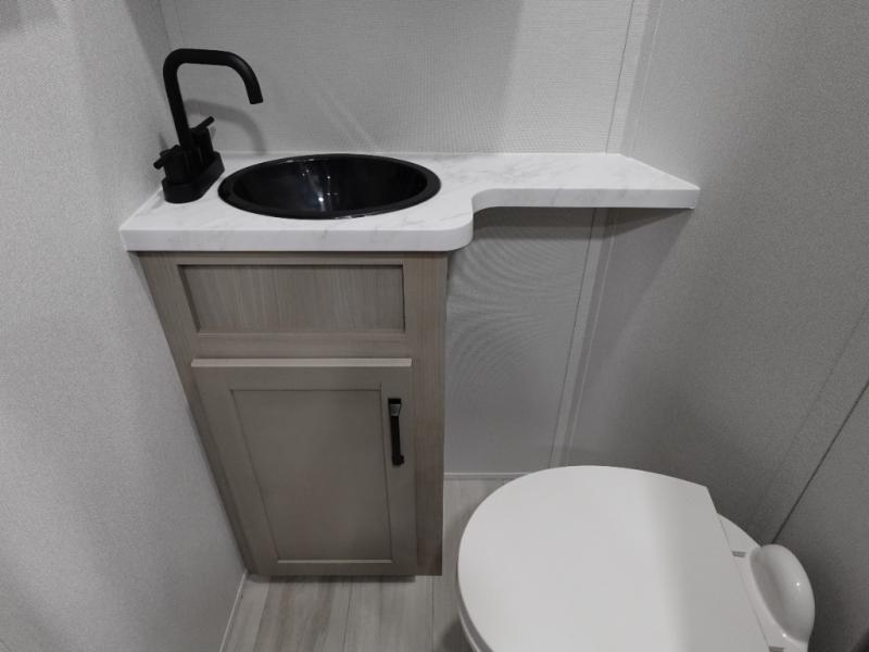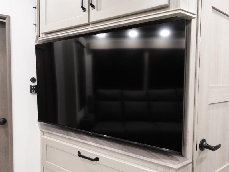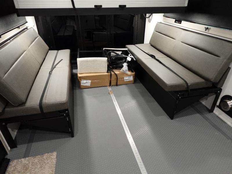 Traveling with friends and family can be comfortable when you have a full double entry bathroom and a half bath available when camping and enjoying the trails on your off-road toys! You will have an 15' garage space that can become a second living/dining area as well as a bedroom if you add the optional Liftsuite System. There is an overhead loft bed and a four-seat sofa slide for more sleeping space in the main living area. Everyone can watch the LED TV when waiting for dinner, and enjoy the fireplace on those chiller nights. The kitchen island offers a sink to wash dishes, extra counter space for serving meals and two stools to dine at. The cook will love all the upgraded appliances and the space thanks to the slide. The front bedroom gives you a queen bed slide with a king bed option, lots of clothing space, and a slide top dresser for even more storage.