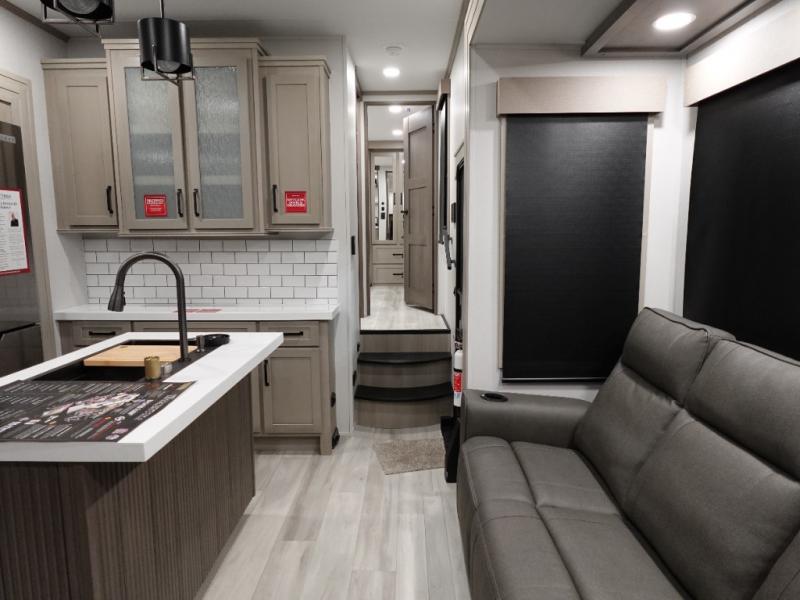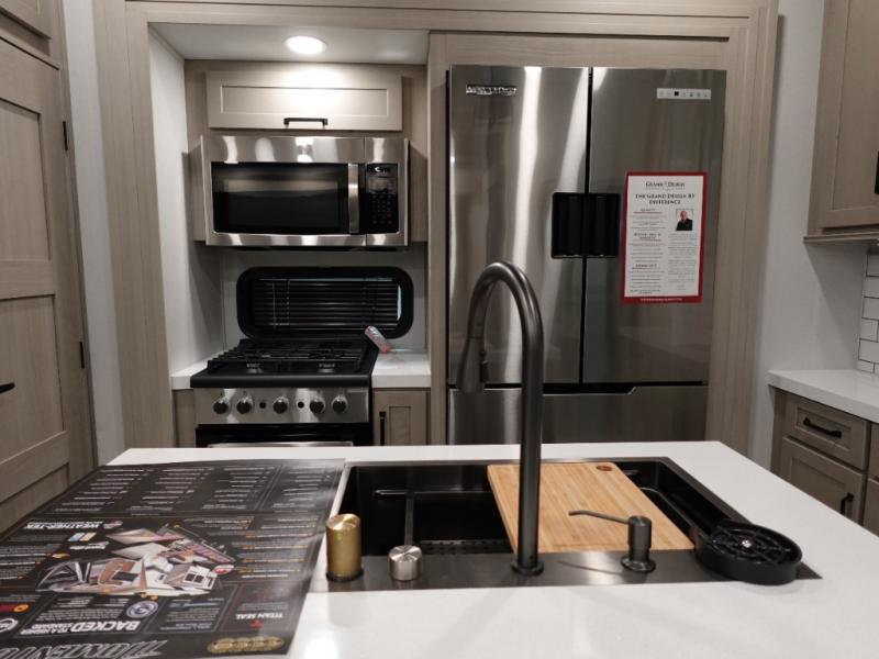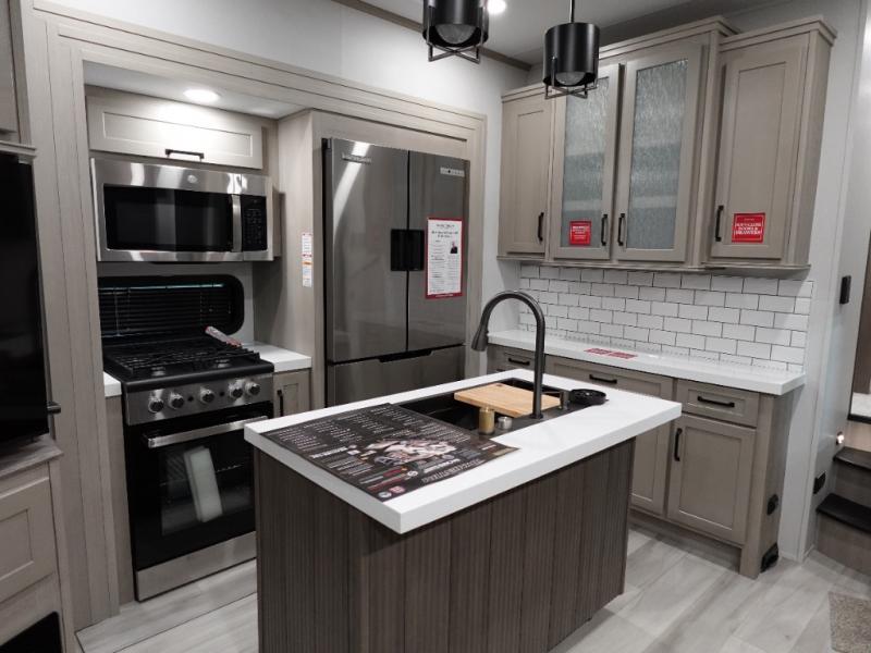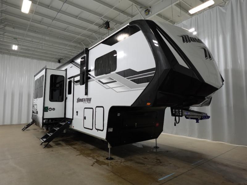 With any Momentum M-Class toy hauler by Grand Design, you will enjoy luxury at every turn! They have been constructed to a superior standard with a thermal roof design, triple insulated main floor and garage floor, and a Rail-Tite underbelly seal that will allow you to camp in all elements. Each model also features an 8' 5" wide body chassis with a wide rail design, no wheel wheels, and a dovetail entry for easier loading. The Stealth A/C system provides maximum cooling power, and the CRE3000 suspension system means you can enjoy a smooth tow each time. You will love the luxurious interior with a professional grade stainless steel cooktop, interior color changing LED accent lighting, a fiberglass shower with a glass door, and solid surface countertops.