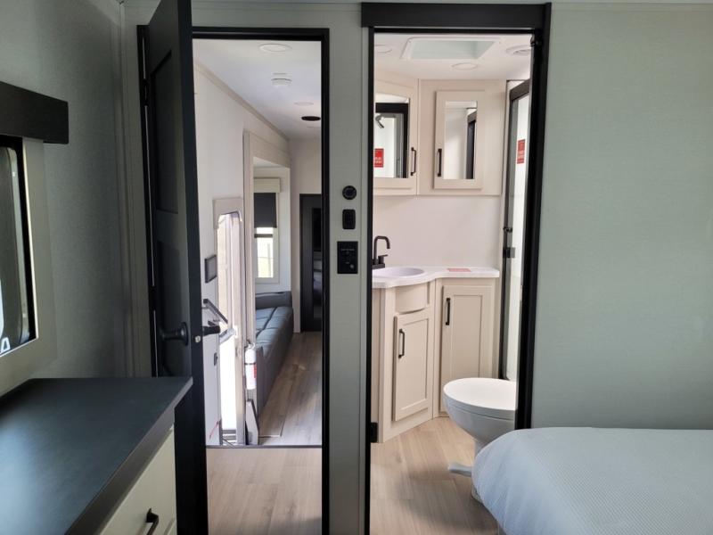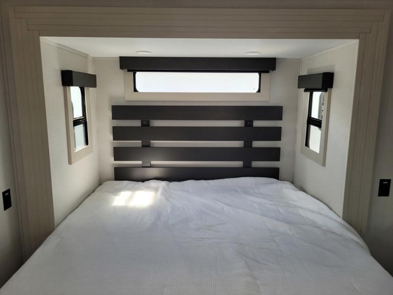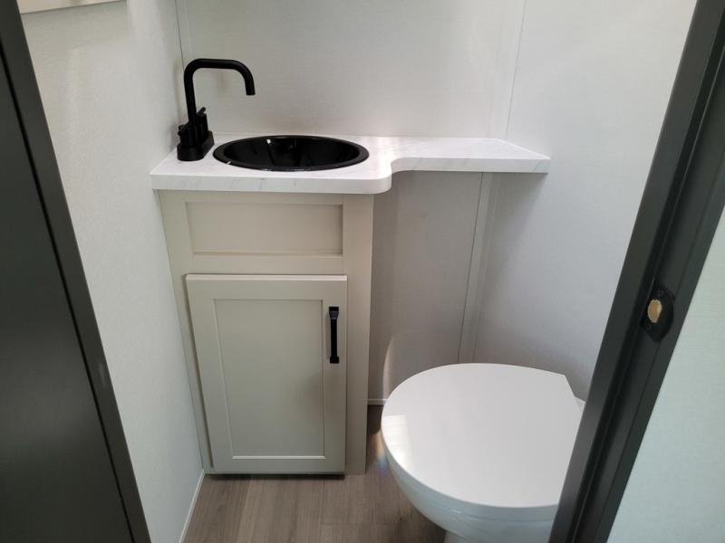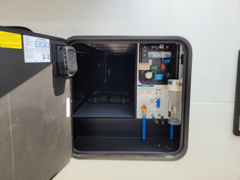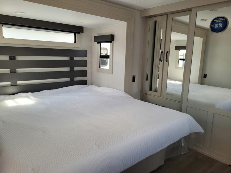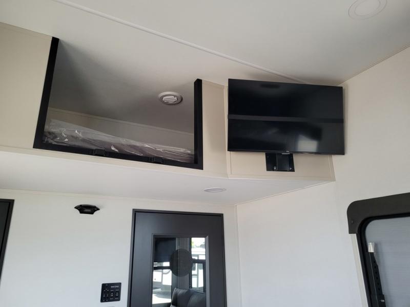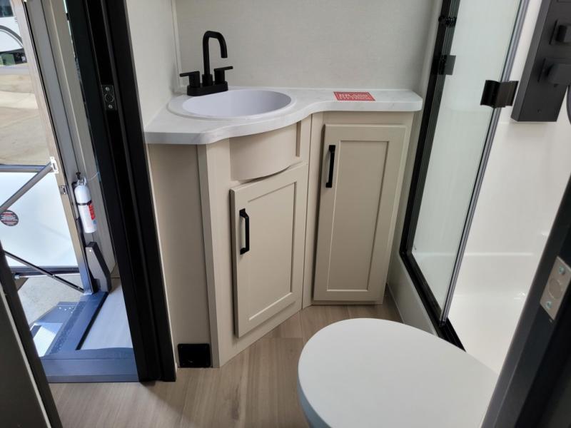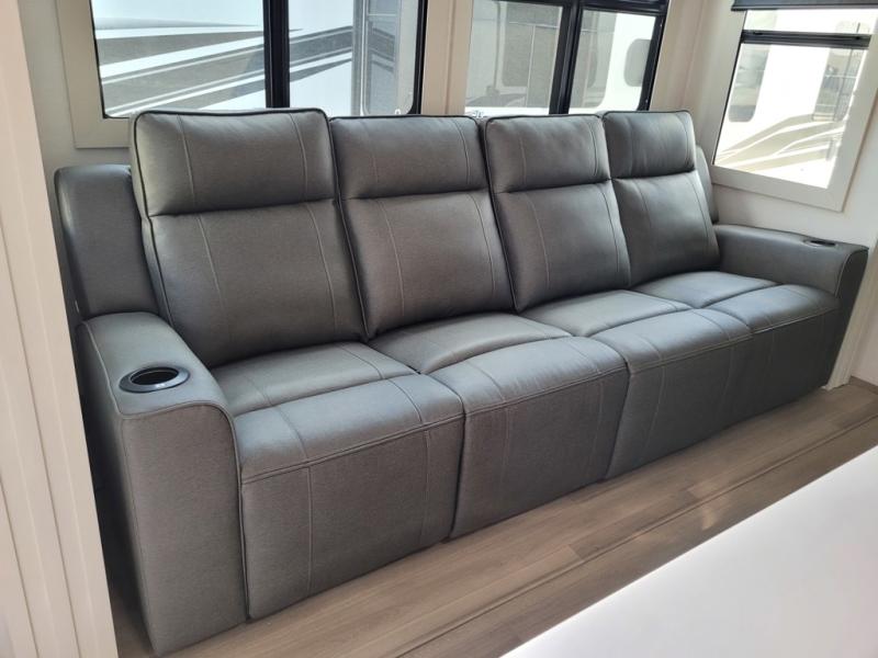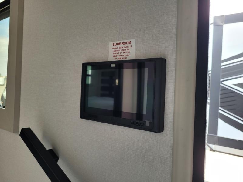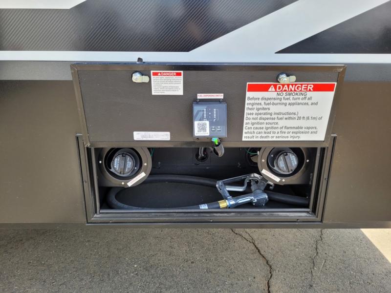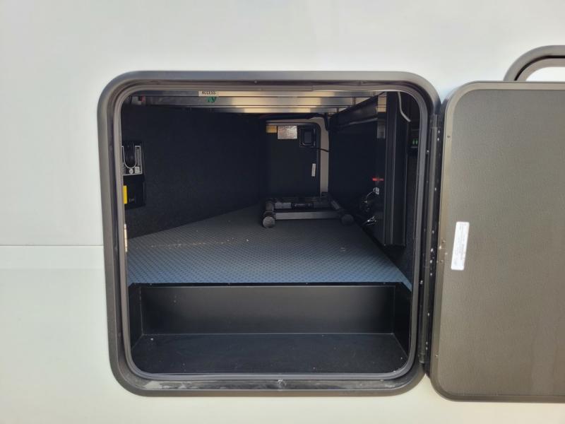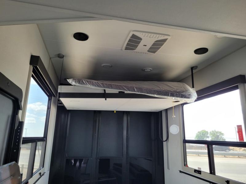 Traveling with friends and family can be comfortable when you have a full double entry bathroom and a half bath available when camping and enjoying the trails on your off-road toys! You will have an 15' garage space that can become a second living/dining area as well as a bedroom if you add the optional Liftsuite System. There is an overhead loft bed and a four-seat sofa slide for more sleeping space in the main living area. Everyone can watch the LED TV when waiting for dinner, and enjoy the fireplace on those chiller nights. The kitchen island offers a sink to wash dishes, extra counter space for serving meals and two stools to dine at. The cook will love all the upgraded appliances and the space thanks to the slide. The front bedroom gives you a queen bed slide with a king bed option, lots of clothing space, and a slide top dresser for even more storage.