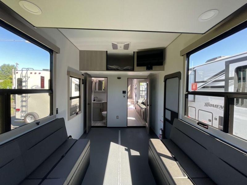 Built for extreme living, the Momentum 381MS features a fully enclosed and heated underbelly, 5-sided aluminum cage construction, triple-insulated garage floor, and MORryde CRE3000 suspension for smooth towing and superior durability. Luxurious interior touches include color-changing LED lighting, hardwood cabinet doors, central vacuum, and premium solid surface countertops.