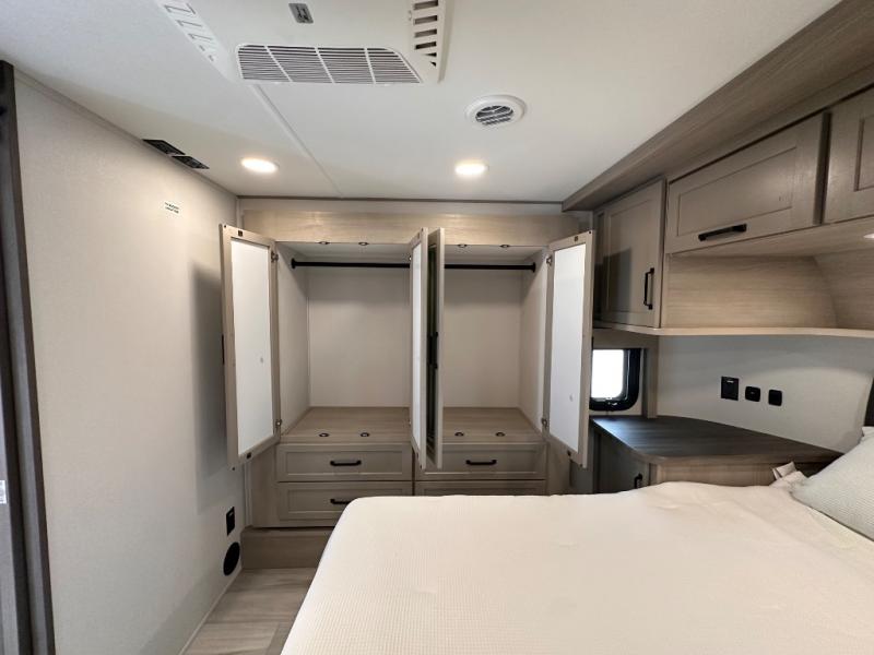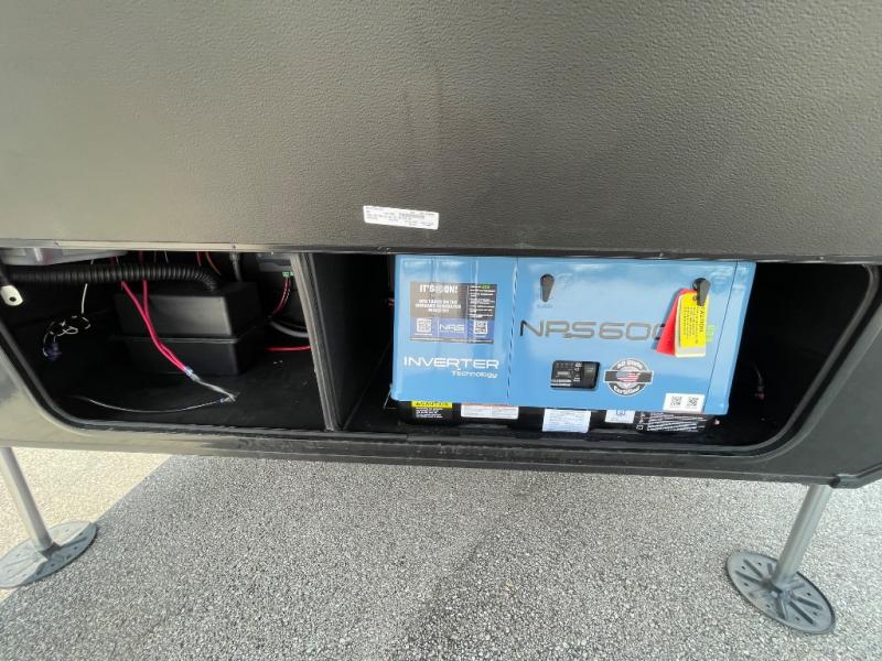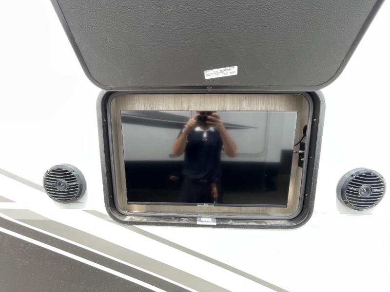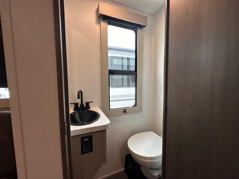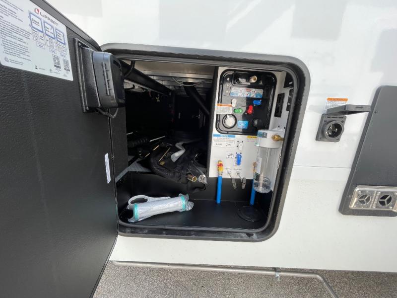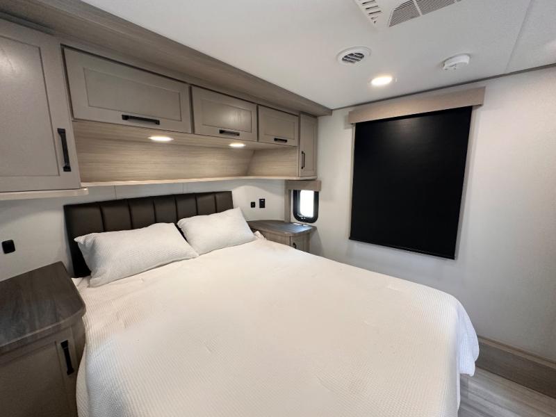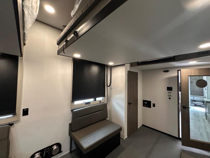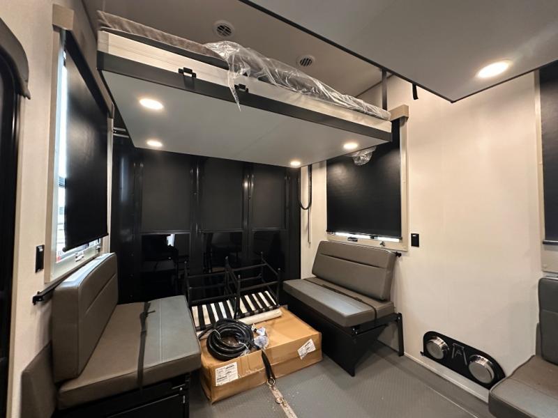 This toy hauler with a 17' separate garage will be perfect for your outdoor adventures. There is an adjustable tie-down system to keep your gear secure, an overhead loft bed, plus an optional half bath. And two optional Liftsuite Systems can be added if you need more sleeping space. There is also washer and dryer prep here, along with a flip-up pet dish for your furry friends. The chef will love the large kitchen countertop for more meal prep space, and there is a 20 cu. ft. refrigerator and pantry for food storage. You can get comfy on the L-shaped sofa across from the 50" TV, or get some work done at the hybrid desk/dinette. There are also dual opposing slides here for added space. The third slide out is found in the front master bedroom, which includes drawers and storage space for your things. A queen bed will provide a great night's rest, and you have the option to choose a king bed if you want more space to stretch out!