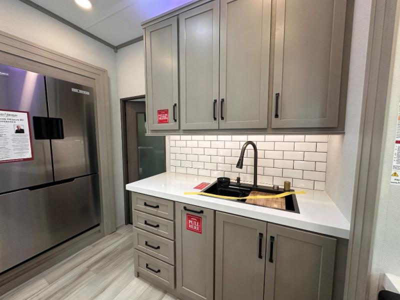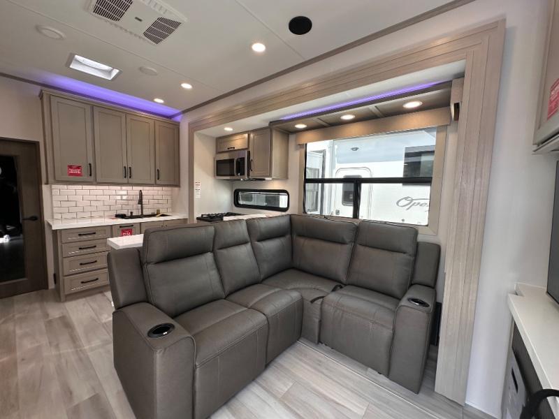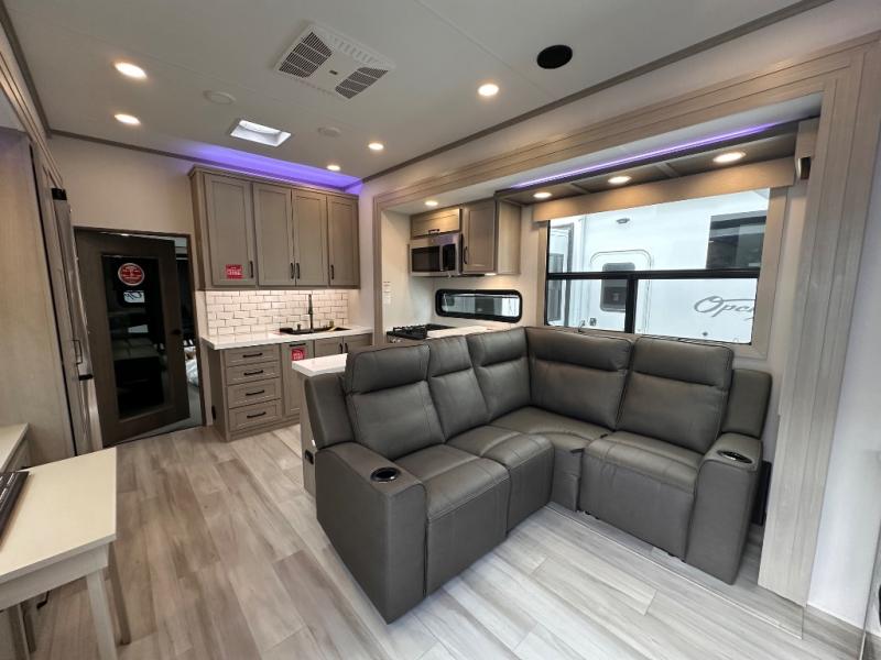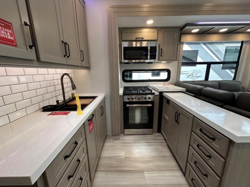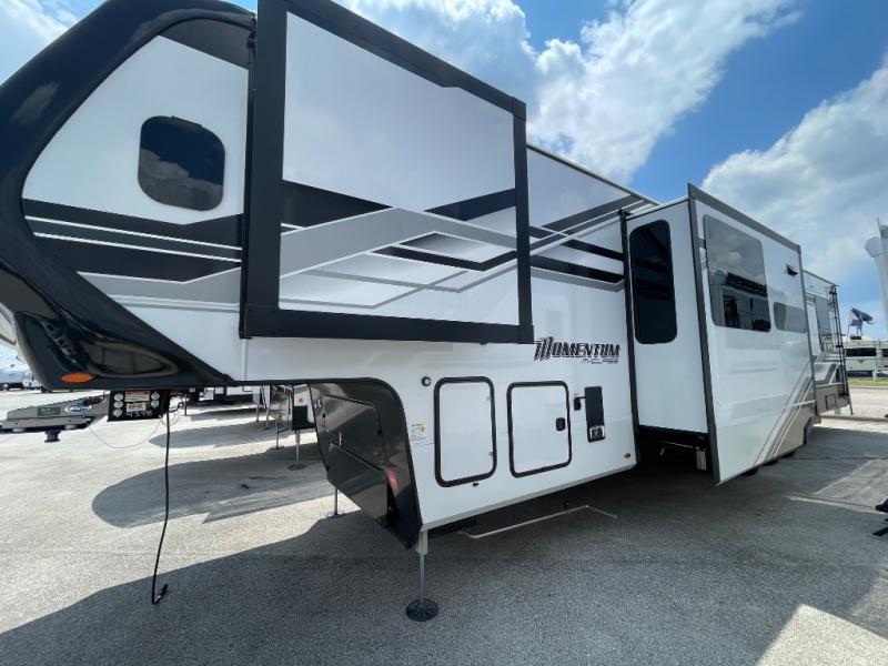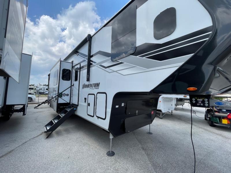 With any Momentum M-Class toy hauler by Grand Design, you will enjoy luxury at every turn! They have been constructed to a superior standard with a thermal roof design, triple insulated main floor and garage floor, and a Rail-Tite underbelly seal that will allow you to camp in all elements. Each model also features an 8' 5" wide body chassis with a wide rail design, no wheel wheels, and a dovetail entry for easier loading. The Stealth A/C system provides maximum cooling power, and the CRE3000 suspension system means you can enjoy a smooth tow each time. You will love the luxurious interior with a professional grade stainless steel cooktop, interior color changing LED accent lighting, a fiberglass shower with a glass door, and solid surface countertops.