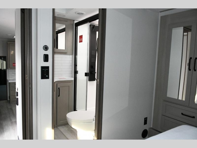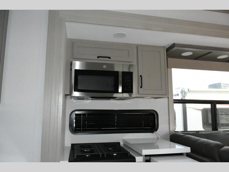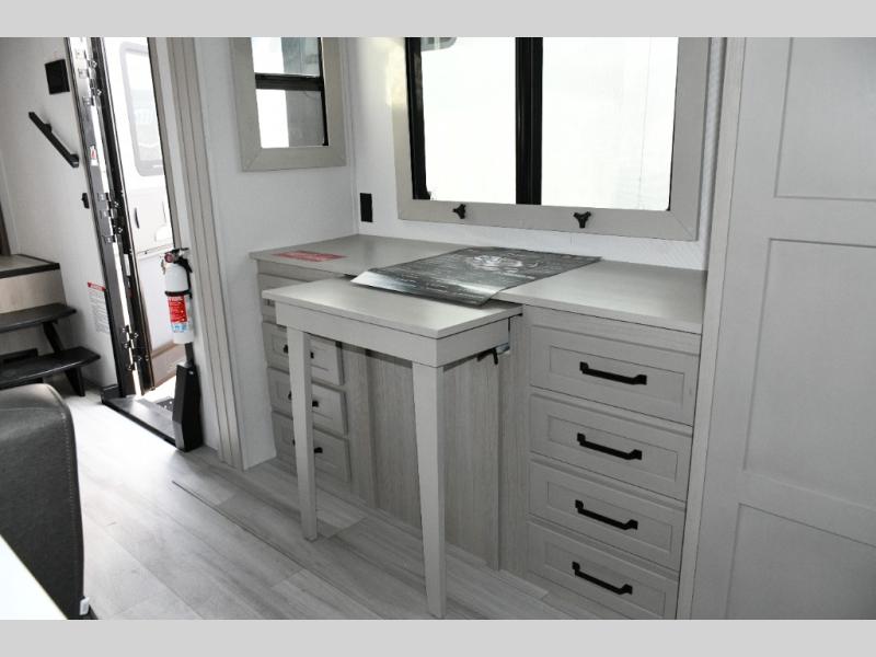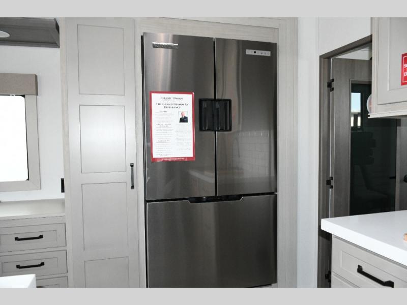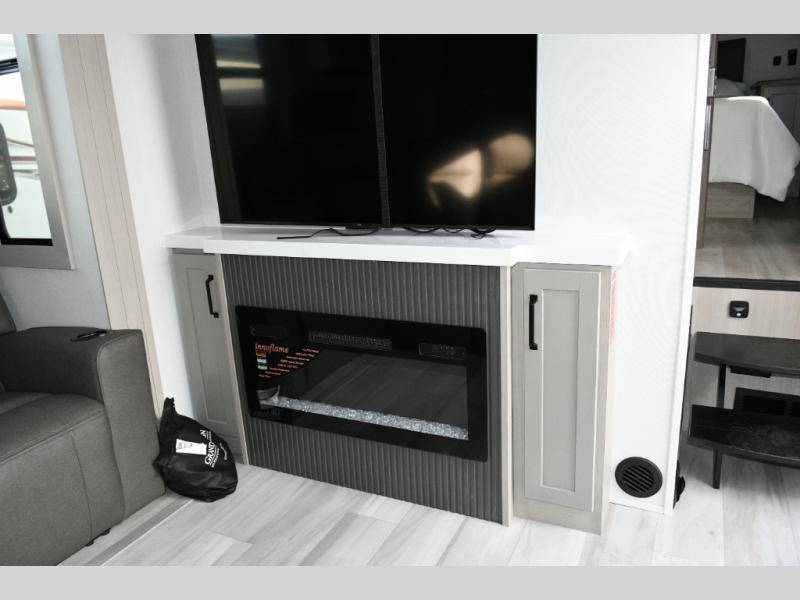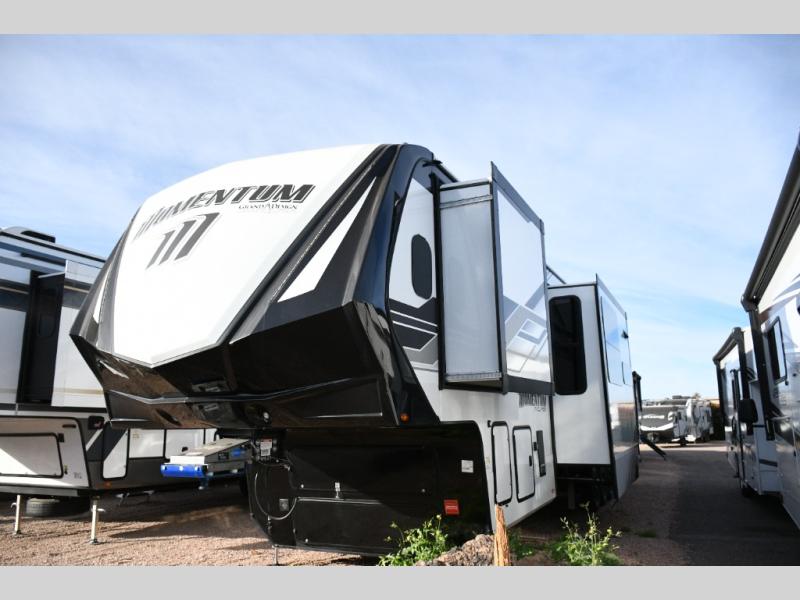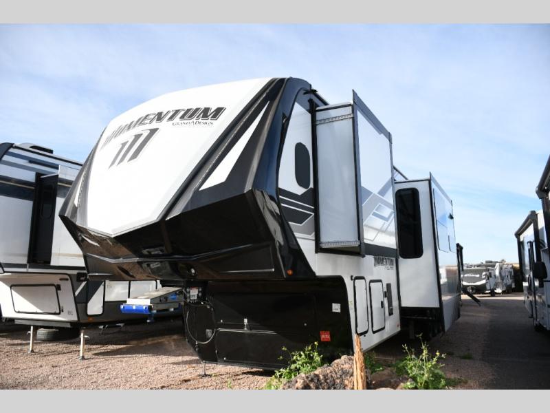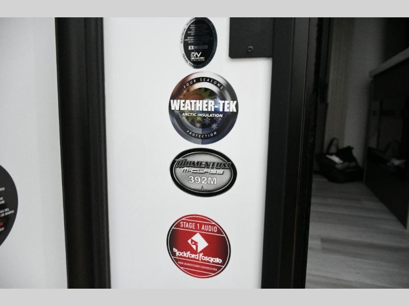 Built to handle rugged adventures and all-season travel, the Momentum 392M features a fully enclosed and heated underbelly, 5-sided aluminum cage, and Grand Design’s Weather-Tek Package with a Stealth A/C system. The MORryde CRE3000 suspension, rubber pin box, and upgraded axle hangers ensure confident towing and a smooth ride from pavement to trailhead. Inside, premium touches like solid surface countertops, hardwood cabinet doors with hidden hinges, color-changing LED accent lighting, and a central vacuum system elevate the experience.